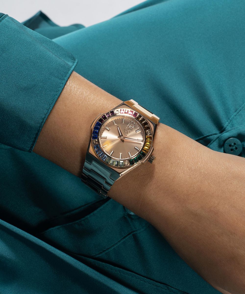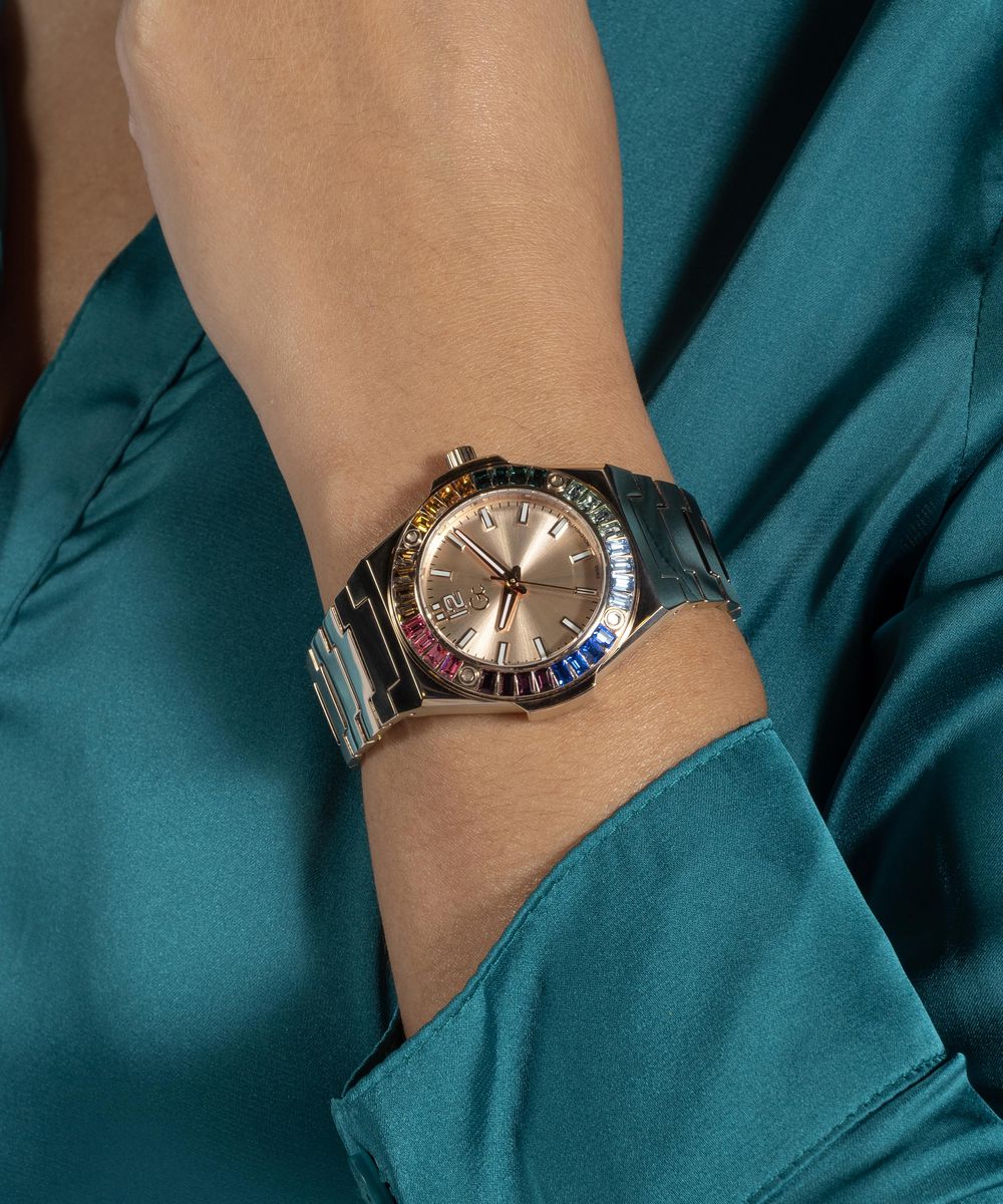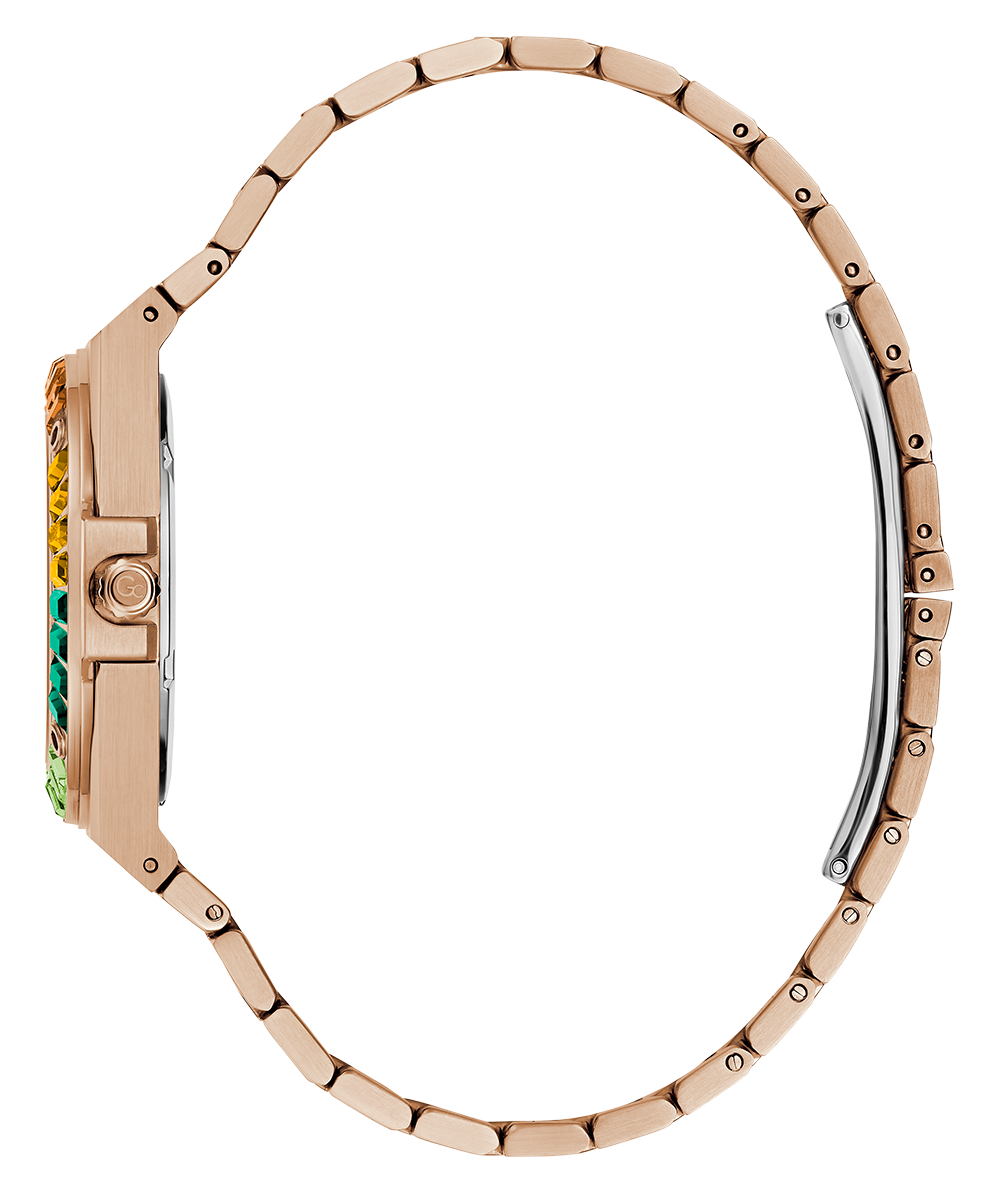 The Gc Idol hosts an integrated 34mm case with impressive baguette crystals, signature screws on the top ring and smooth bracelet in rose gold PVD, with highly stylish rainbow crystals and a soft rose-gold sunray dial.