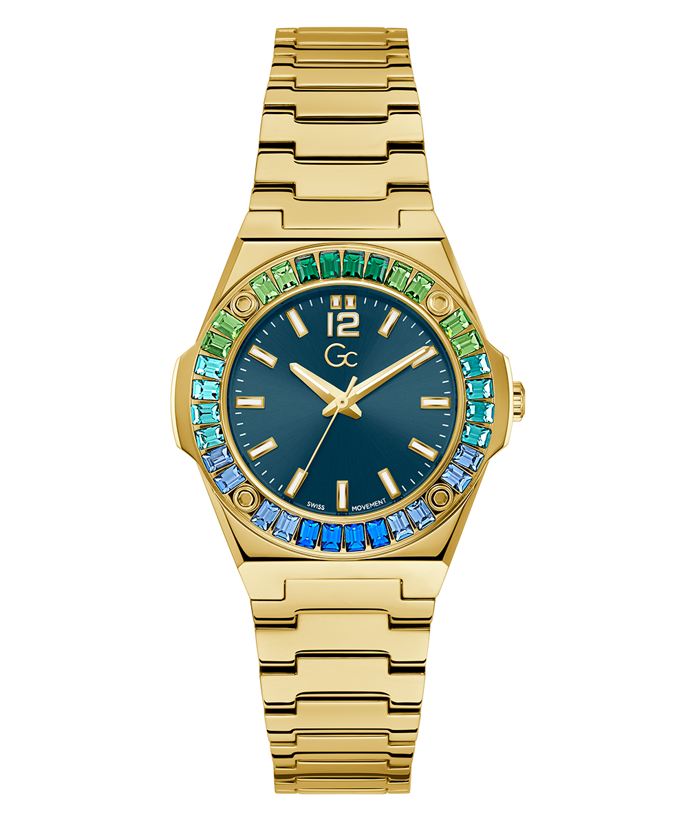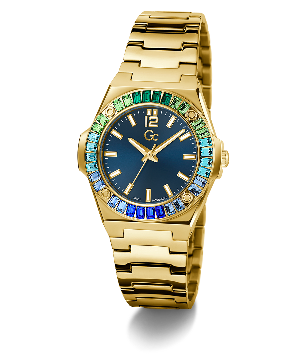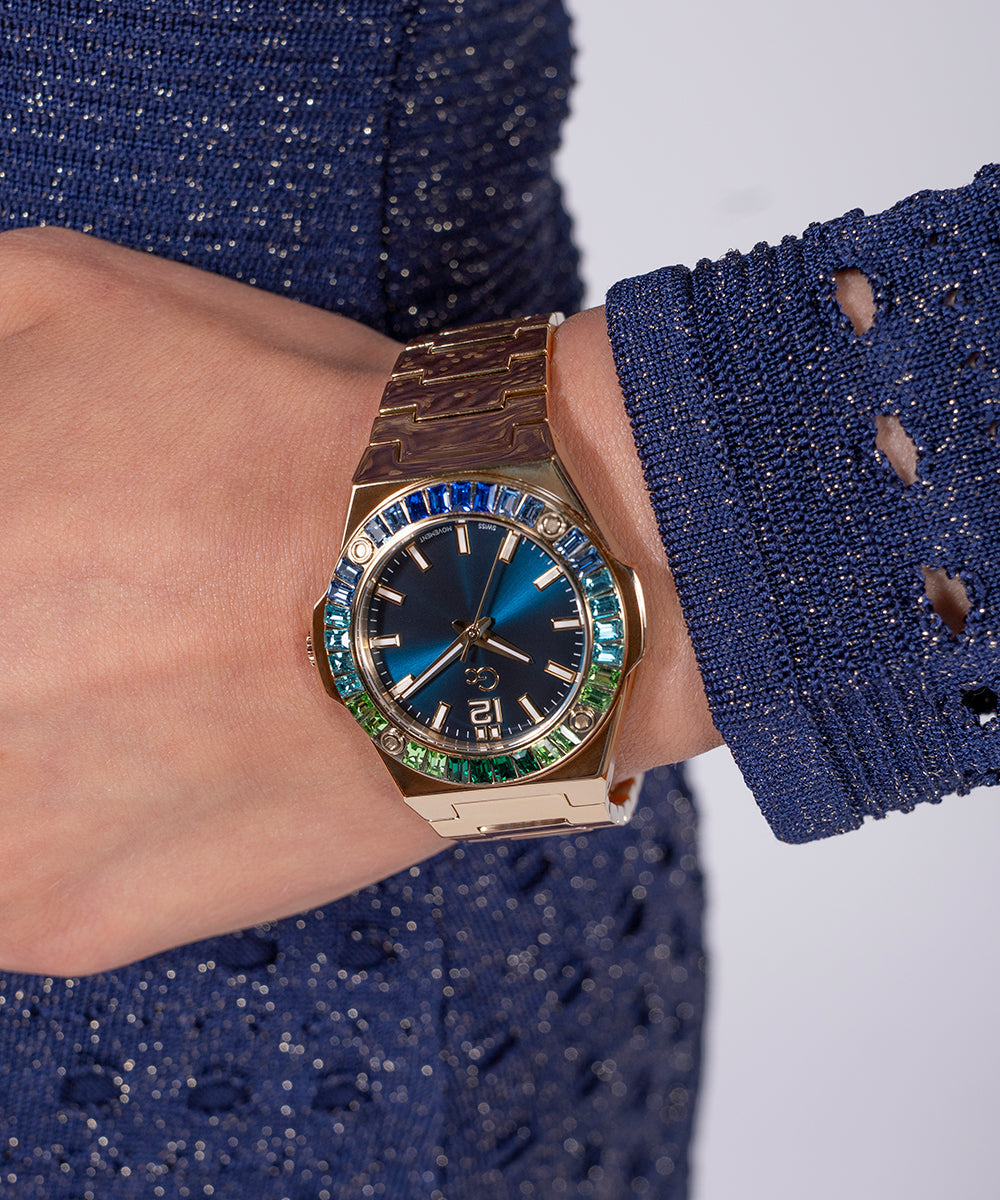 The Gc Idol hosts an integrated 34mm case with impressive baguette crystals, signature screws on the top ring and smooth bracelet in yellow gold PVD, with a superb set of exotic peacock green and blue crystals and a deep midnight blue sunray dial.