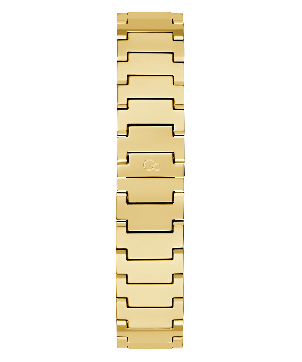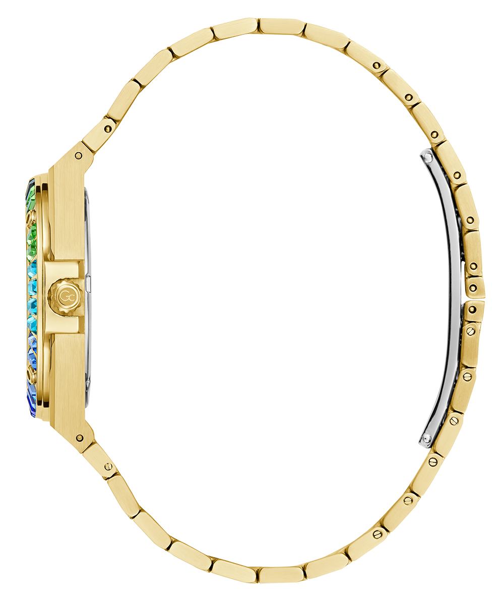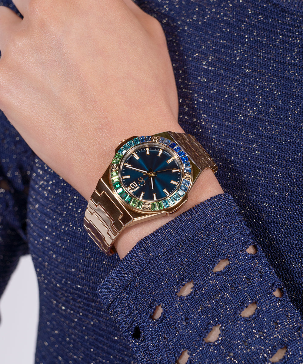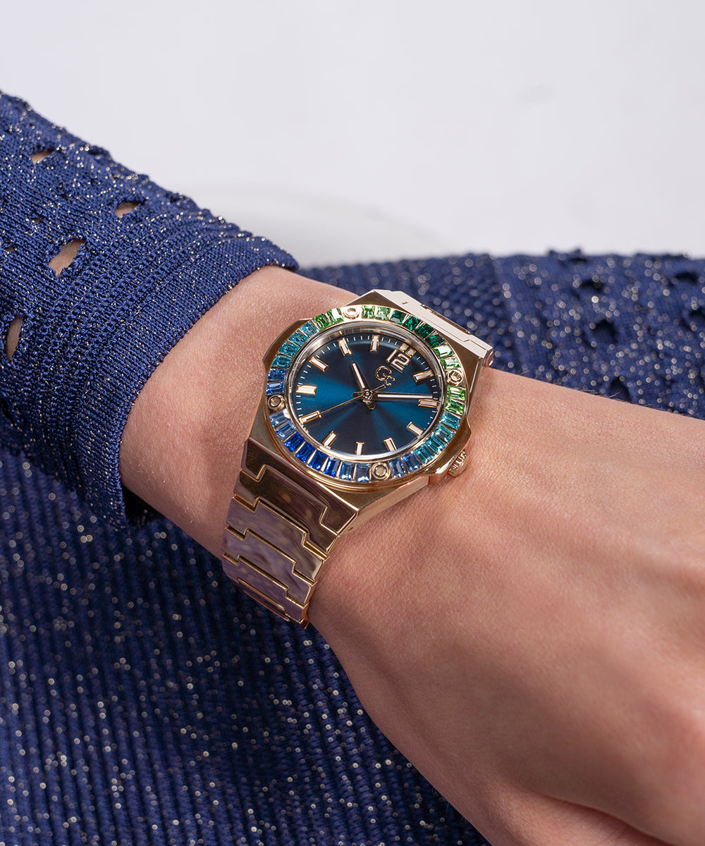 The Gc Idol hosts an integrated 34mm case with impressive baguette crystals, signature screws on the top ring and smooth bracelet in yellow gold PVD, with a superb set of exotic peacock green and blue crystals and a deep midnight blue sunray dial.