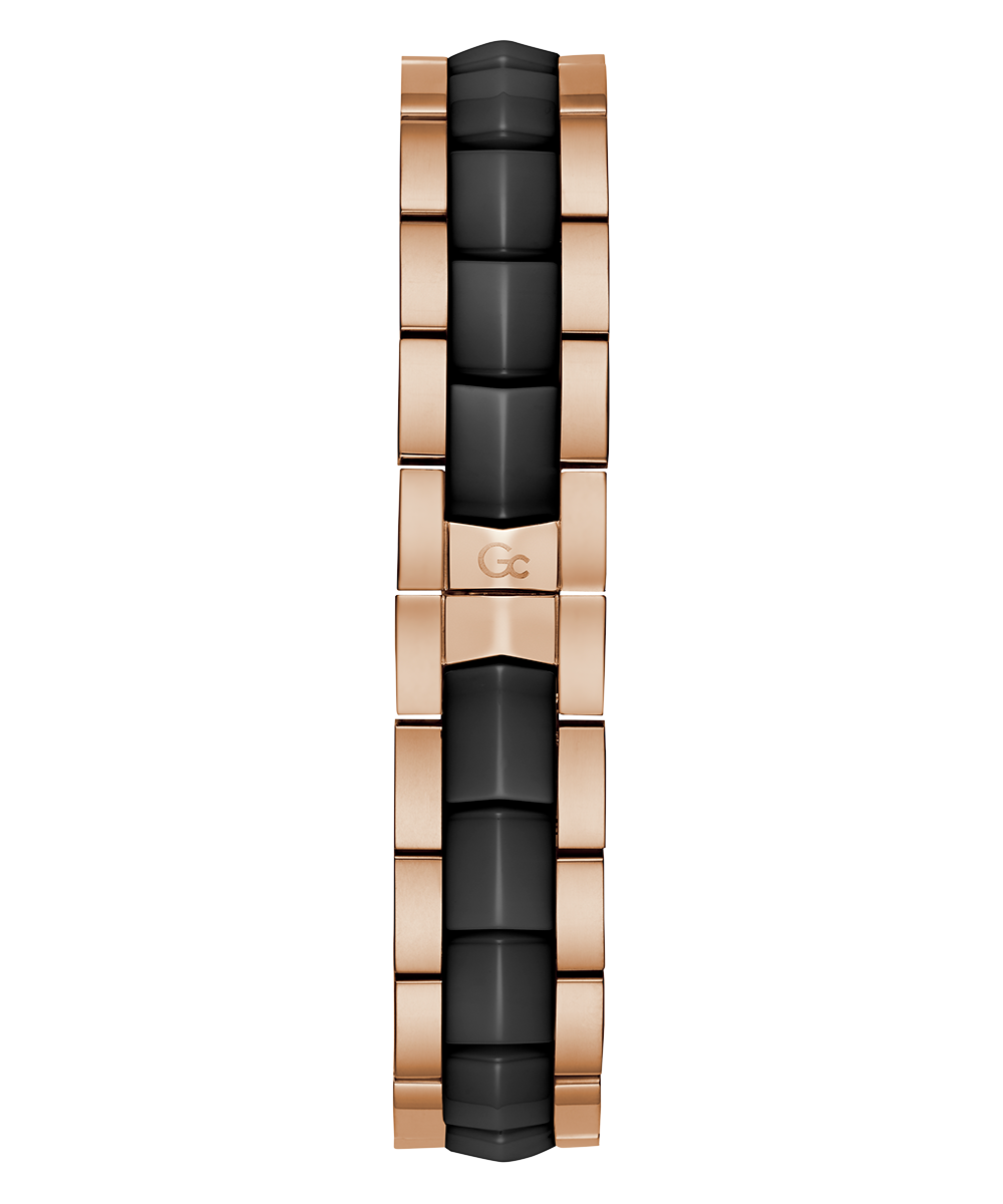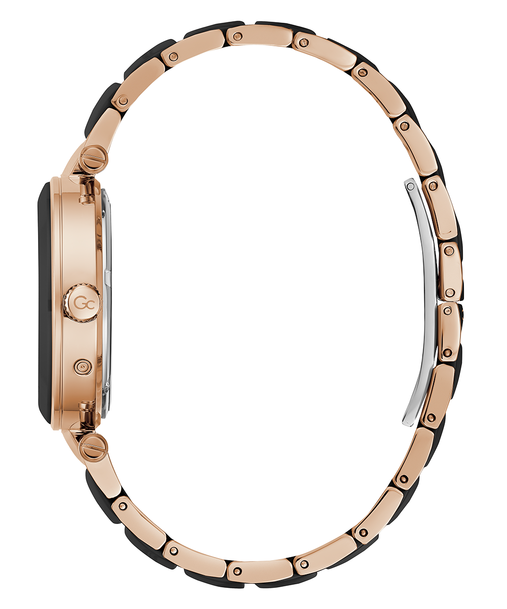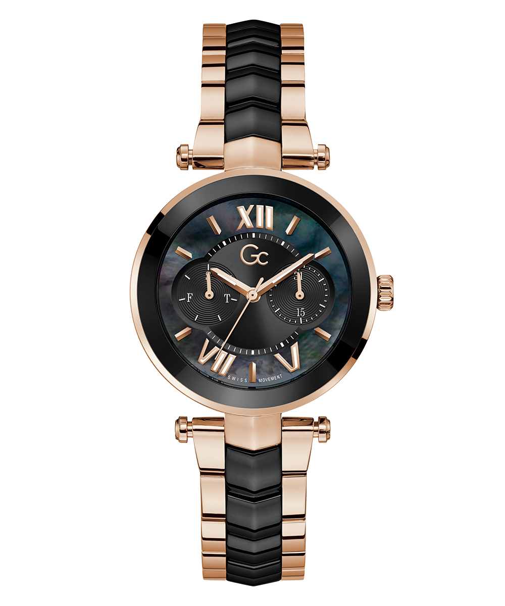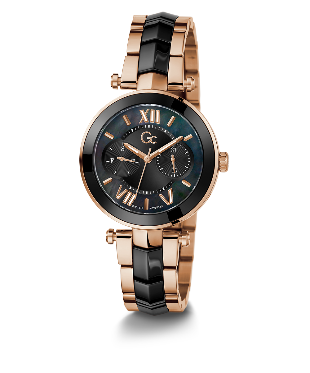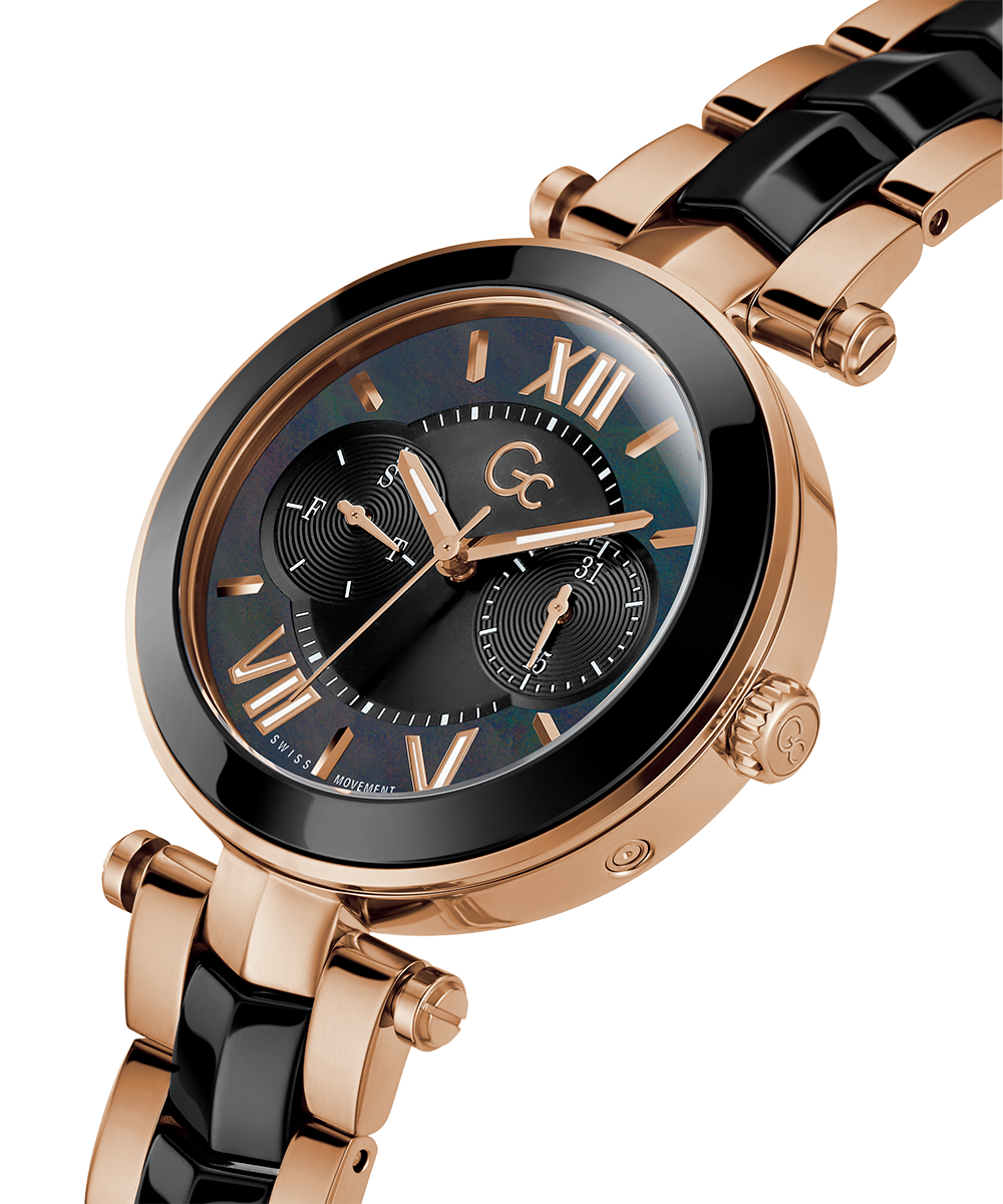 Sleek and stylish, the Gc Illusion Ceramic combines all the signature details with full rose gold PVD and black ceramic case and bracelet, paired with a black mother-of-pearl dial, displaying day & date counters for a casual touch.