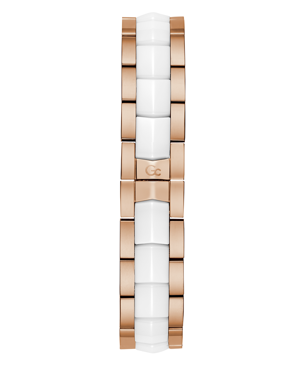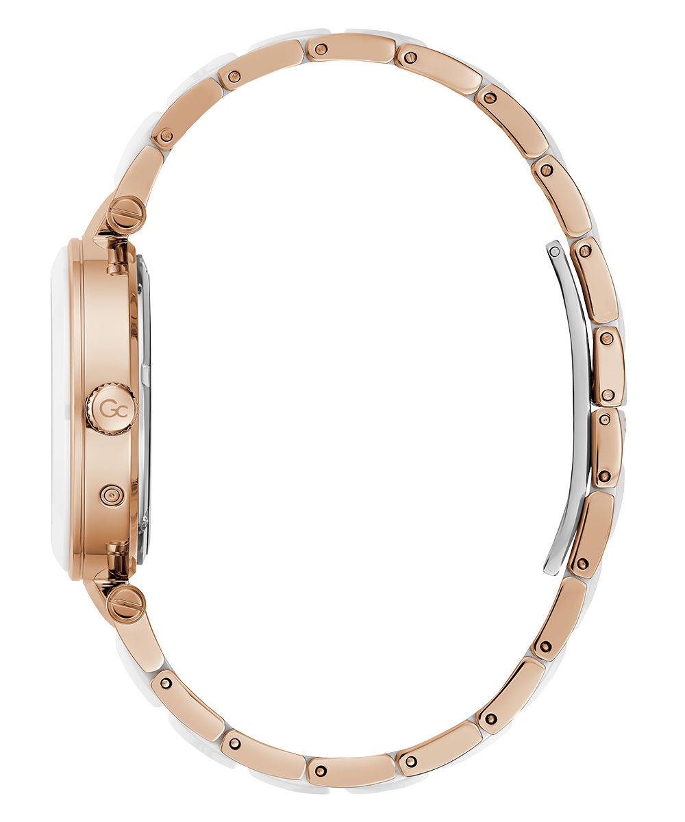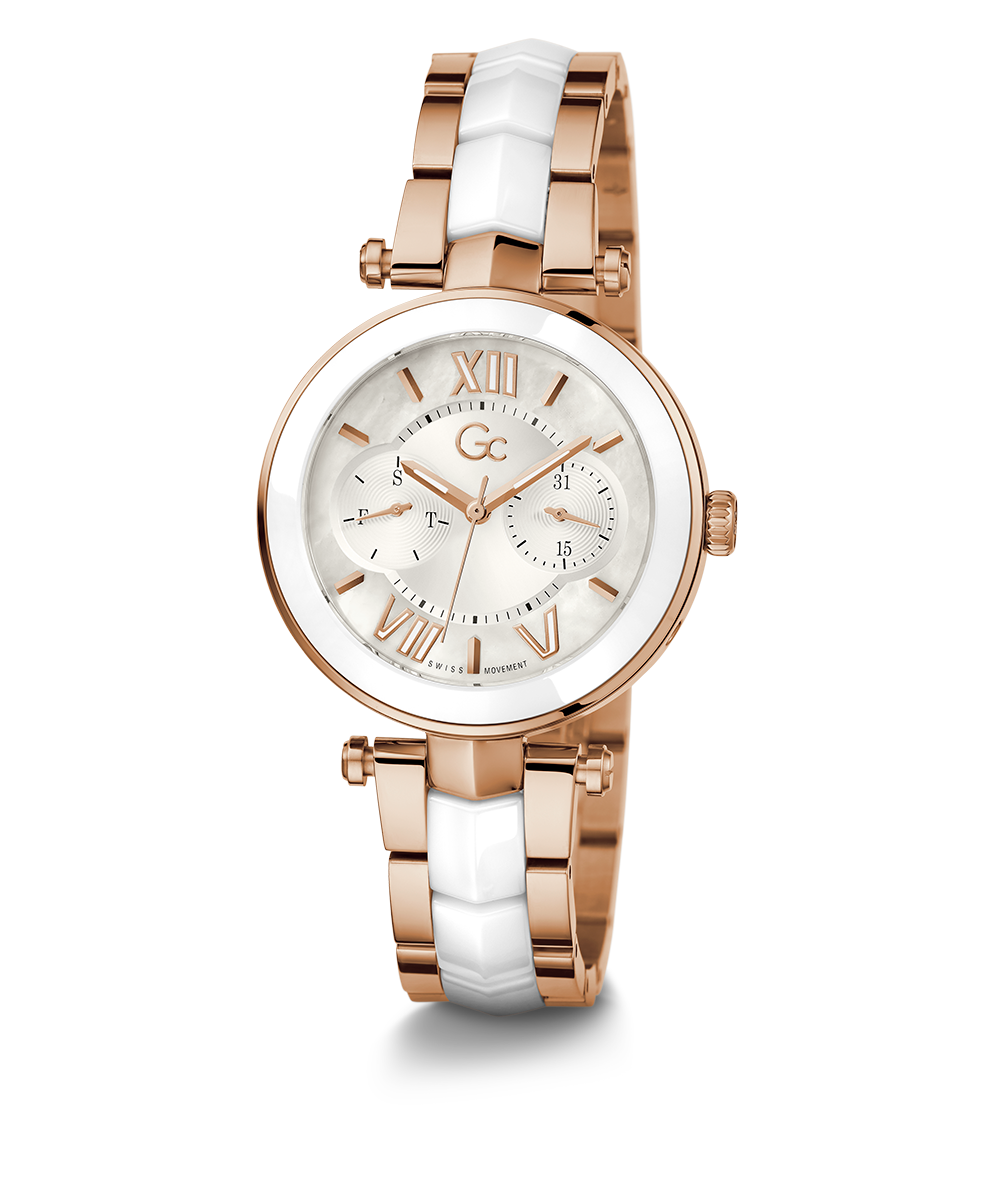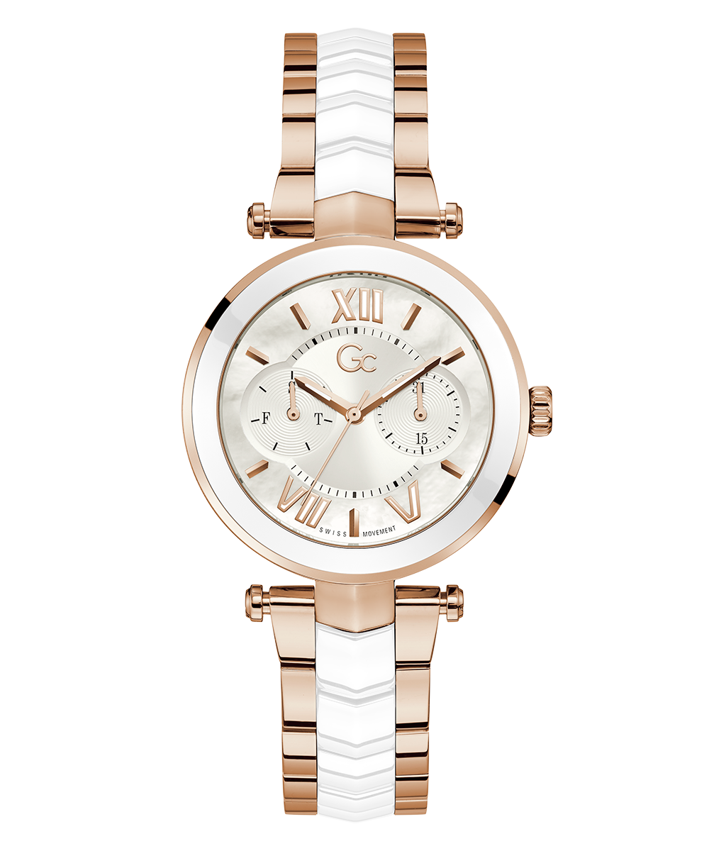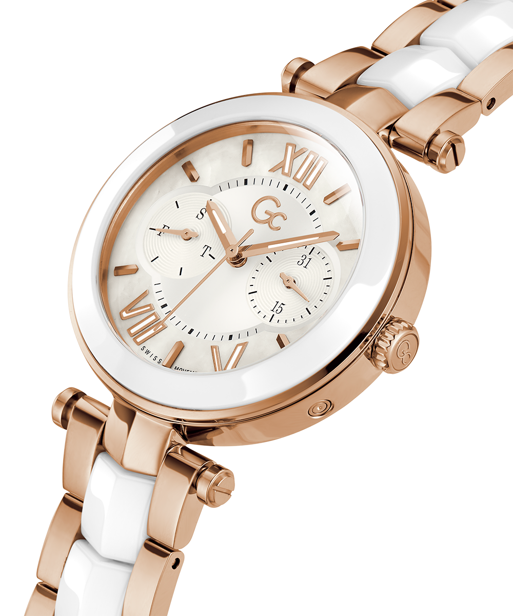 Sleek and stylish, the Gc Illusion Ceramic combines all the signature details with full rose gold PVD with white ceramic case and bracelet, paired with a white mother-of-pearl dial, displaying day & date counters for a casual touch.
