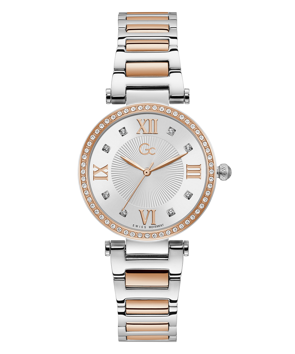 Add a touch of sparkle to the everyday with this elegant two-tone timepiece, its silver dial with guilloche centre contrasted with rose gold accents in hands, Roman Numerals and sparkling Swarovski® crystal indices, the whole encircled with a ring of Swarovski crystals on the bezel.