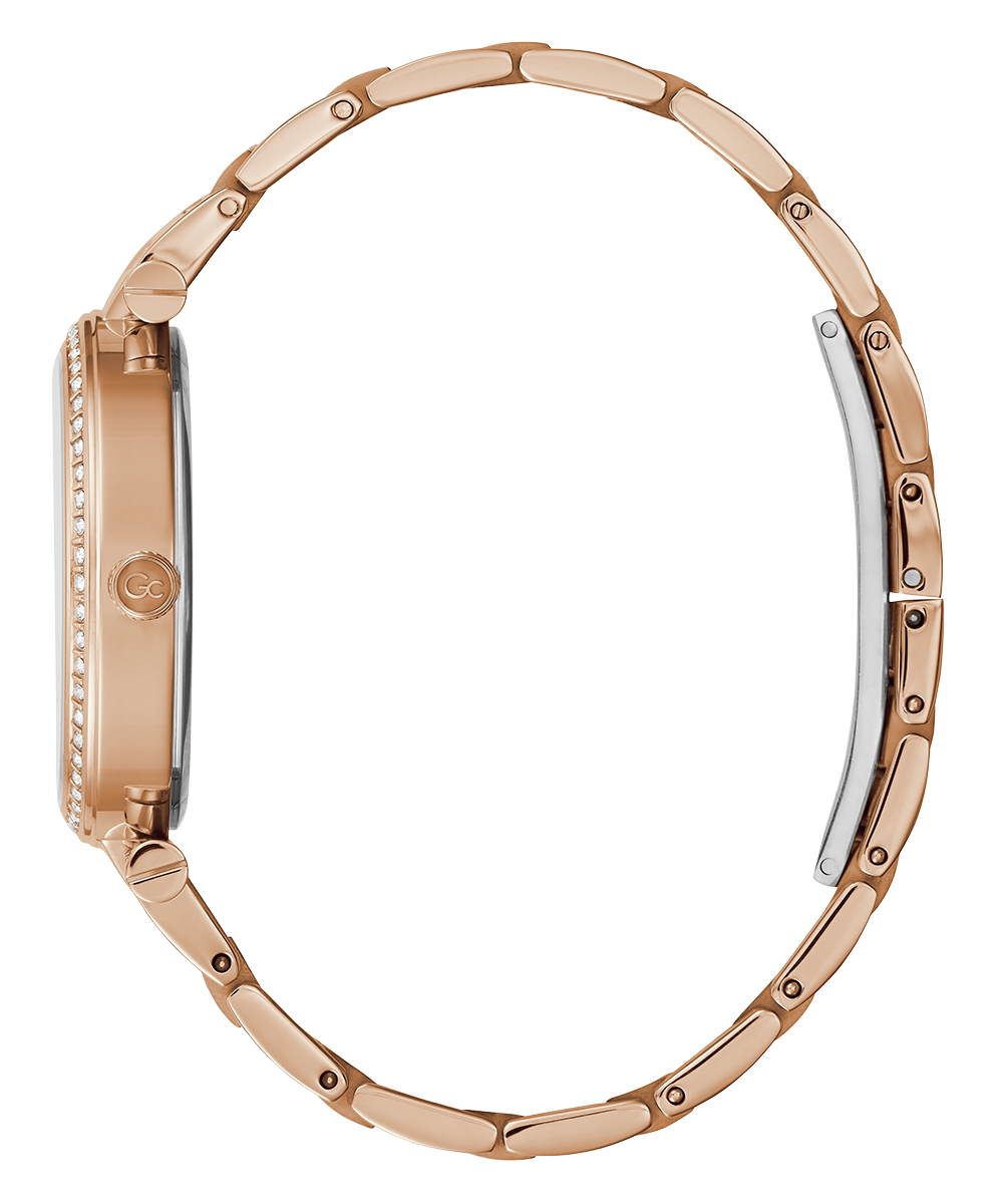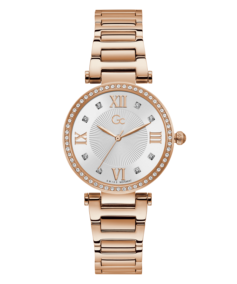 Add a touch of sparkle to the everyday with this elegant all rose-gold tone timepiece, its silver dial with guilloche centre contrasted with rose gold accents in hands, Roman Numerals and sparkling Swarovski® crystal indices, the whole encircled with a ring of Swarovski crystals on the bezel.