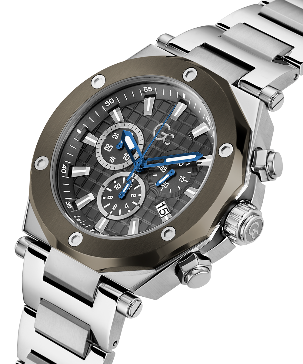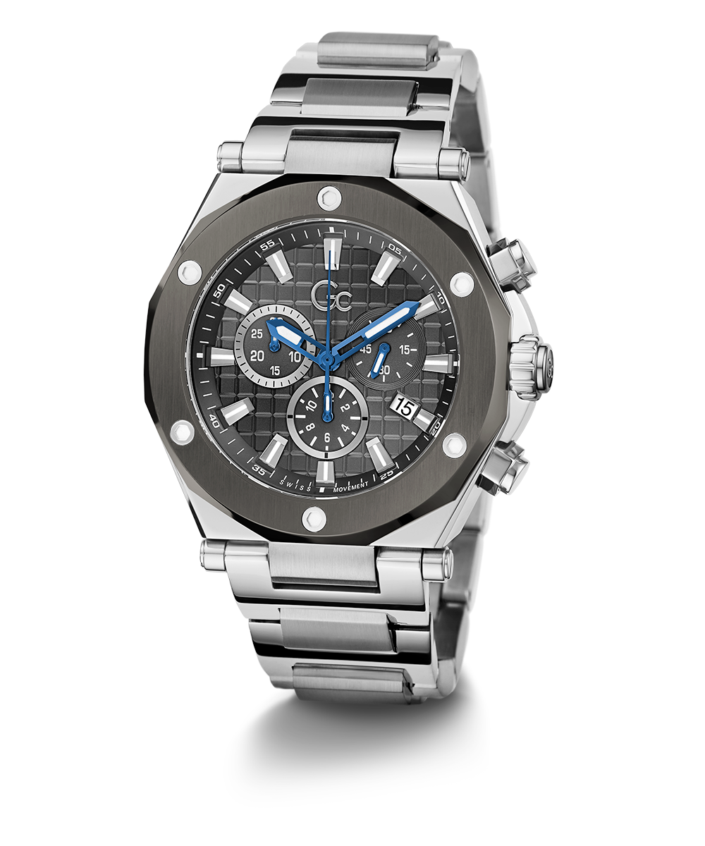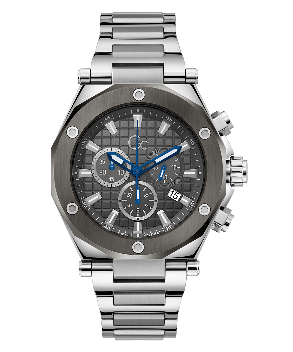 Dress to impress with the stylish Gc Legacy chronograph and its bold 44mm shaped case and detailed top ring, square patterned dial and structured H-link bracelet, featured here in silver tone with gun PVD top ring and dark grey dial enhanced with blue hands.