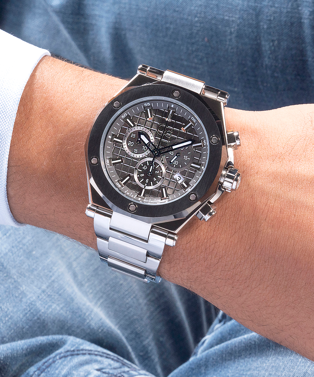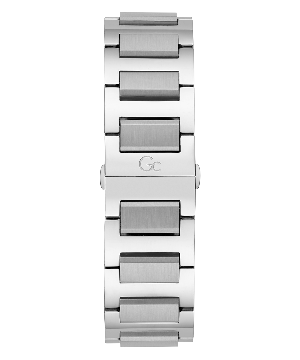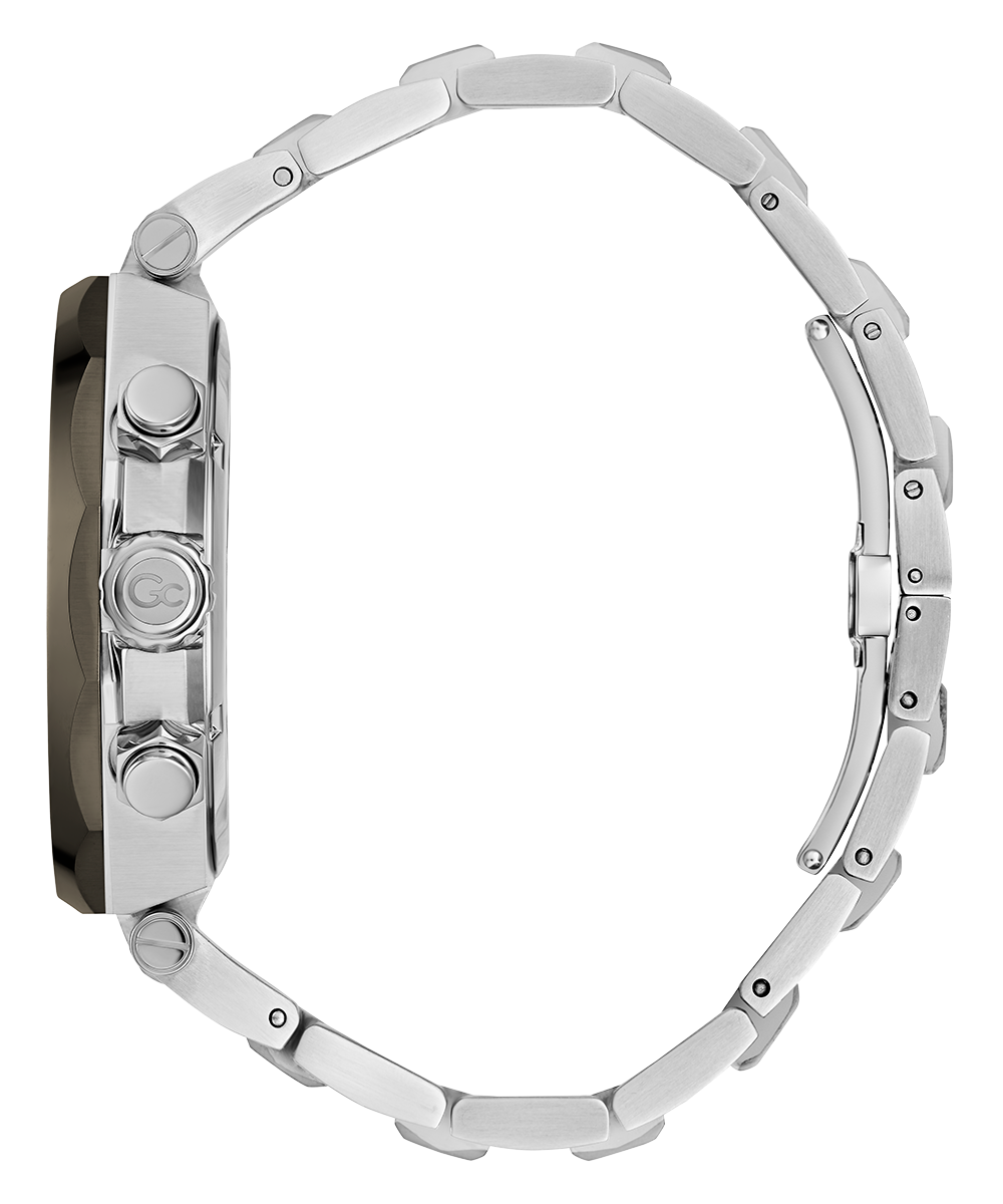 Dress to impress with the stylish Gc Legacy chronograph and its bold 44mm shaped case and detailed top ring, square patterned dial and structured H-link bracelet, featured here in silver tone with gun PVD top ring and dark grey dial enhanced with blue hands.
