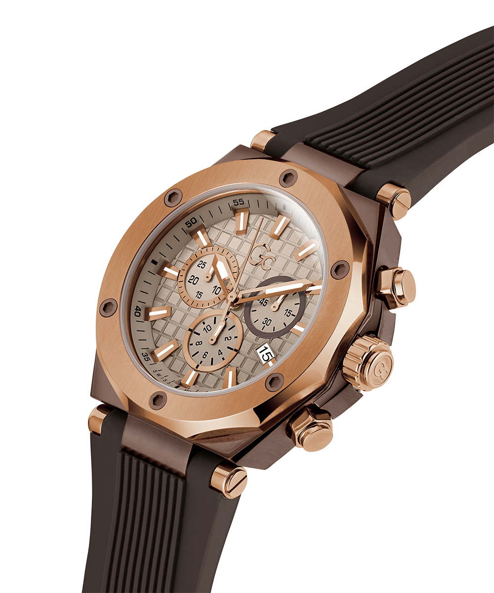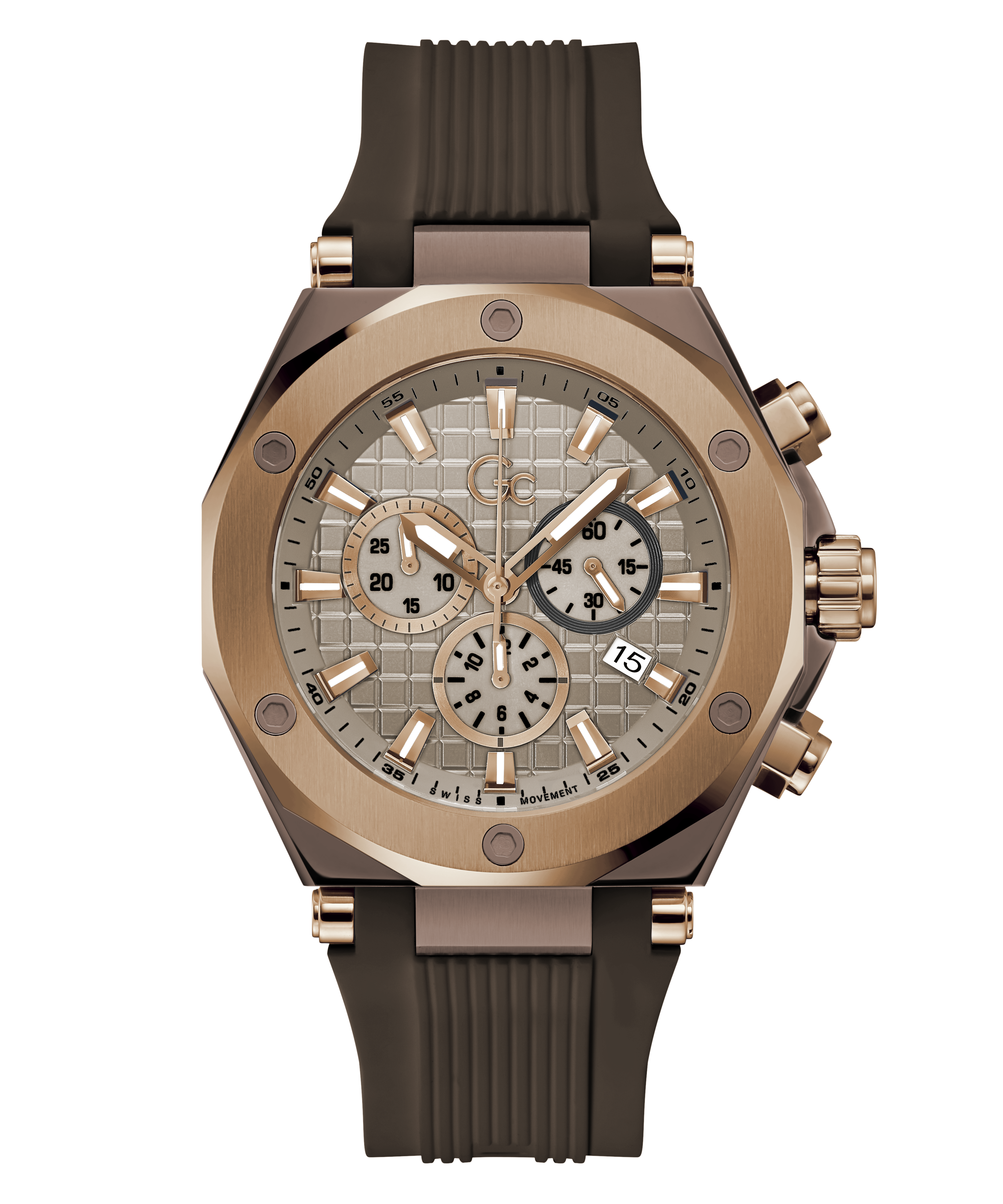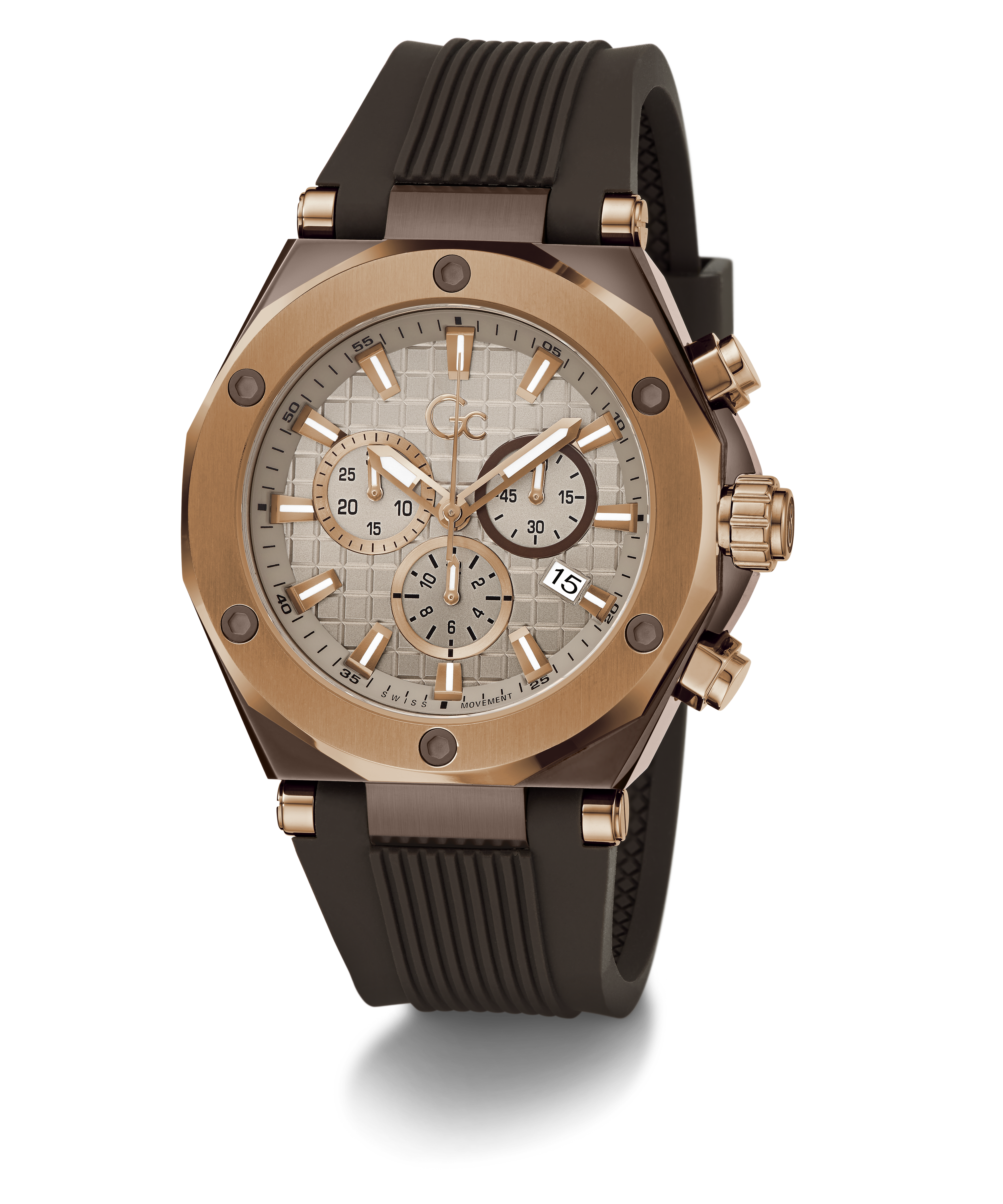 Dress to impress with the stylish Gc Legacy chronograph and its bold 44mm shaped case and detailed top ring, square patterned dial and structured and detailed brown silicone strap, featured here in warm brown and rose gold PVD with sophisticated earthy beige dial.