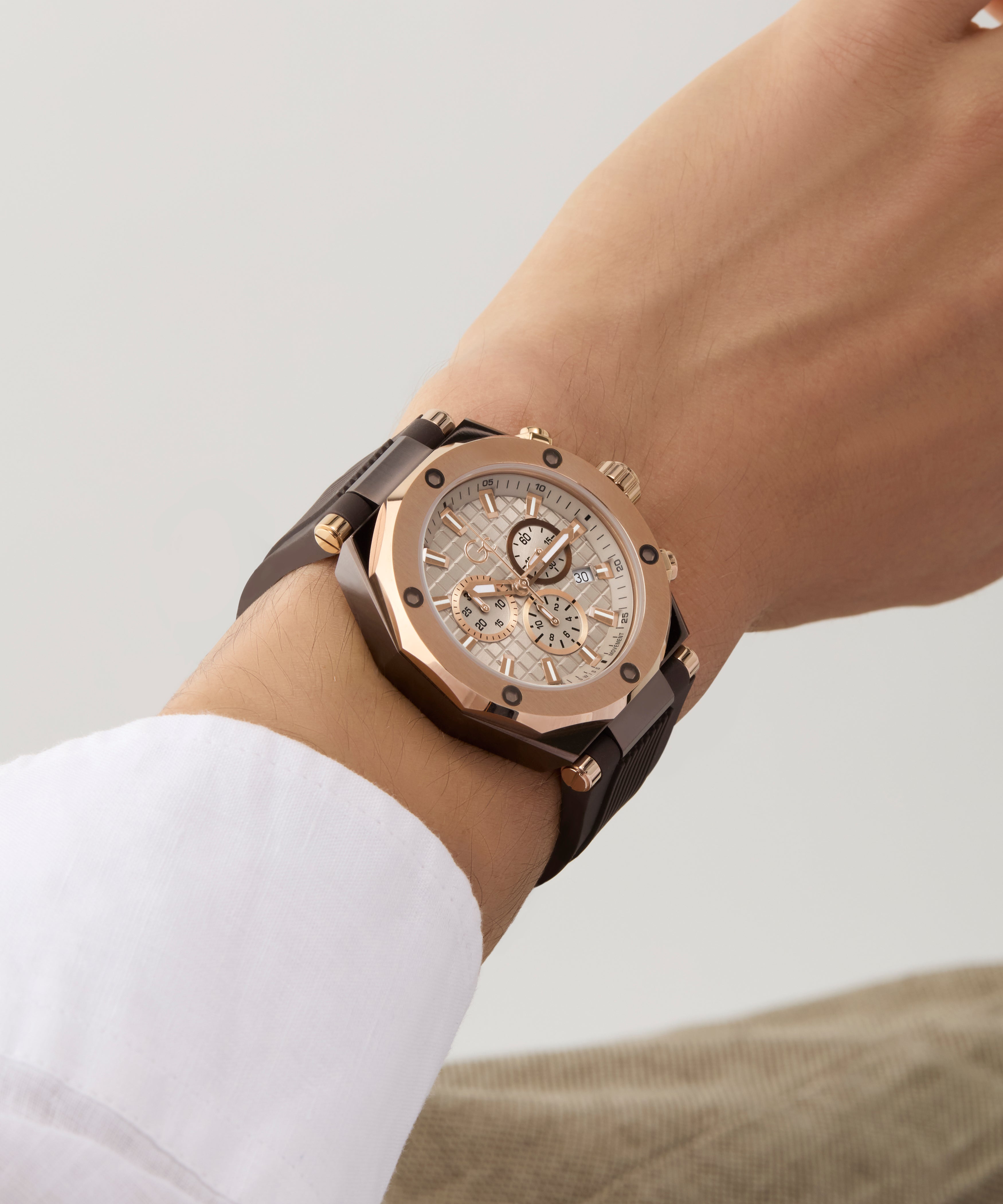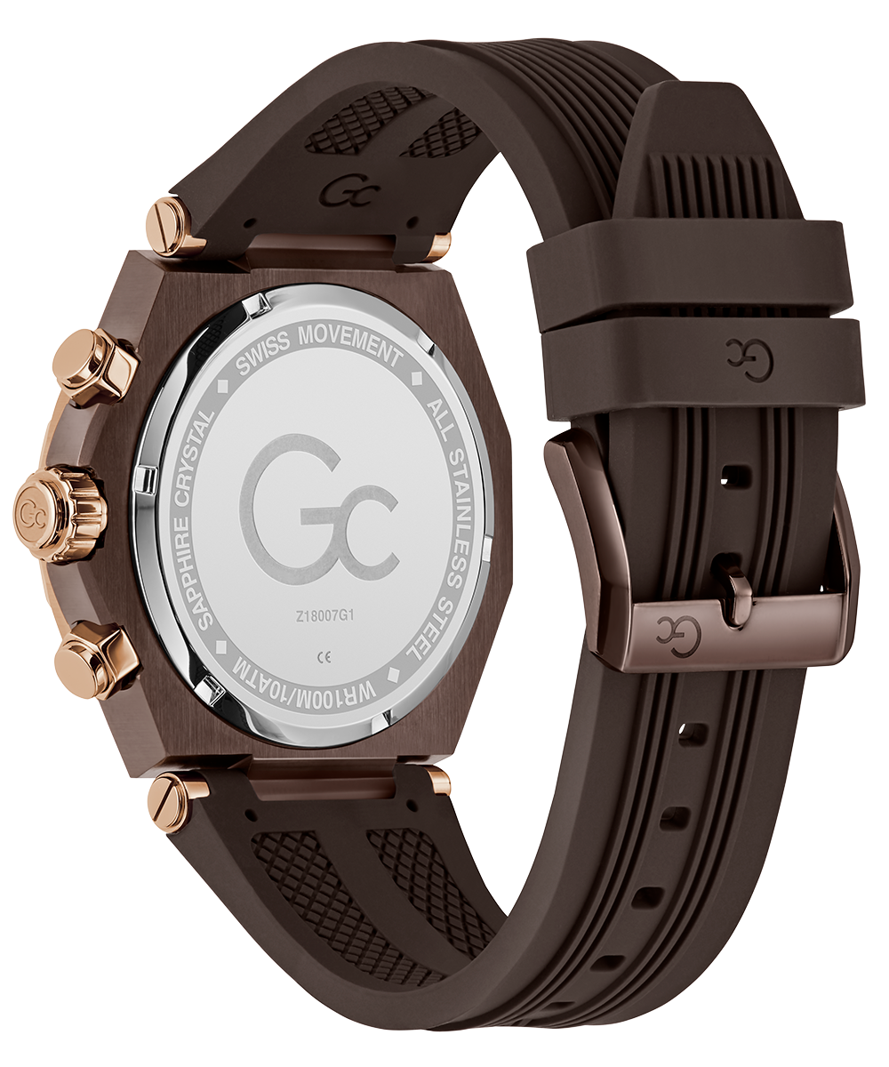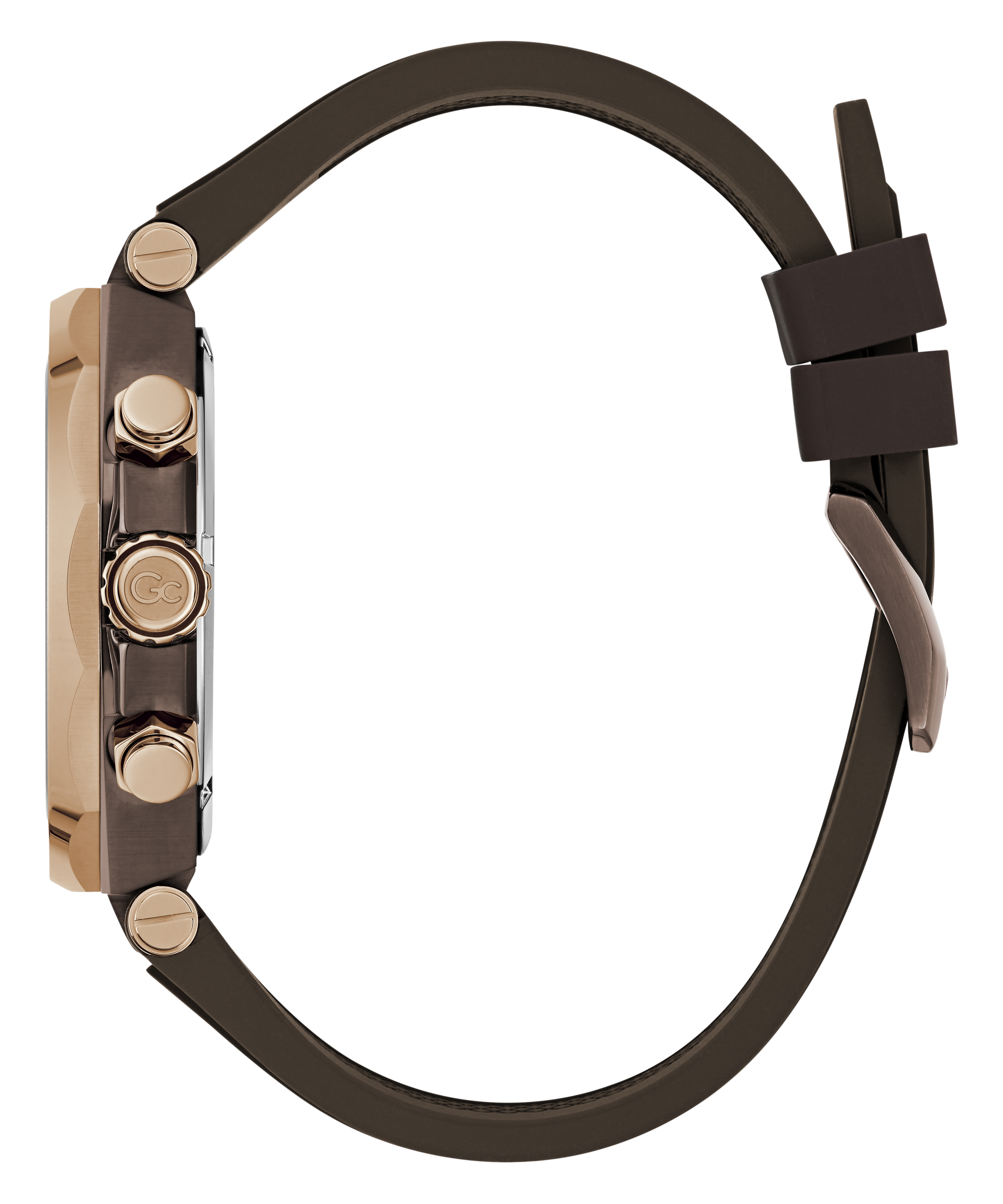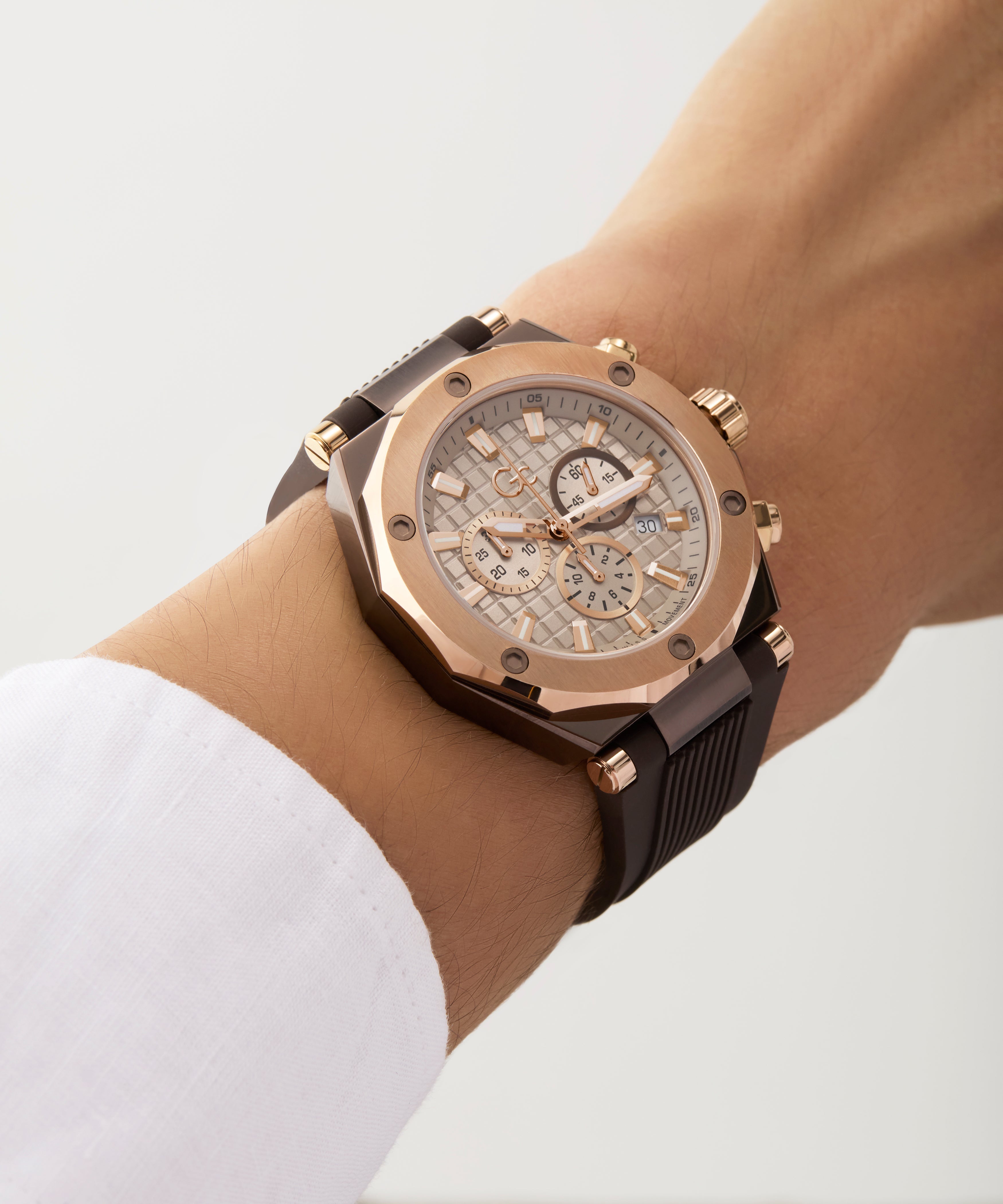 Dress to impress with the stylish Gc Legacy chronograph and its bold 44mm shaped case and detailed top ring, square patterned dial and structured and detailed brown silicone strap, featured here in warm brown and rose gold PVD with sophisticated earthy beige dial.