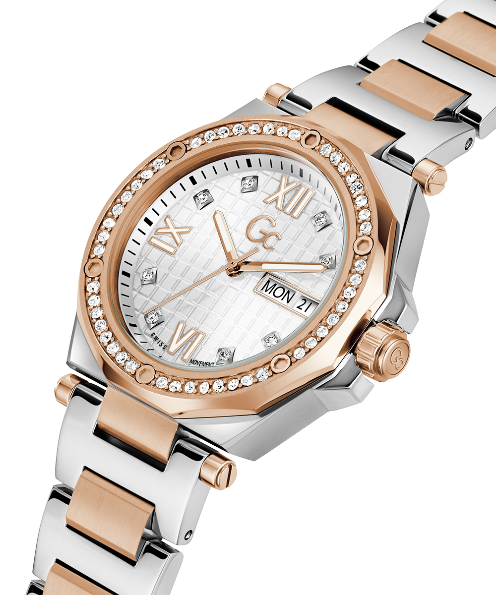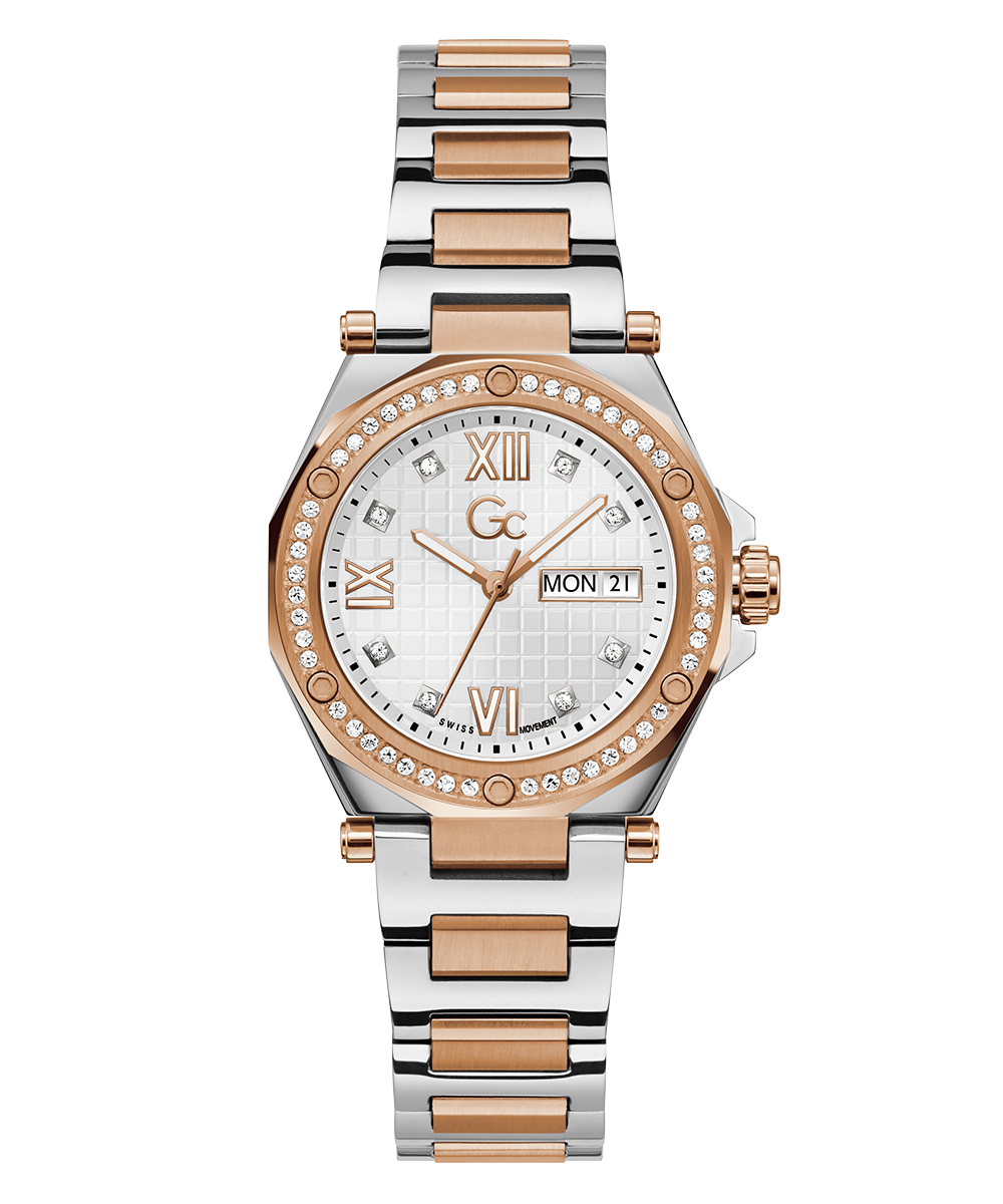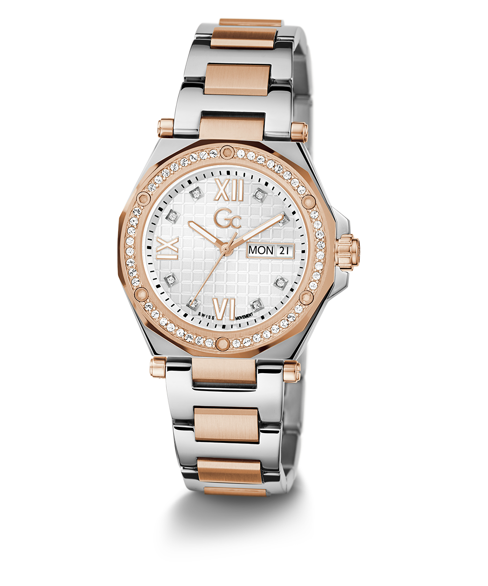 Stylish, sporty, and chic - the Gc Legacy hosts a unique 34mm case shape design with detailed top ring, patterned dial embellished with European crystals and structured H-link bracelet, here in two-tone silver and rose gold PVD with off-white di