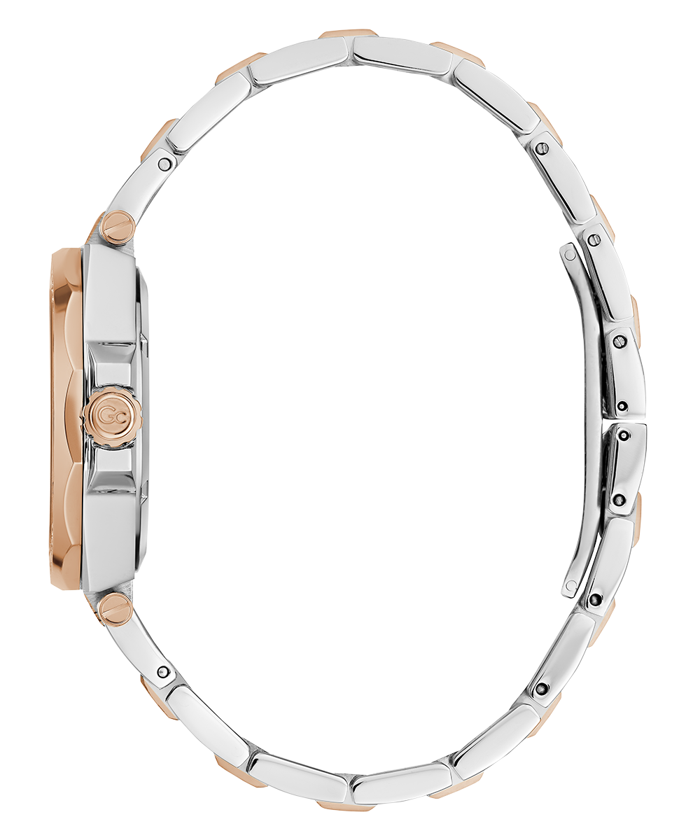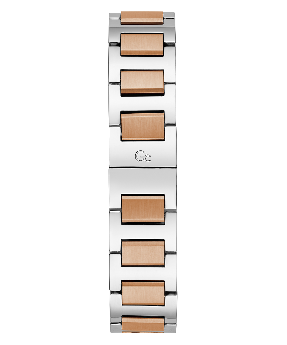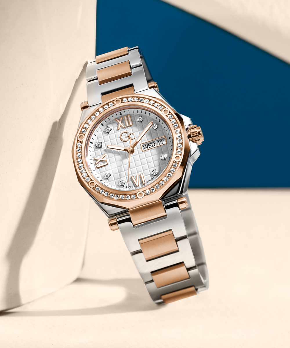 Stylish, sporty, and chic - the Gc Legacy hosts a unique 34mm case shape design with detailed top ring, patterned dial embellished with European crystals and structured H-link bracelet, here in two-tone silver and rose gold PVD with off-white di