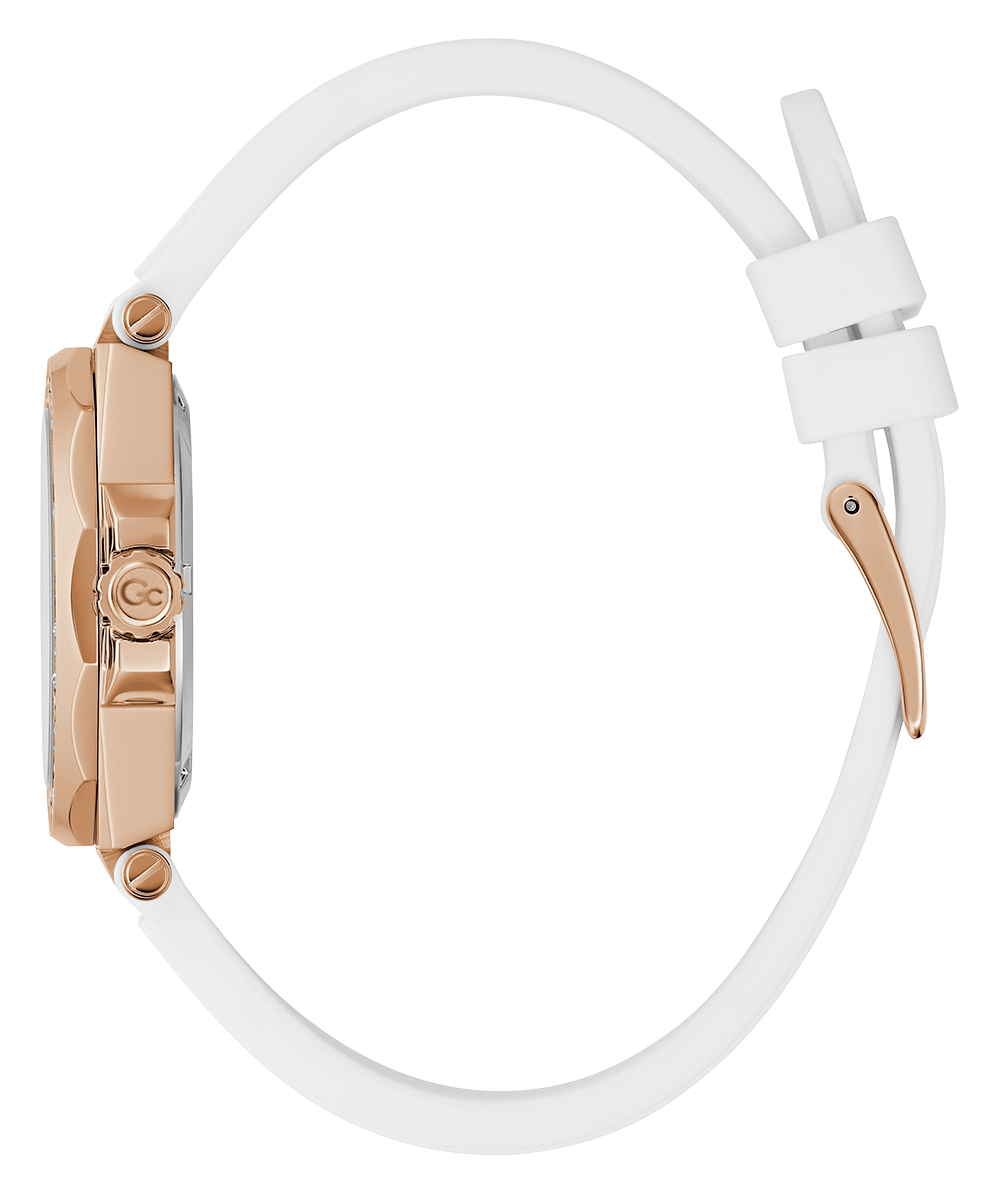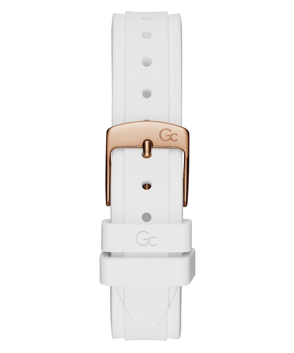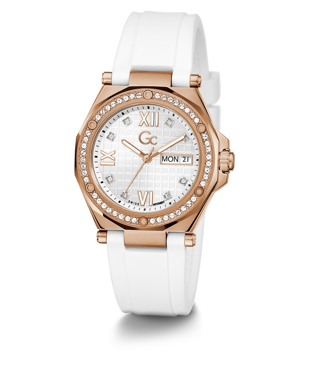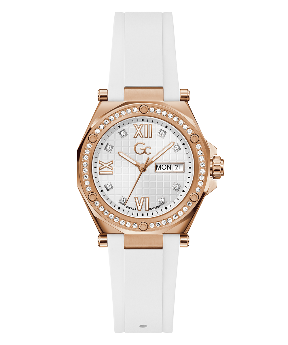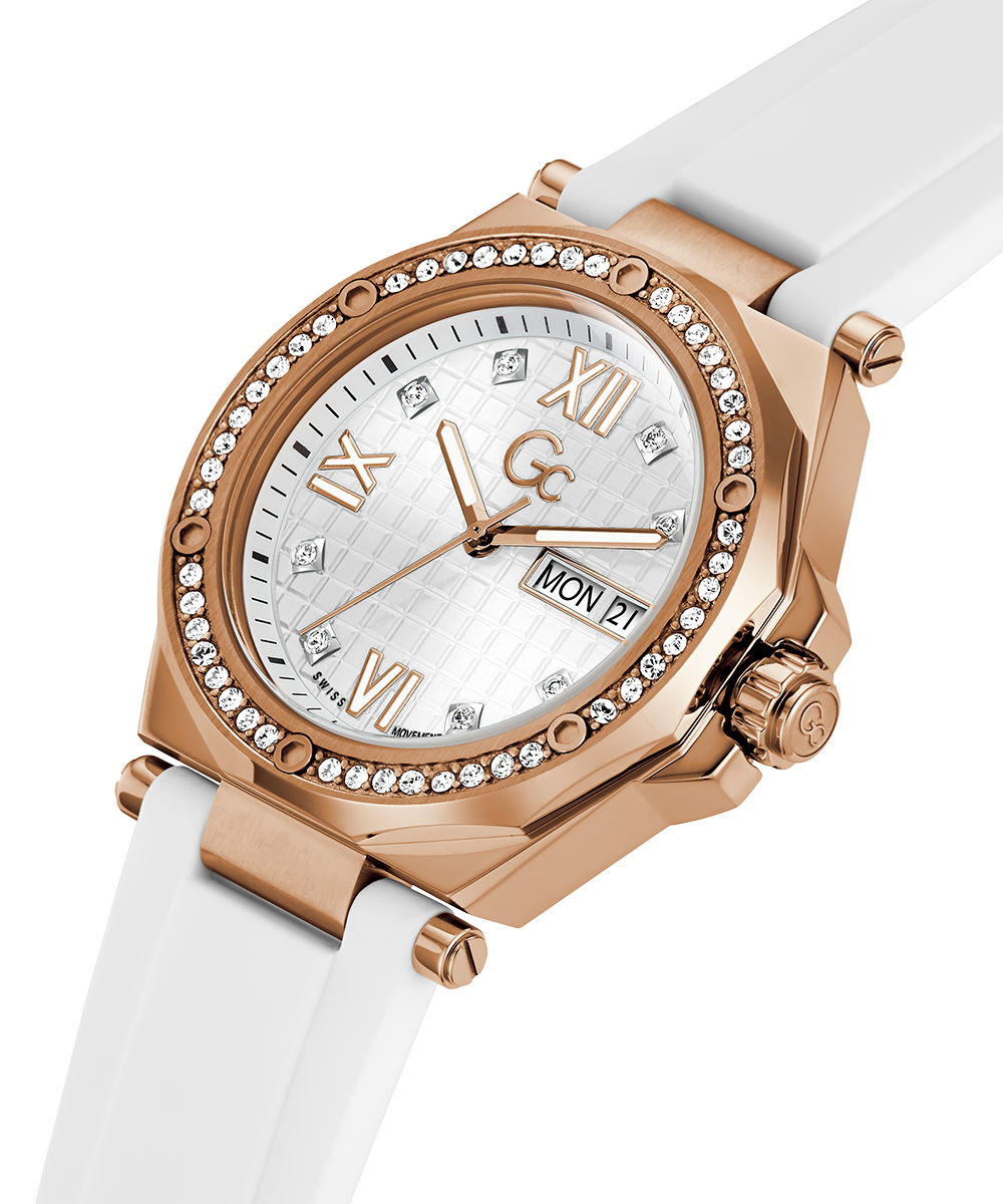 Stylish, sporty, and chic - the Gc Legacy hosts a unique 34mm case shape design with detailed top ring, patterned white dial embellished with European crystals and smooth white silicone strap, here with full rose gold PVD case.