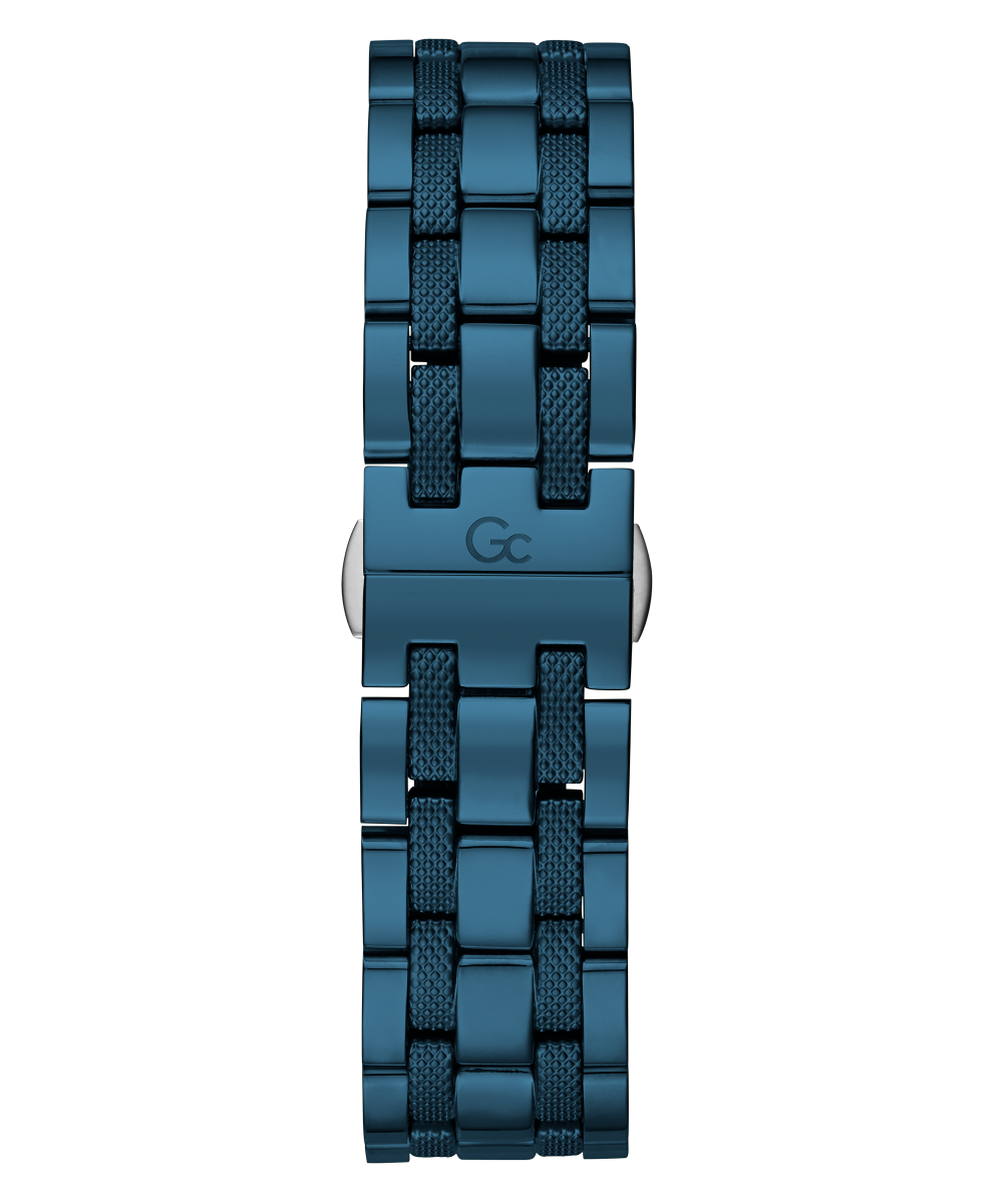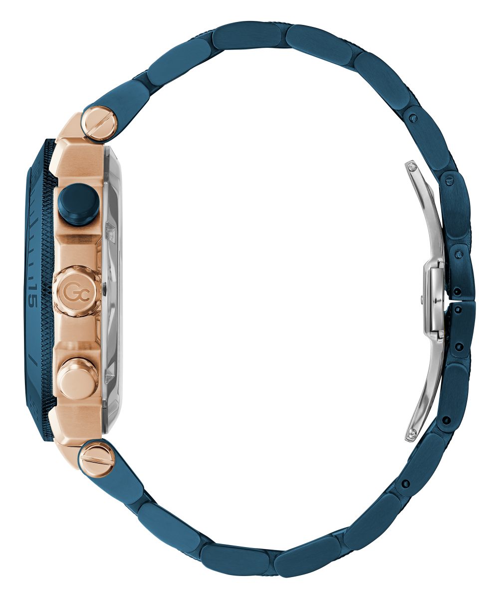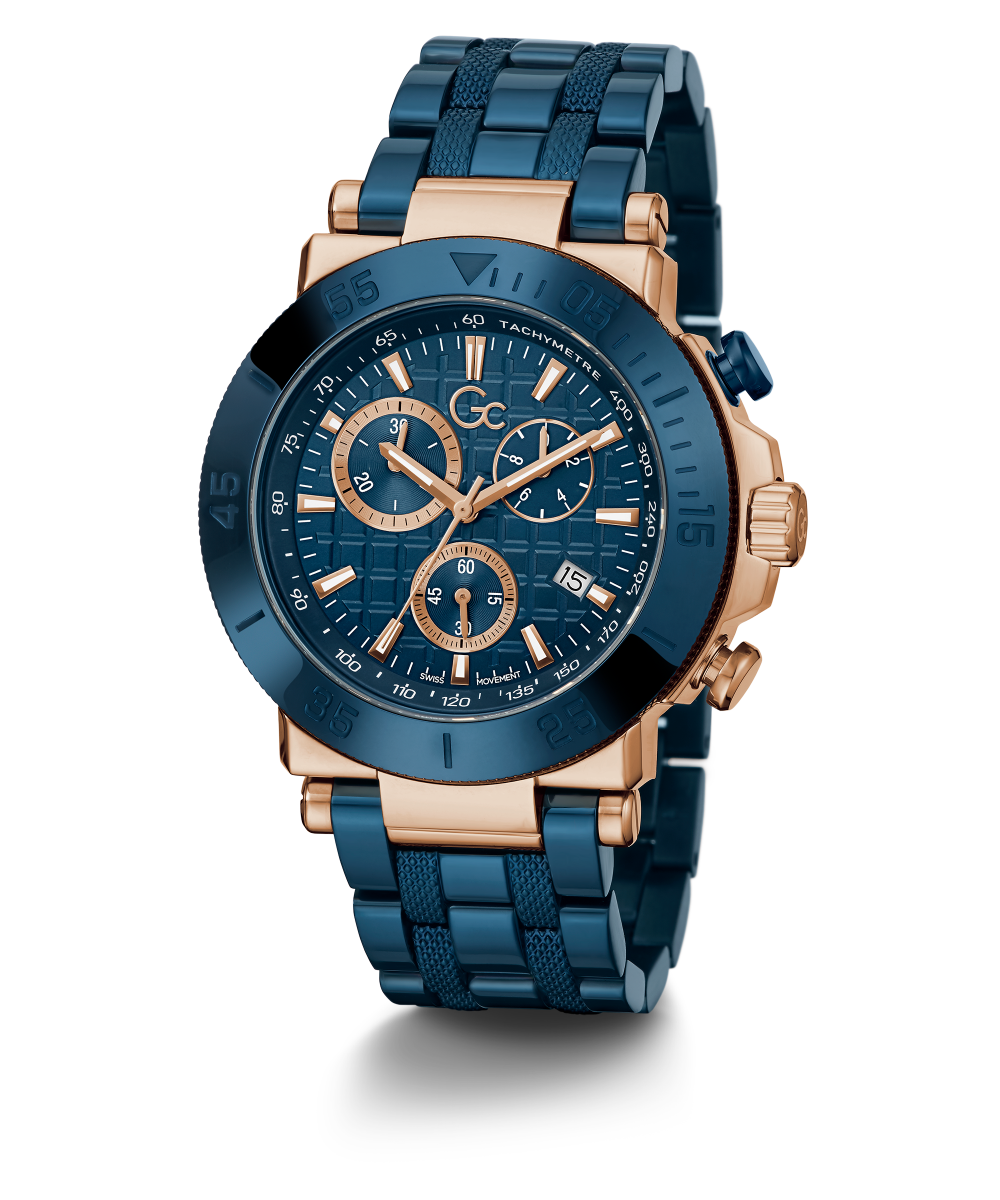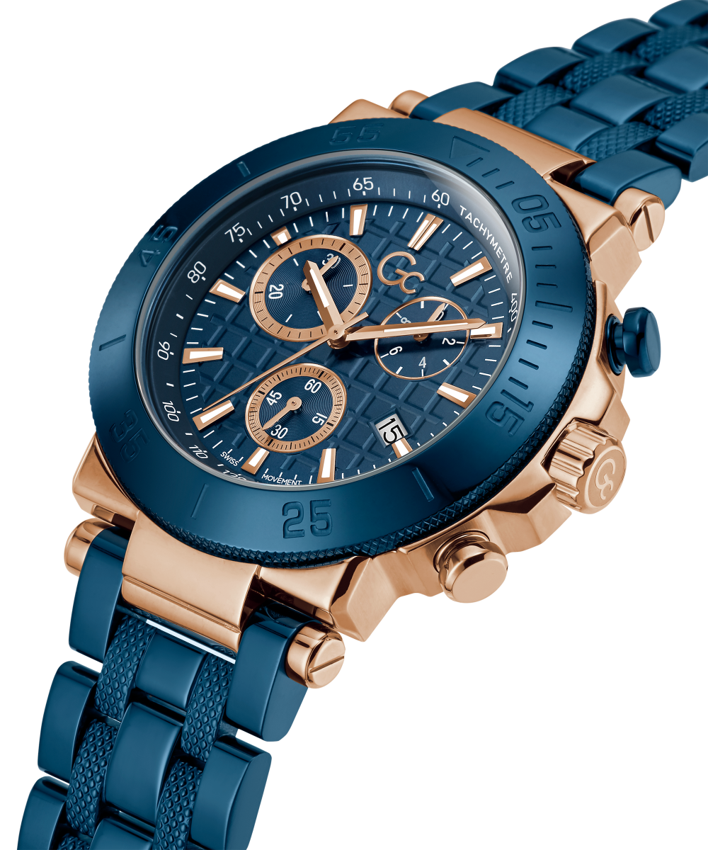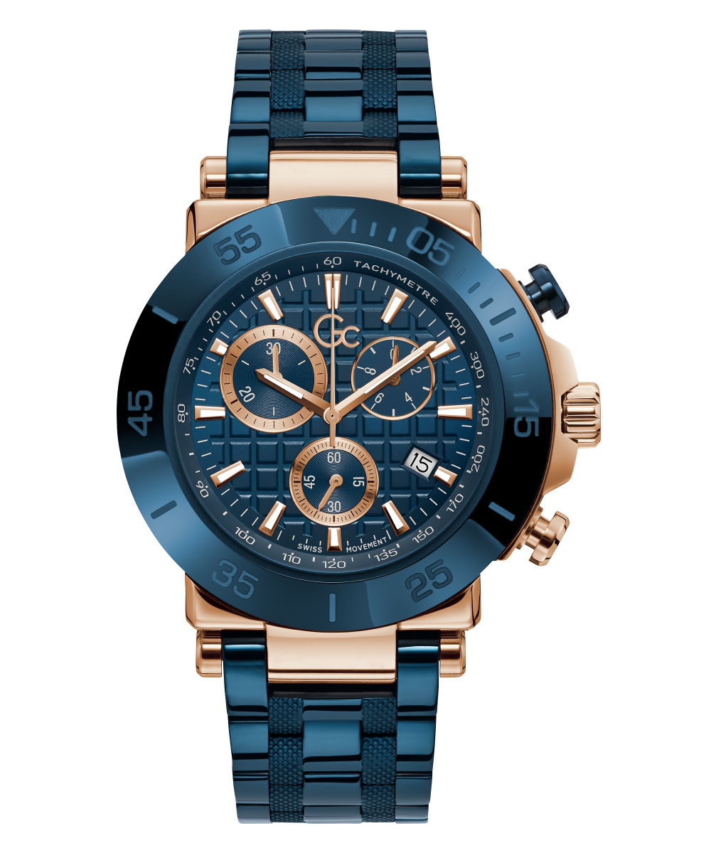 Impose yourself with this oversize modern take on the most iconic Gc chronograph, its brushed and polished rose gold tone case equipped with a blue etched bezel, matching checkered guilloche dial with tachymeter and three sub-counters, and blue metal bracelet with deployment buckle.