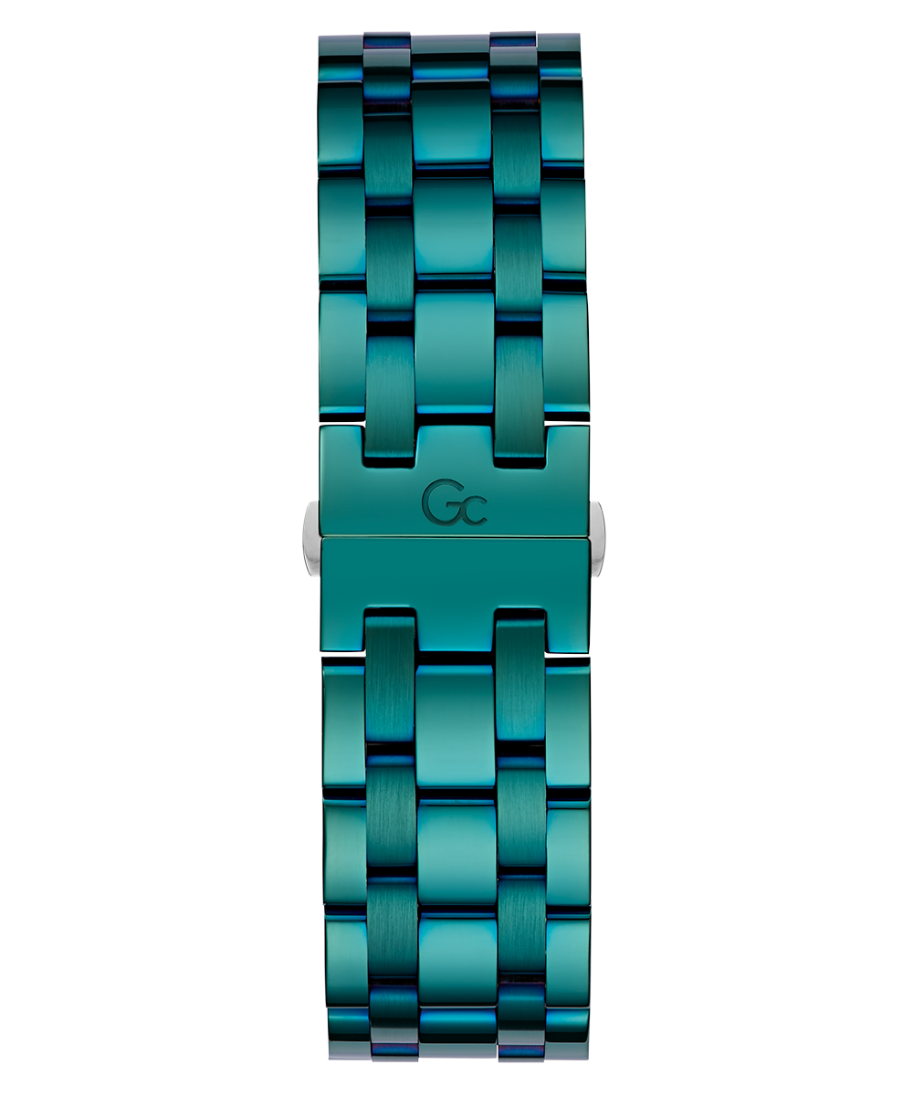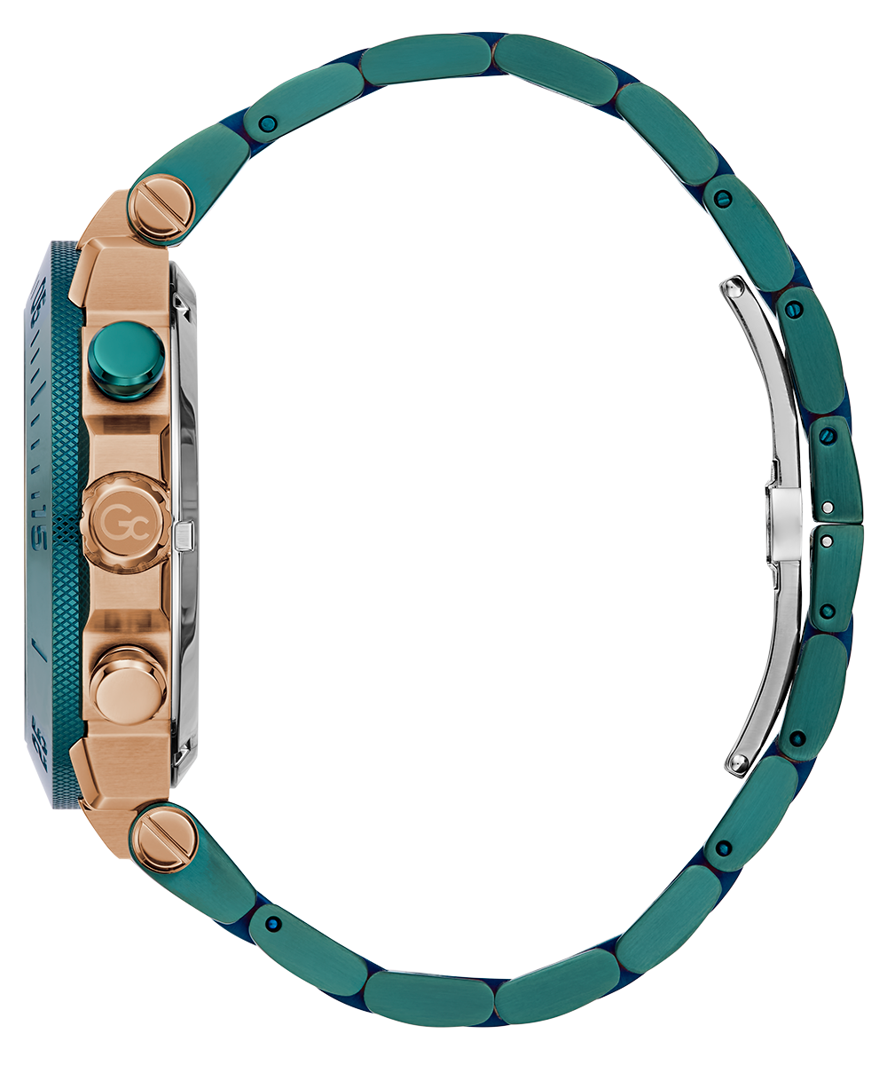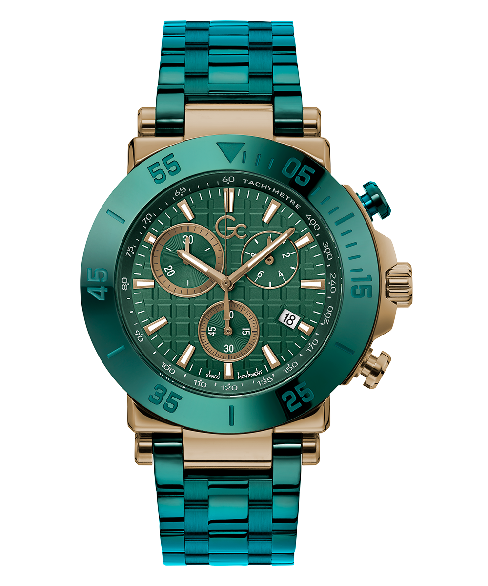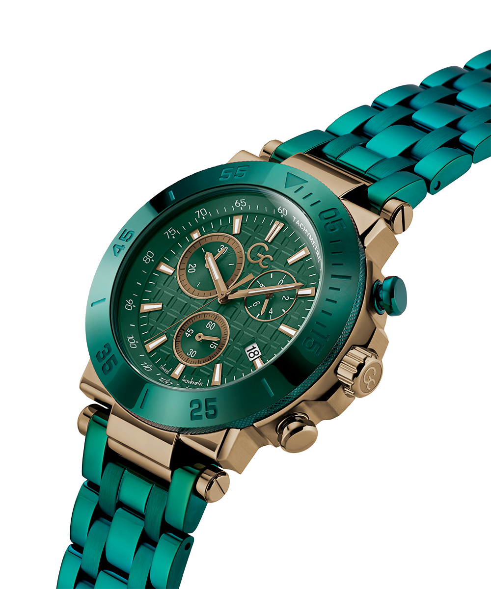 Impose yourself with this oversize modern take on the most iconic Gc chronograph, its brushed and polished bronze tone case equipped with a trendy green PVD bezel, matching checkered guilloche dial with tachymeter and three sub-counters, and innovative green PVD metal bracelet with deployment buckle.
