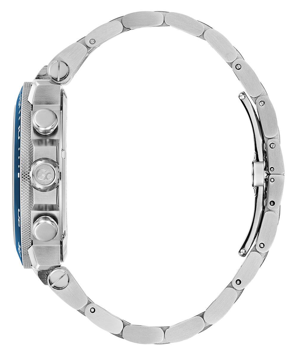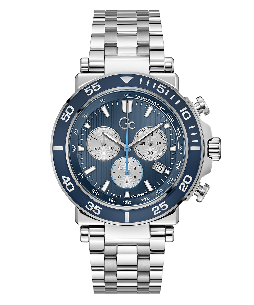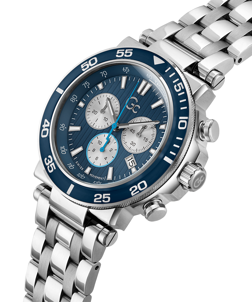 Impress with this oversized, modern interpretation of the iconic Gc chronograph. The brushed and polished silver tone case is equipped with a blue color-imprinted glass bezel, complemented by a matching striped guilloche blue dial featuring a tachymeter and three sub-counters. The look is completed with the silver tone metal bracelet...