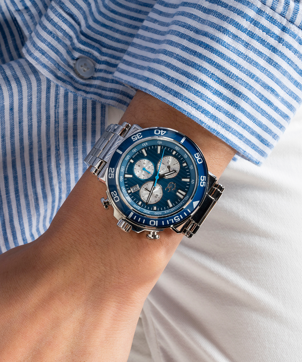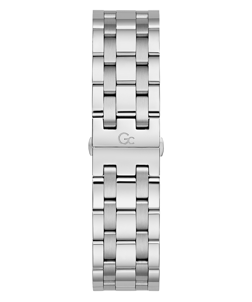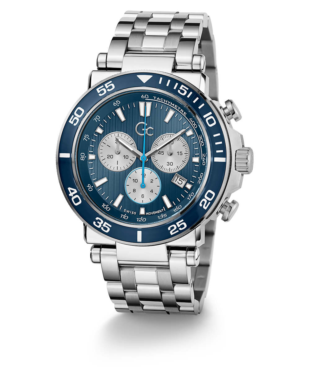 Impress with this oversized, modern interpretation of the iconic Gc chronograph. The brushed and polished silver tone case is equipped with a blue color-imprinted glass bezel, complemented by a matching striped guilloche blue dial featuring a tachymeter and three sub-counters. The look is completed with the silver tone metal bracelet...