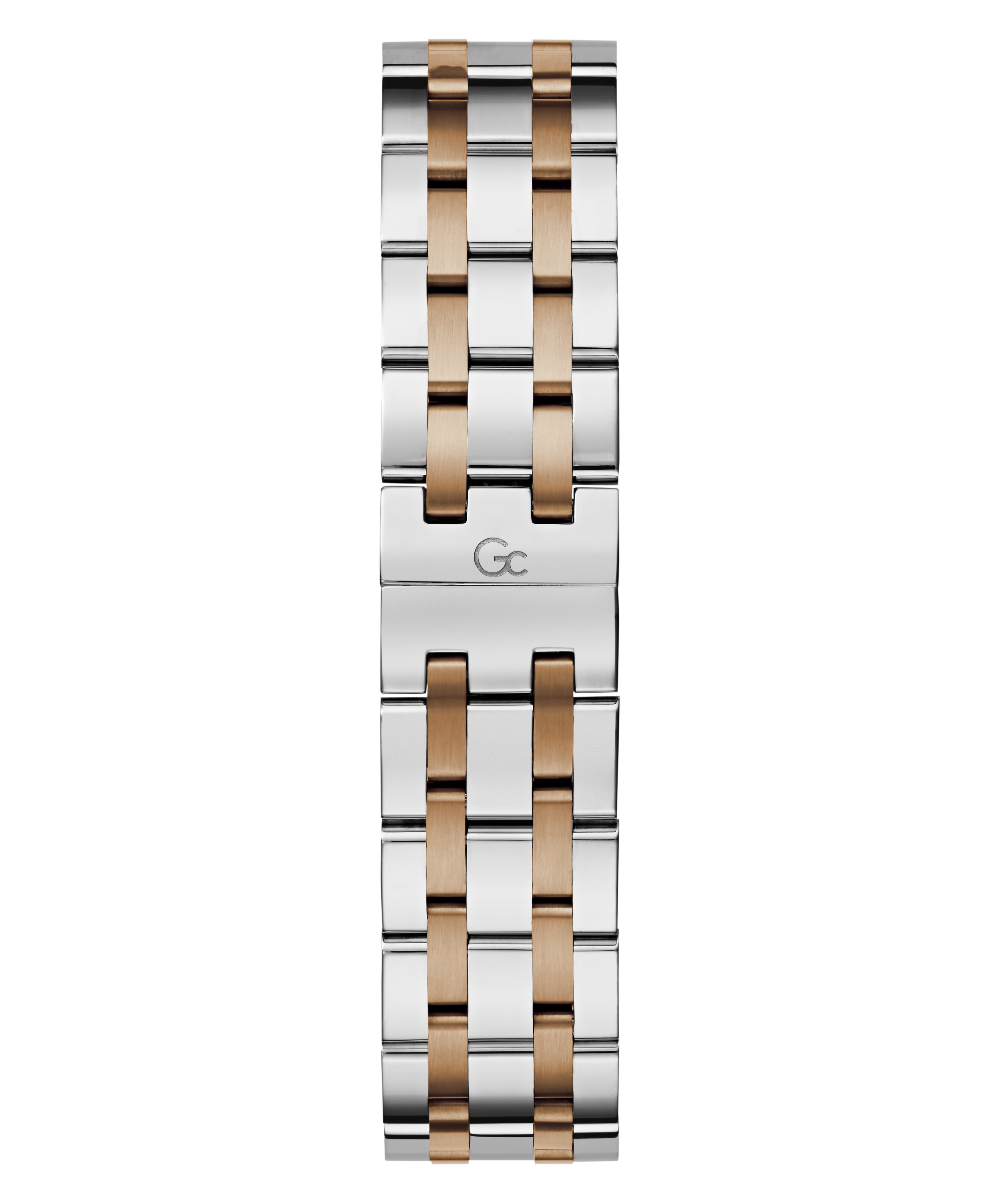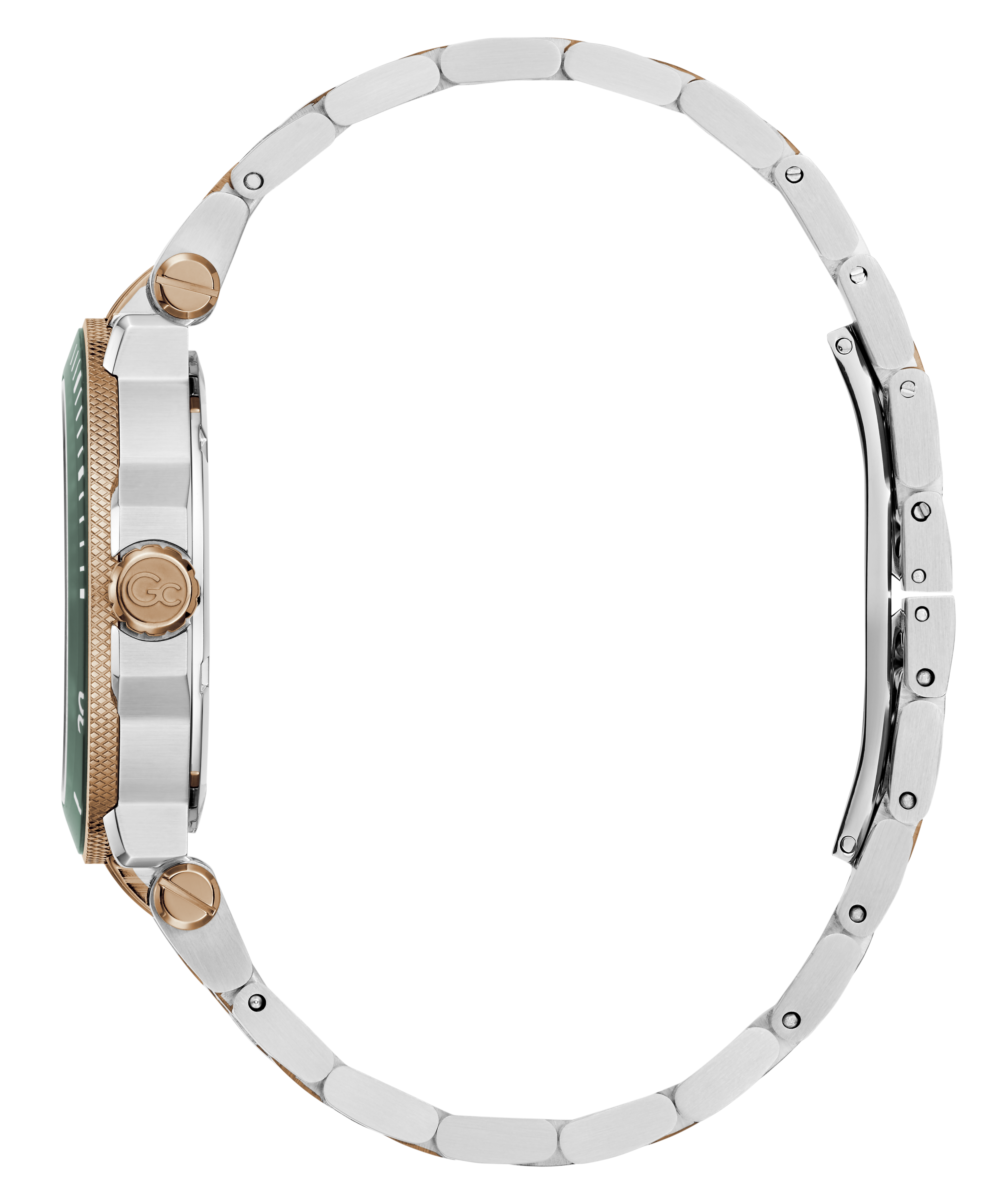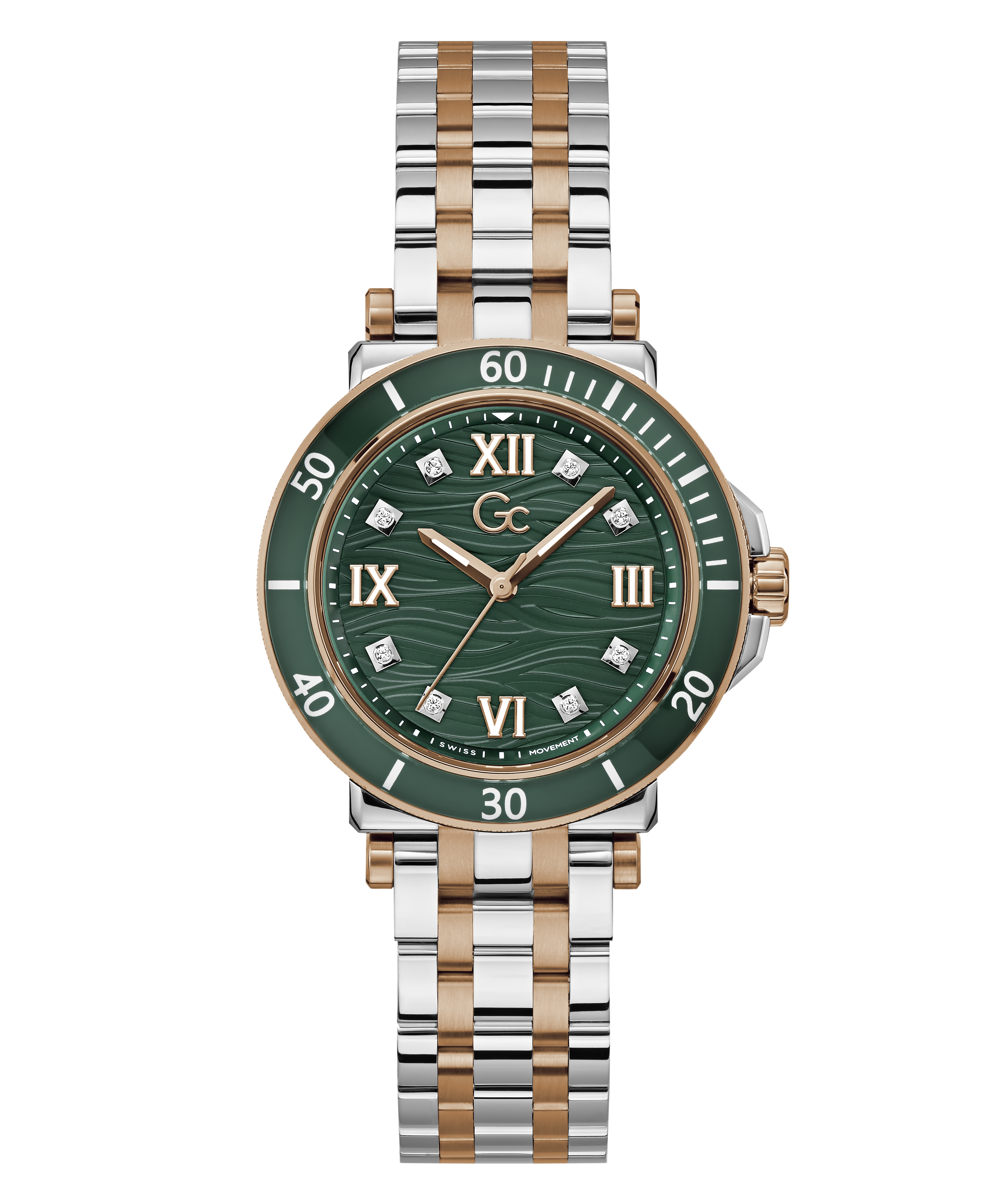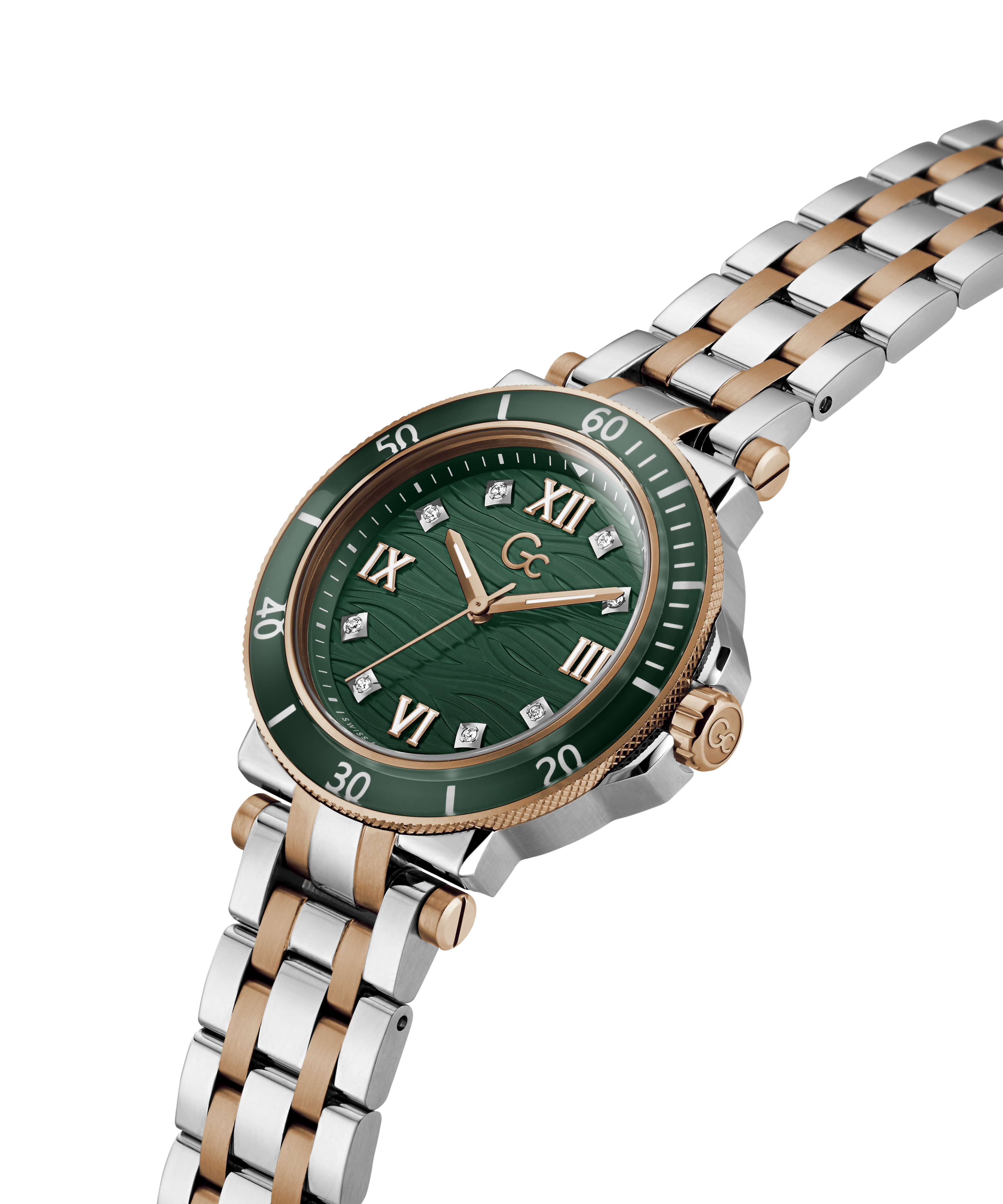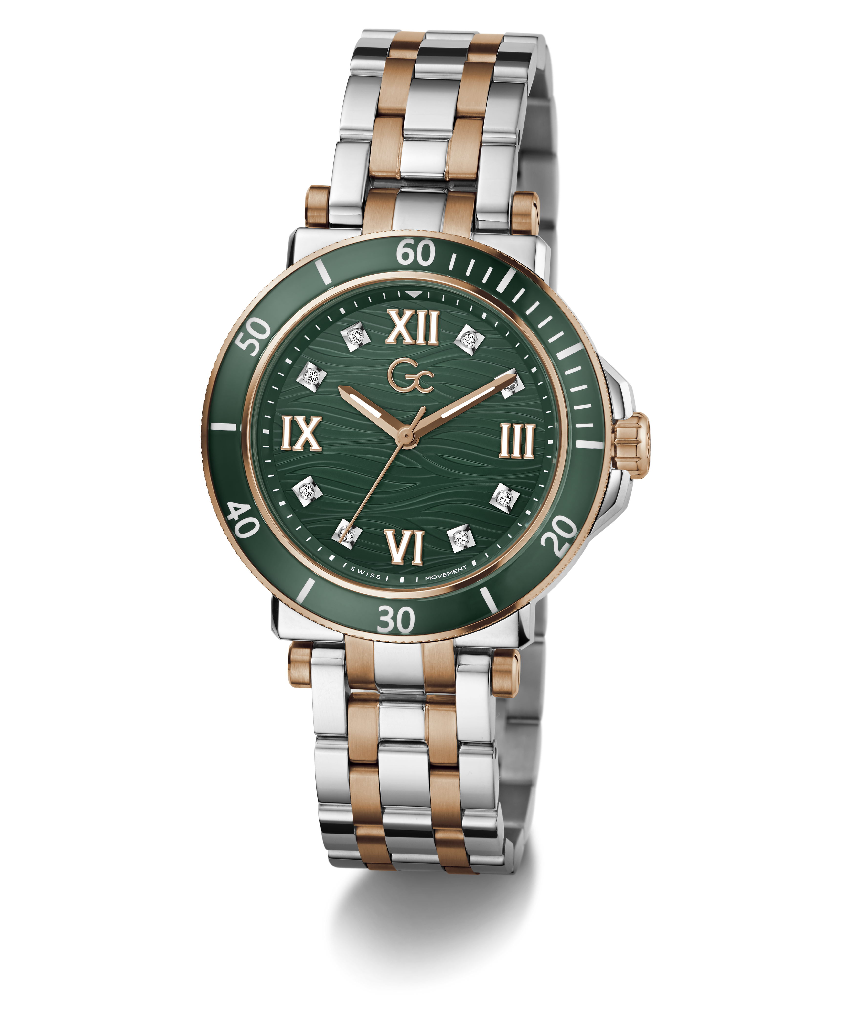 Sporty yet glamorous, adorn your wrist with the feminine interpretation of the iconic Gc One Sport. The brushed and polished rose gold and silver two-tone case features a green color-imprinted glass bezel, complemented by a matching dial with a super-feminine wave texture and crystal indices. The look is completed with a two-tone metal bracelet with a deployment buckle.