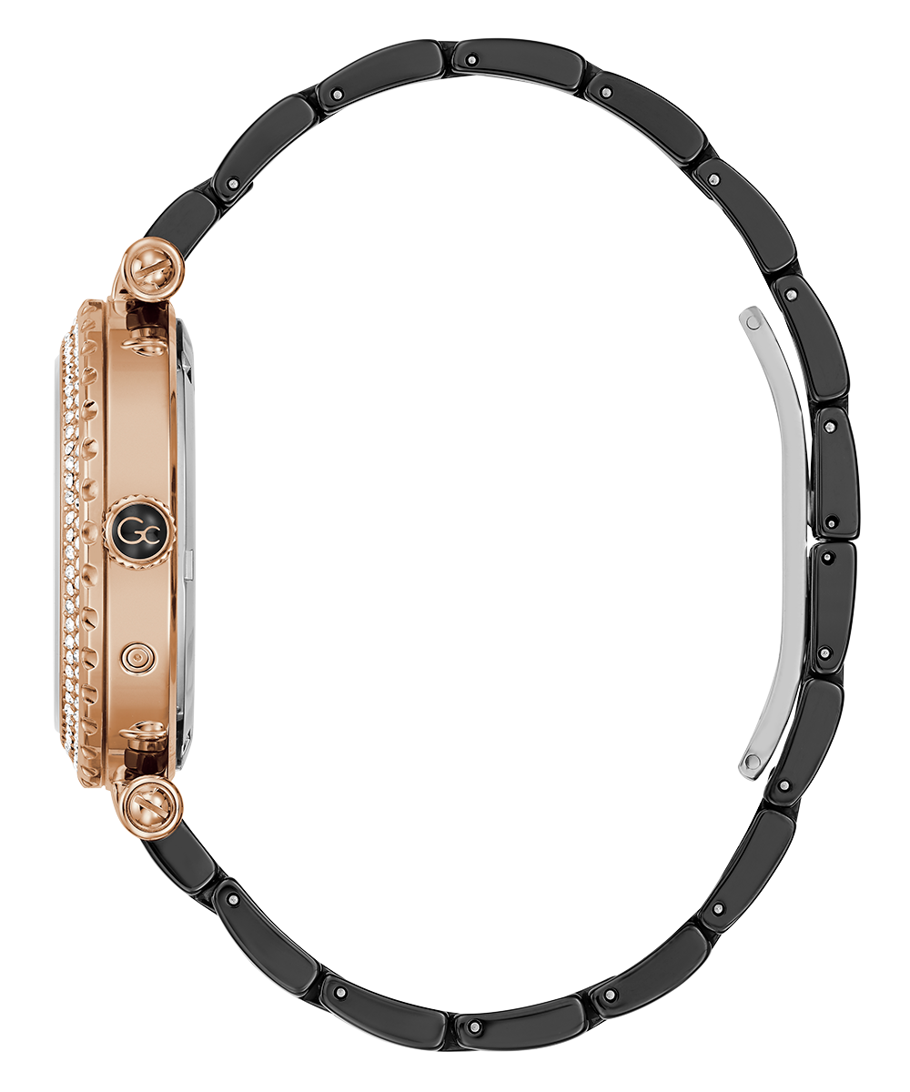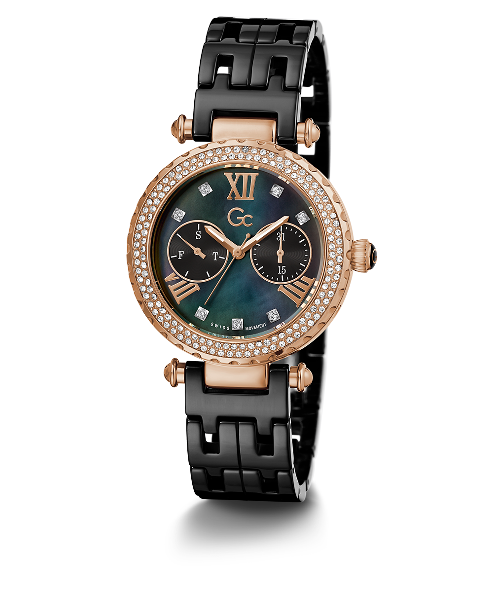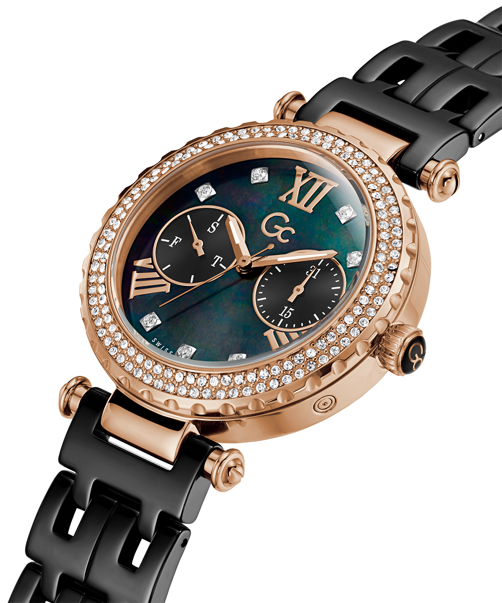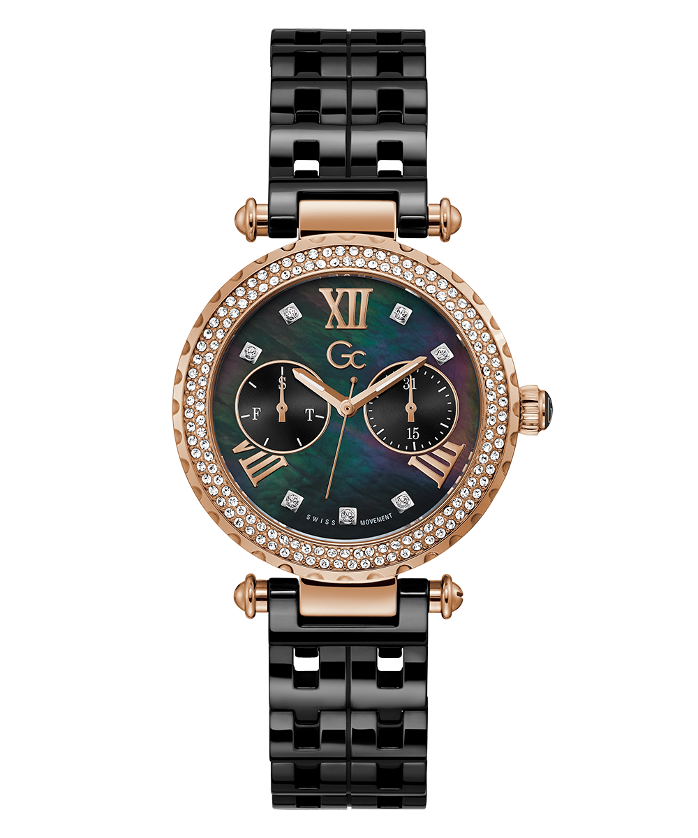 Radiate sparkling confidence with this ladies timepiece. Equipped with a black ceramic multi-link bracelet, the mid-size rose gold tone case of this watch is adorned with black mother-of-pearl dial, Swarovski® crystal indices and full Swarovski-set bezel.
