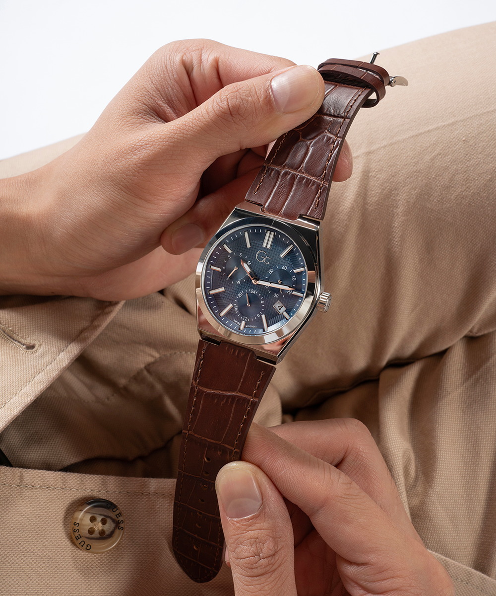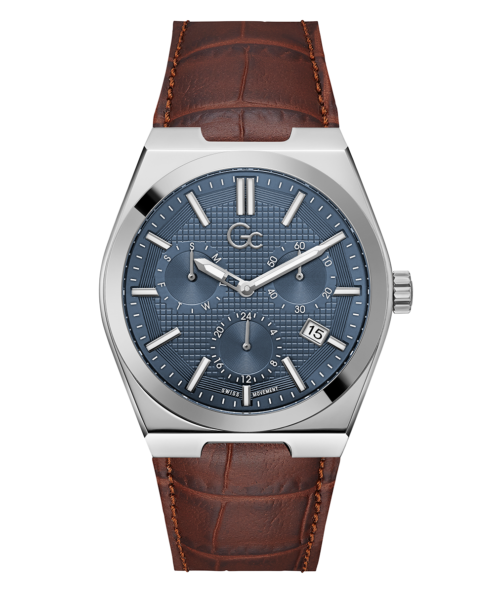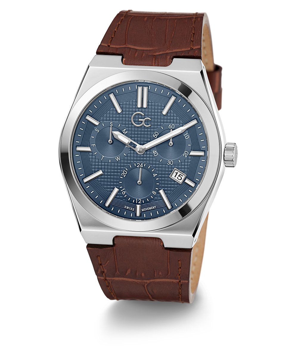 Showcase a sense of contemporary elegance with Gc Prodigy in size 44mm, featuring simply sophisticated lines and a highly detailed petrol blue dial with multifunction movement, on a silver tone version with tan brown croco-patterned strap.
