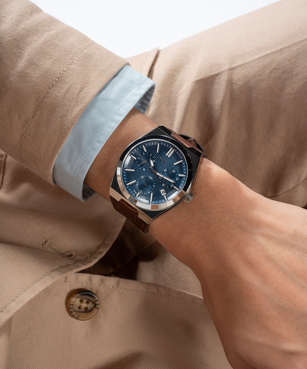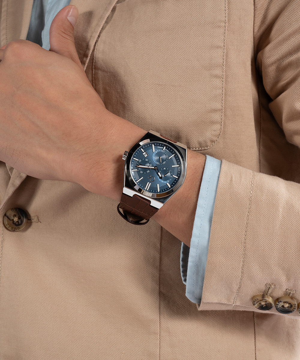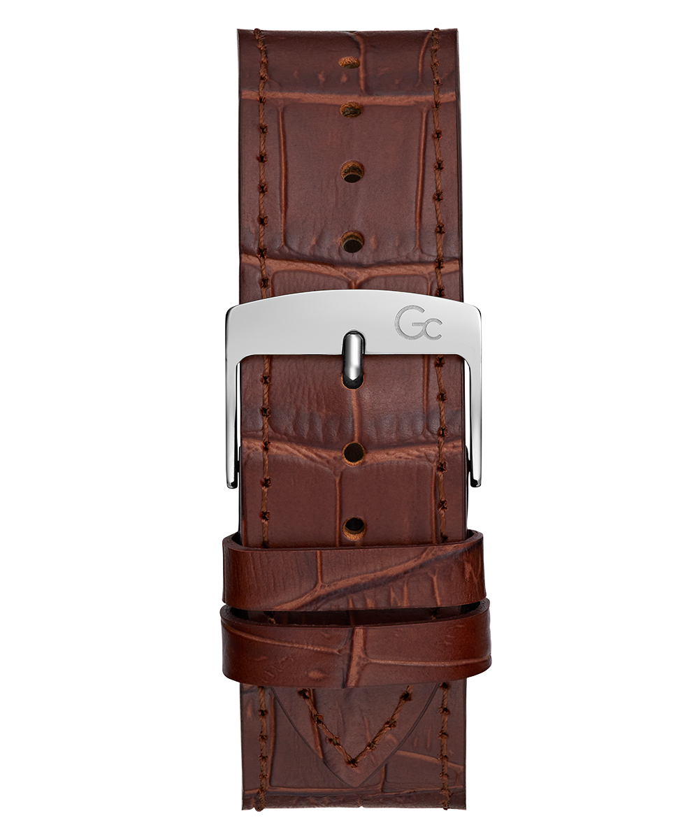 Showcase a sense of contemporary elegance with Gc Prodigy in size 44mm, featuring simply sophisticated lines and a highly detailed petrol blue dial with multifunction movement, on a silver tone version with tan brown croco-patterned strap.