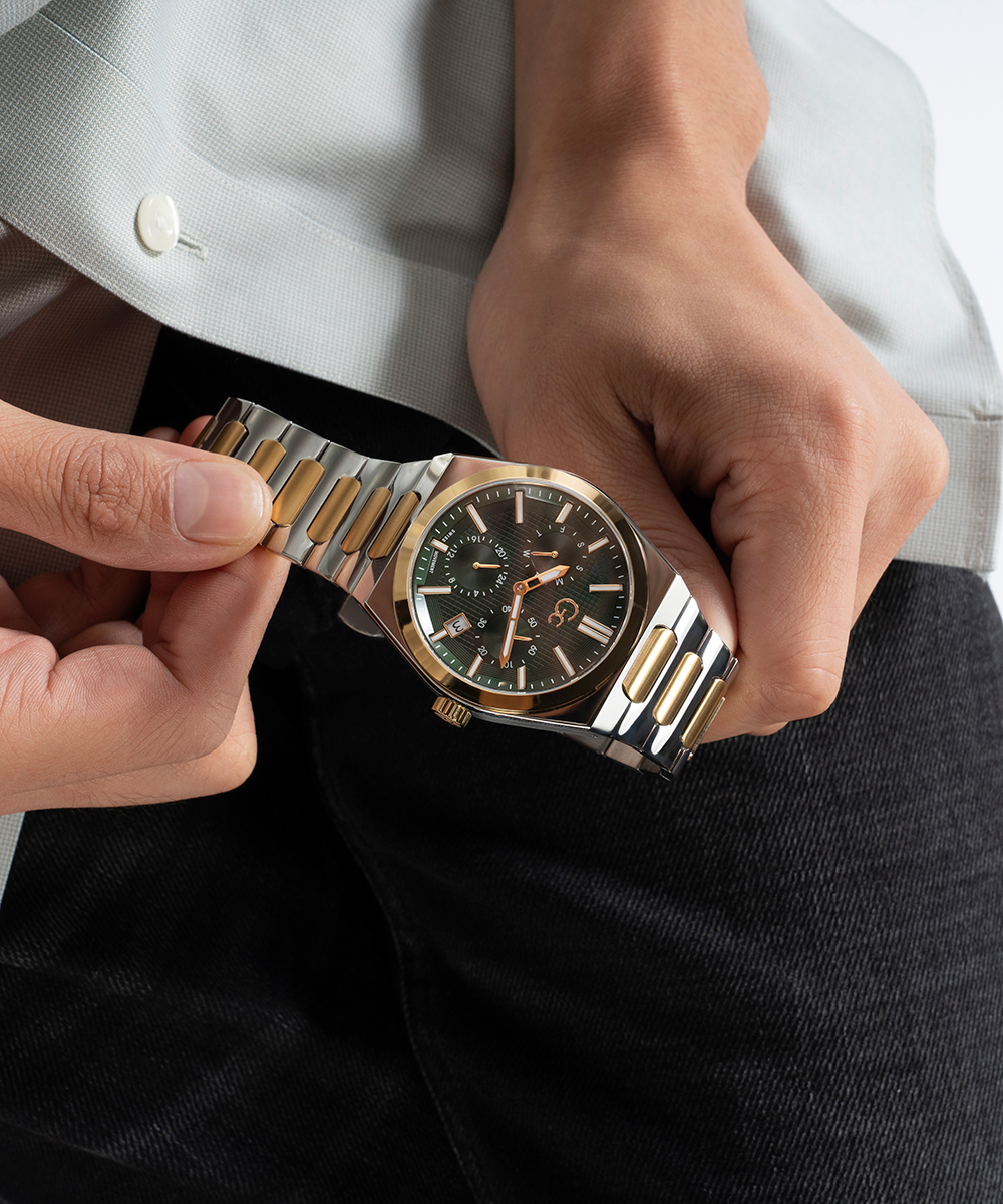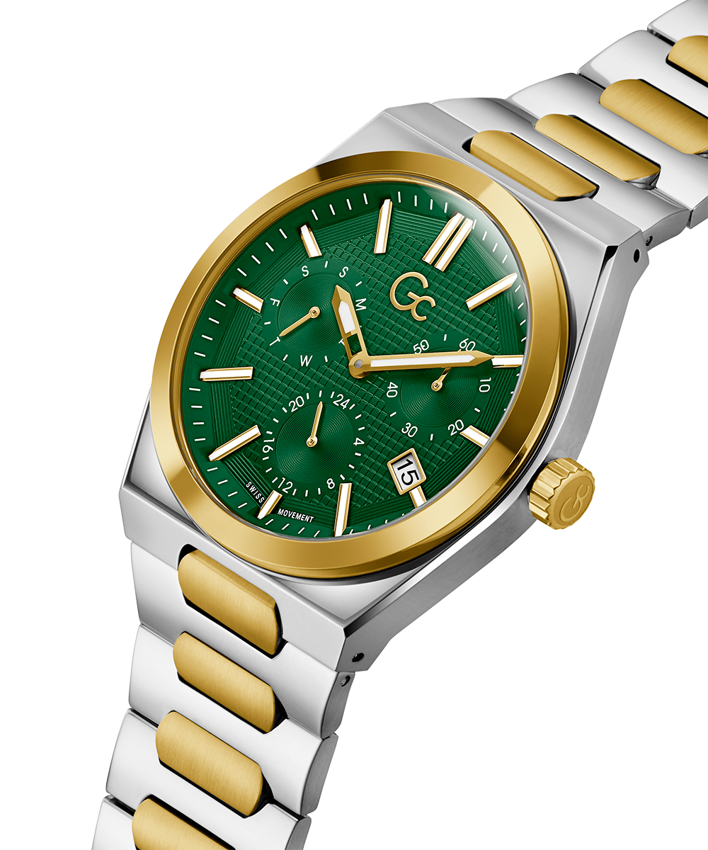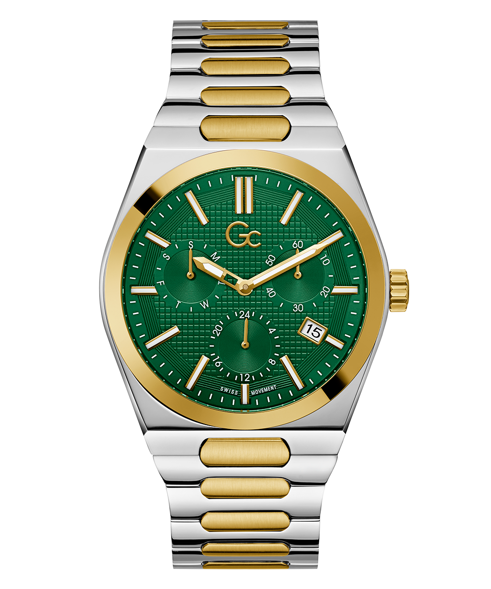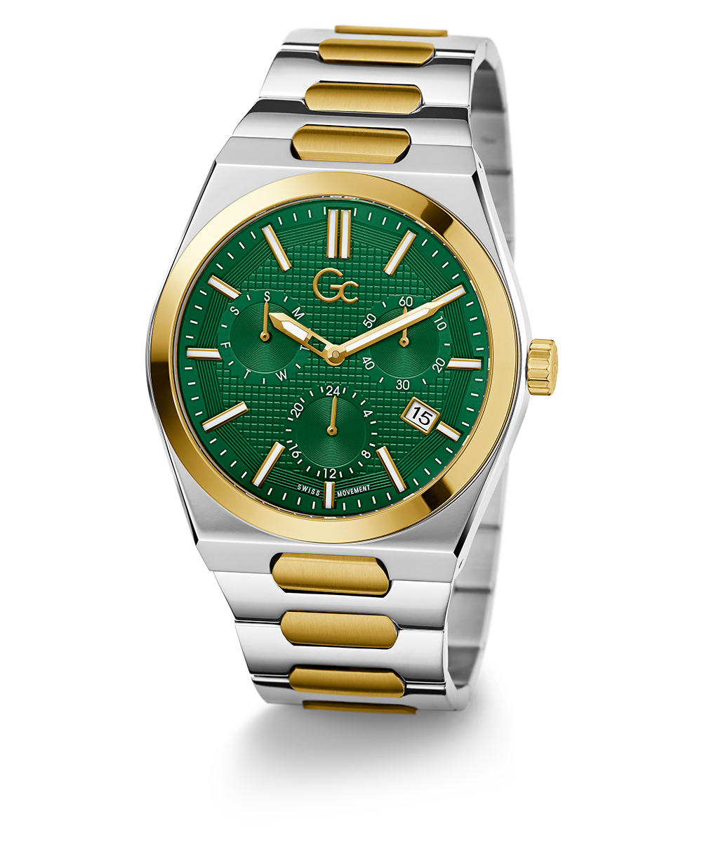 Showcase a sense of contemporary elegance with Gc Prodigy in size 44mm, featuring simply sophisticated lines and a highly detailed emerald green dial with multifunction movement, on a yellow gold and silver two-tone version.