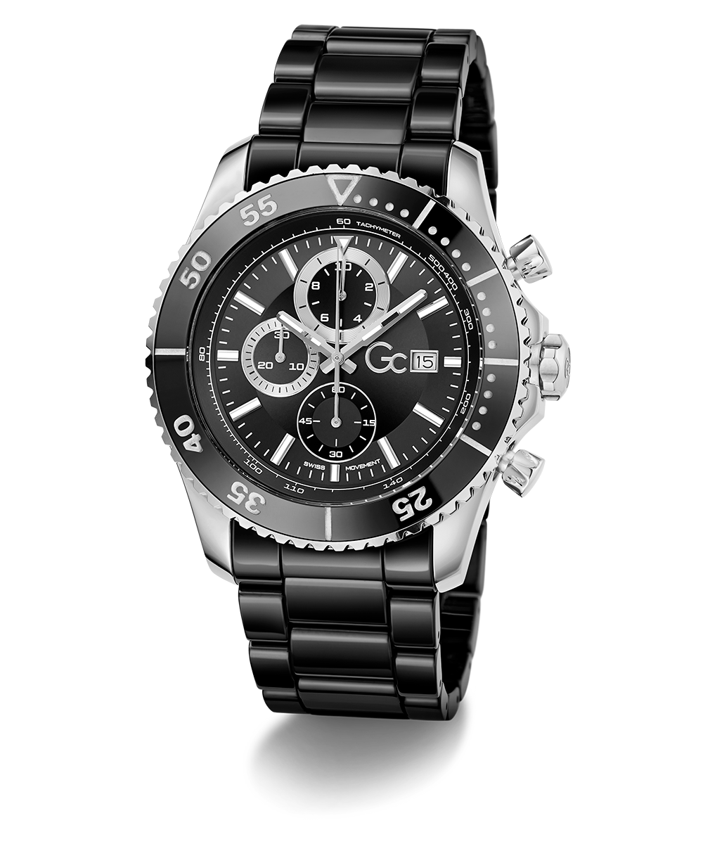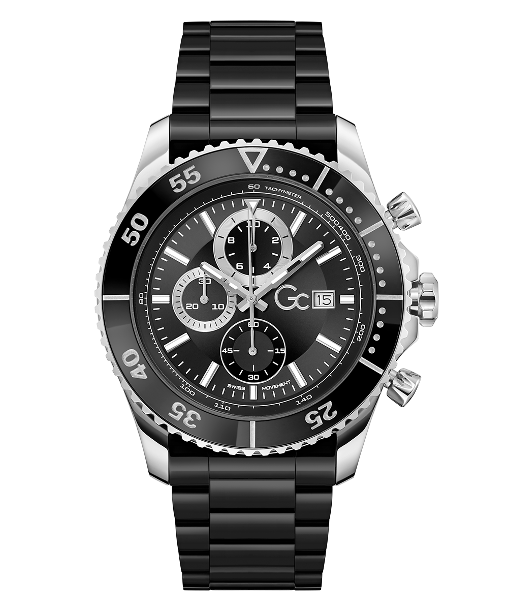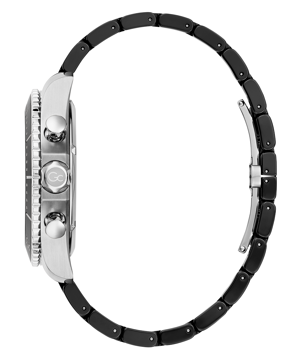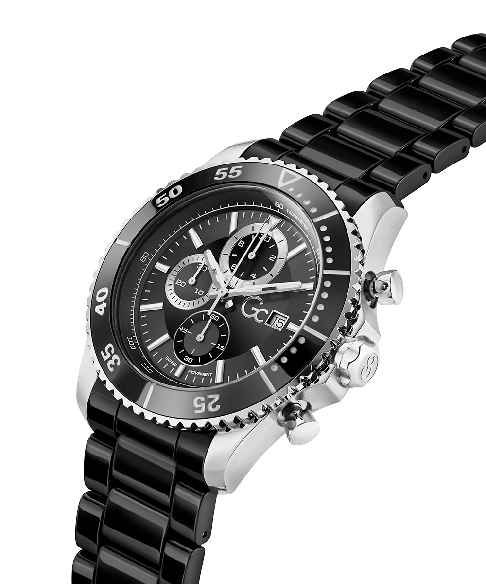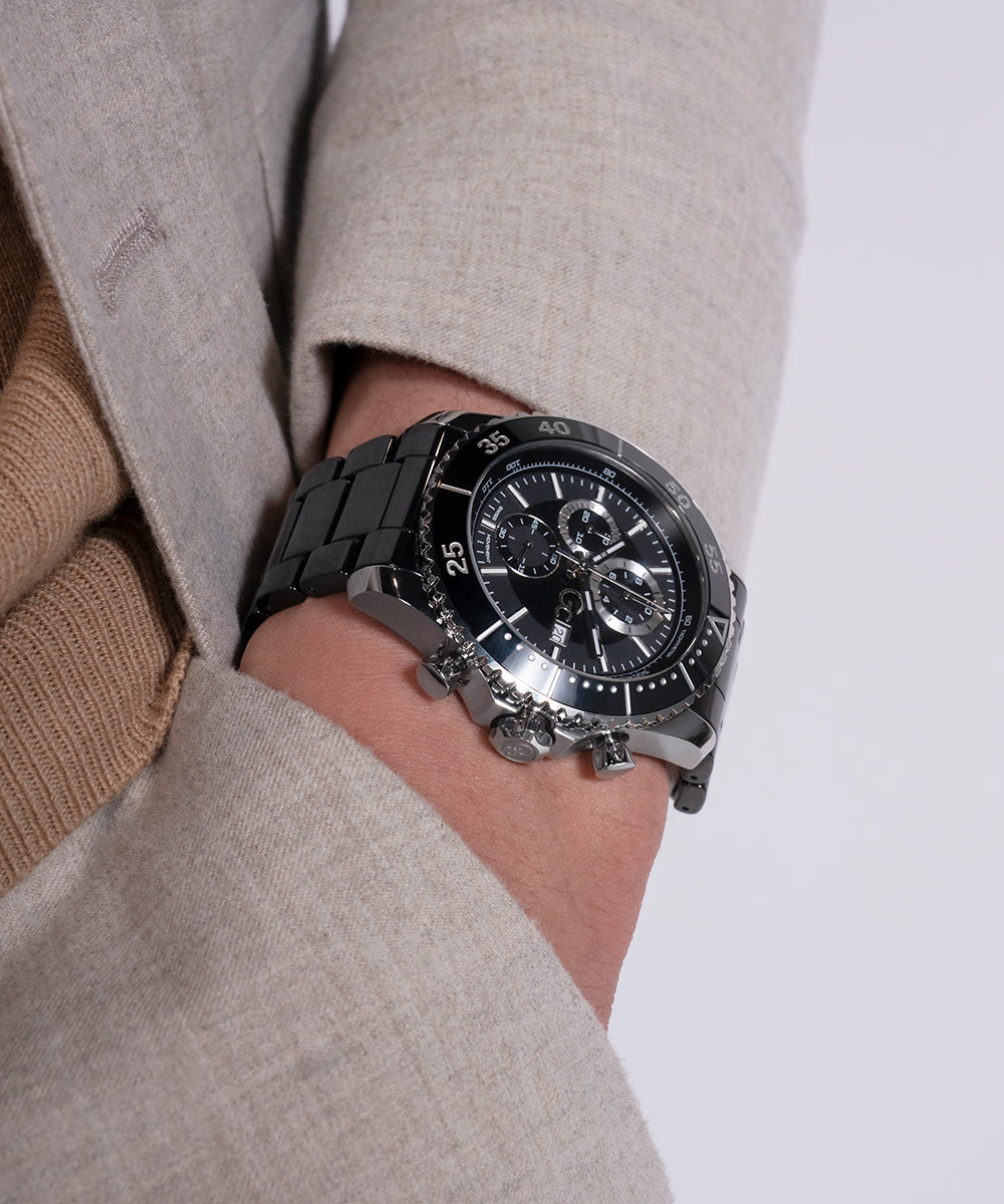 Go to the shopStand out boldly with this spectacular diver-look chronograph with polished black ceramic rotating top ring and full bracelet, with silver tone case. It hosts a stunning dial design with asymmetrical sub-dials.