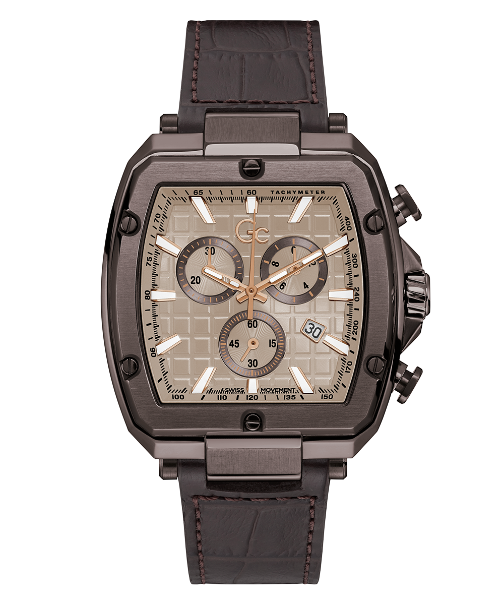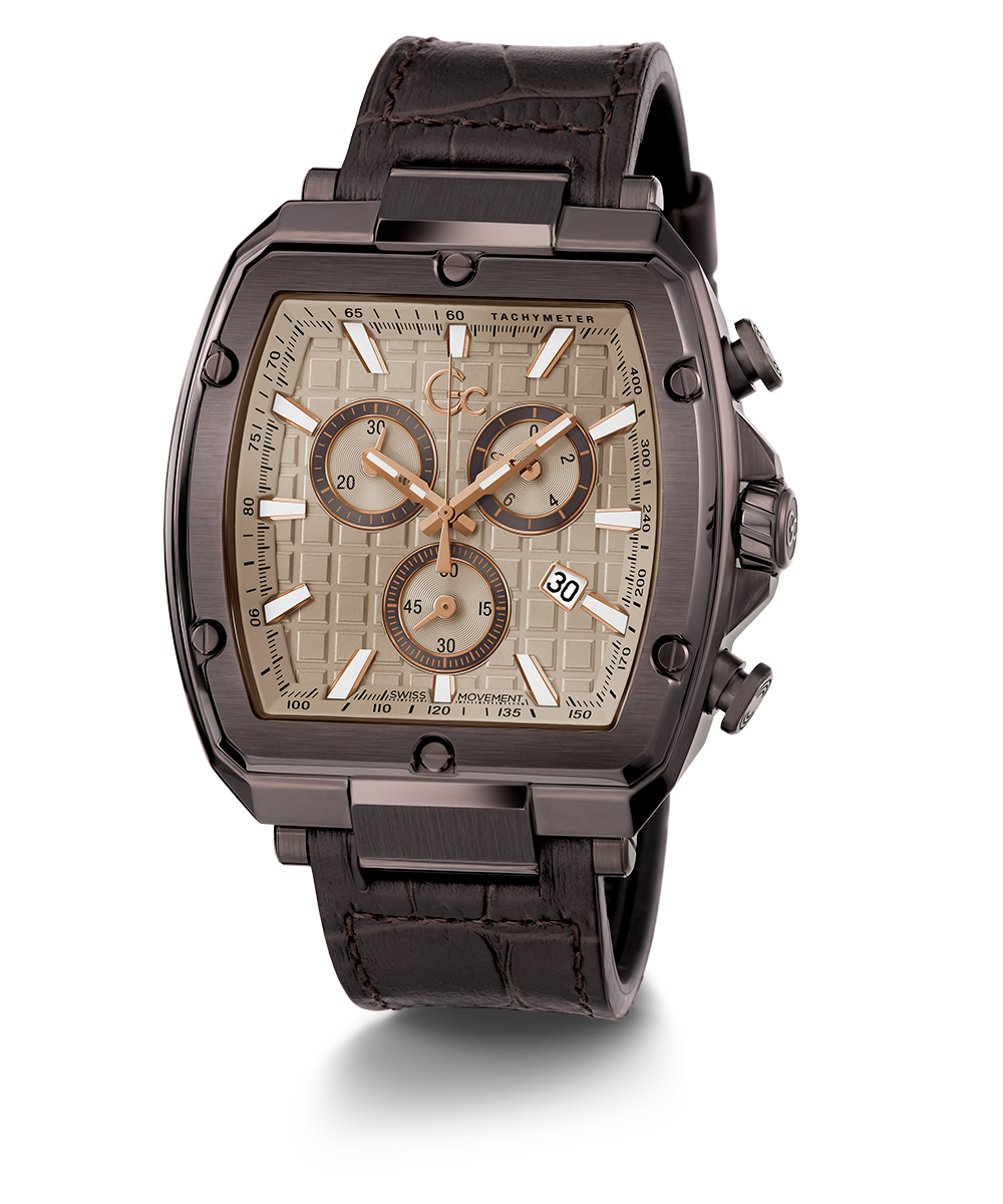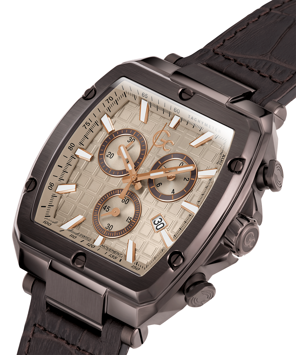 Square the circle with this tonneau chronograph. This style is highly detailed thanks to a beige square pattern dial set off by white indices, a brown PVD bezel with recognizable screw design details, on a smooth brown leather-coated silicone for maximum comfort.