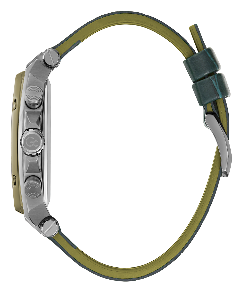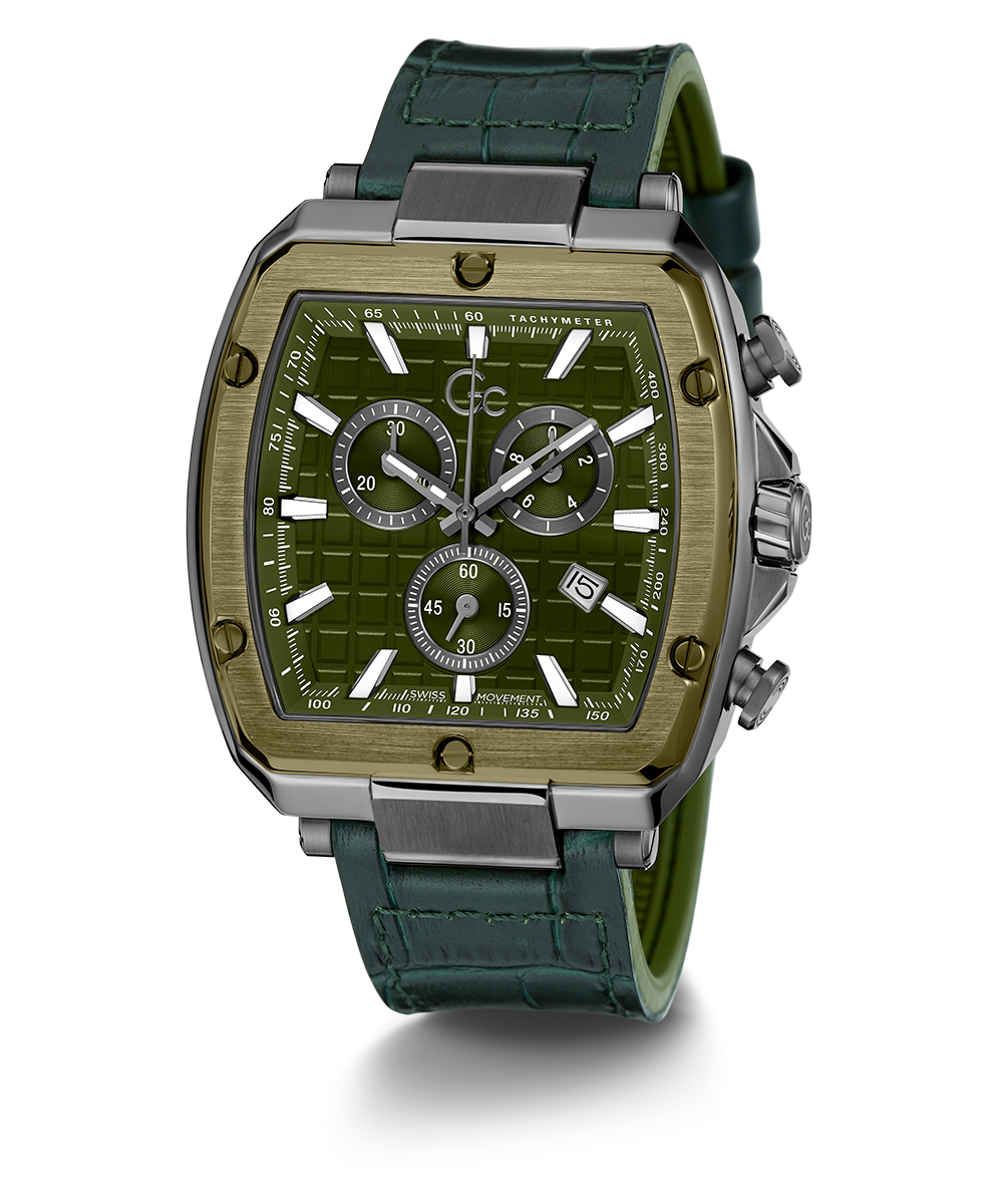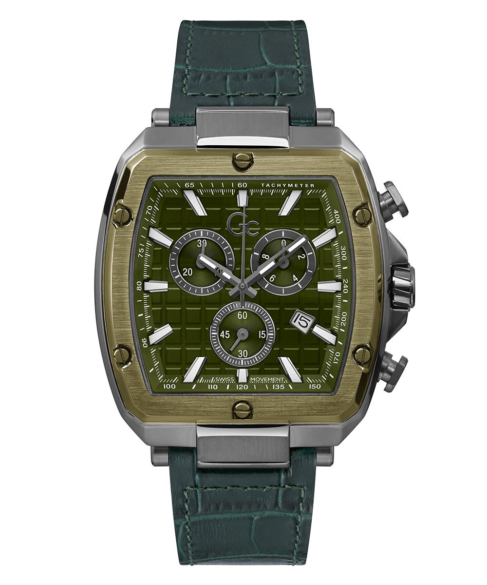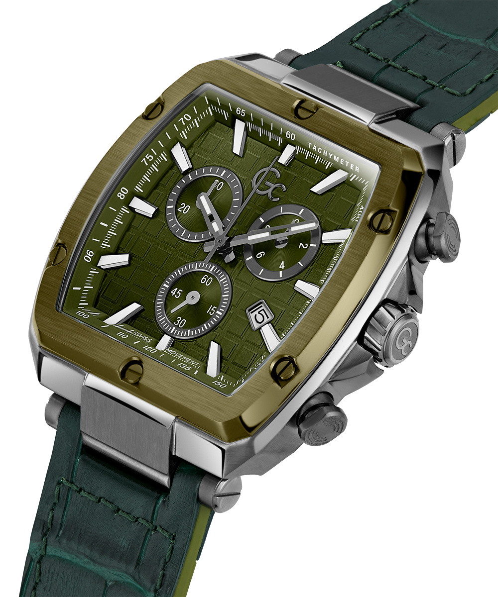 Square the circle with this tonneau chronograph - highly detailed with a moss green square pattern dial set off by white luminous indices, a unique moss green PVD bezel with recognizable screw design details, on a smooth moss green leather-coated silicone for maximum comfort.