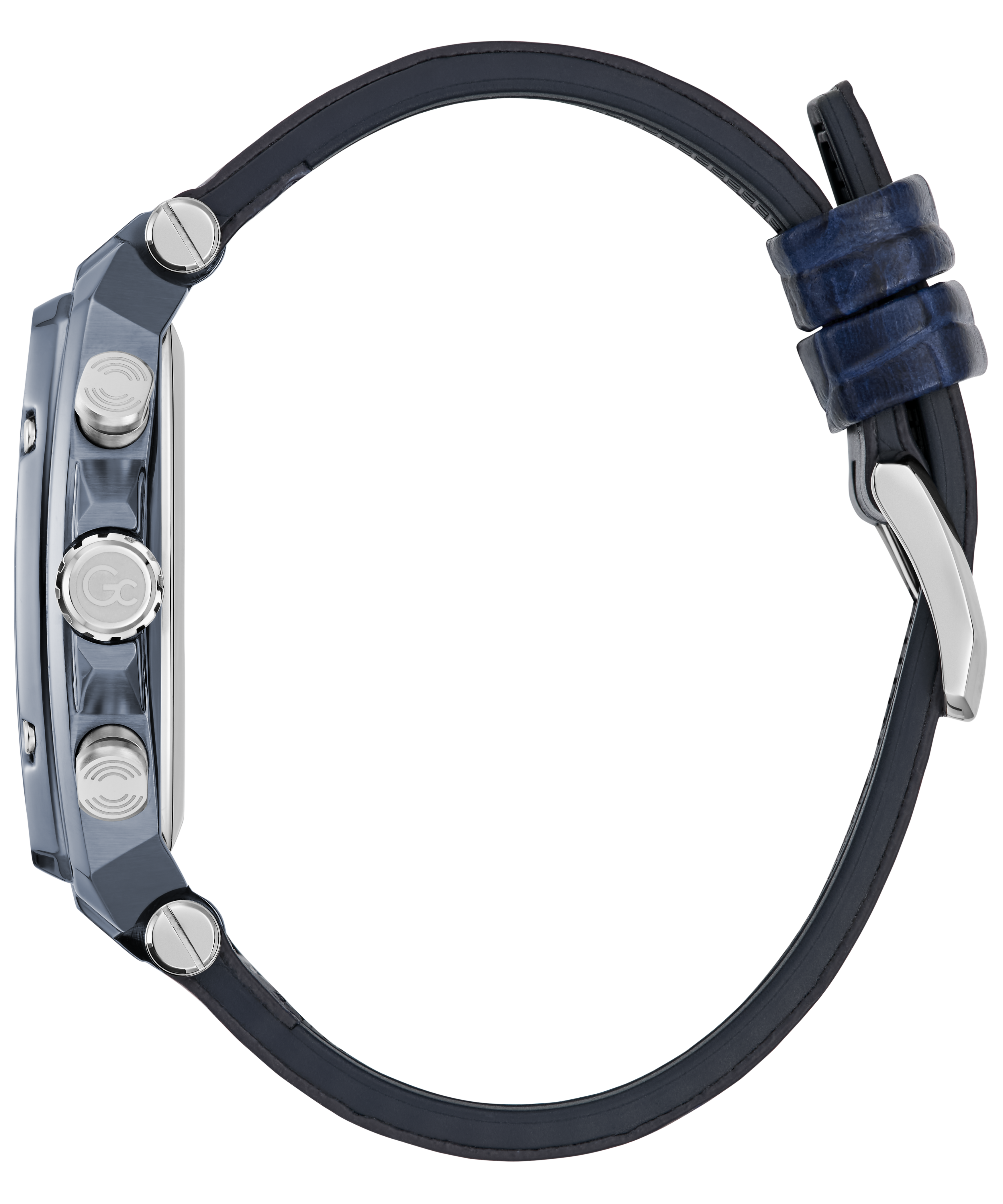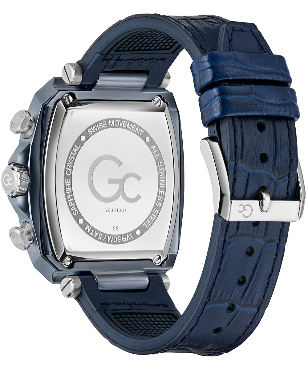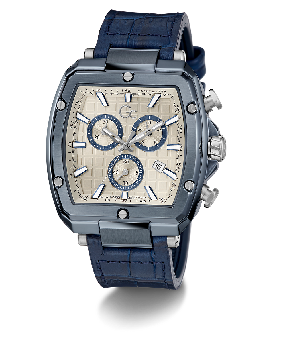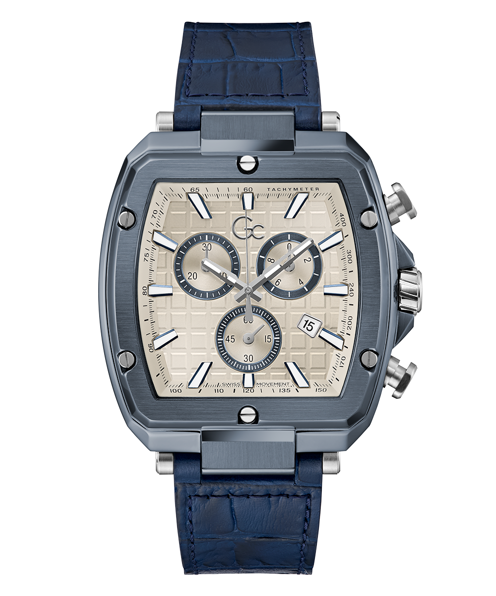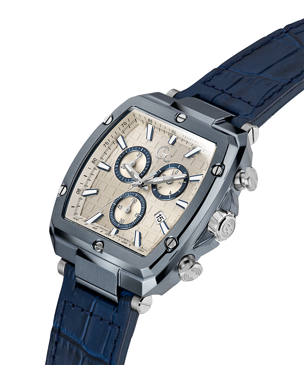 Square the circle with this tonneau chronograph. This style is highly detailed thanks to an off-white square pattern dial set off by stone blue details, a stylish stone blue PVD bezel with recognizable screw design details, on a croco-patterned blue leather-coated silicone for maximum comfort.