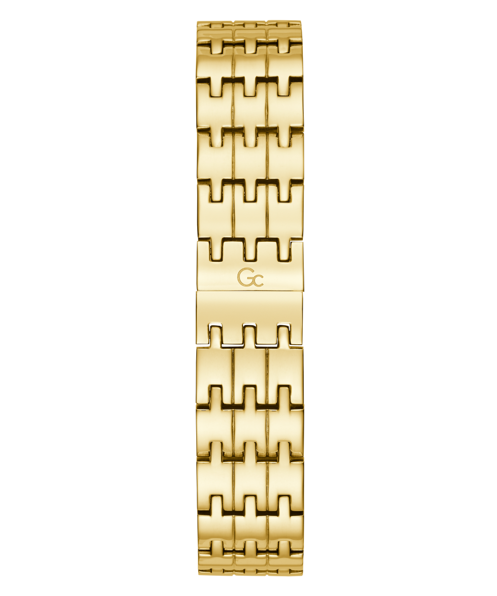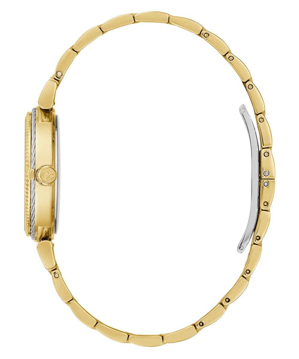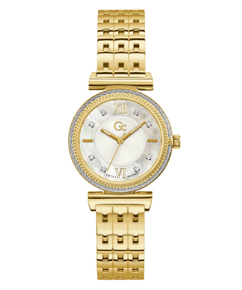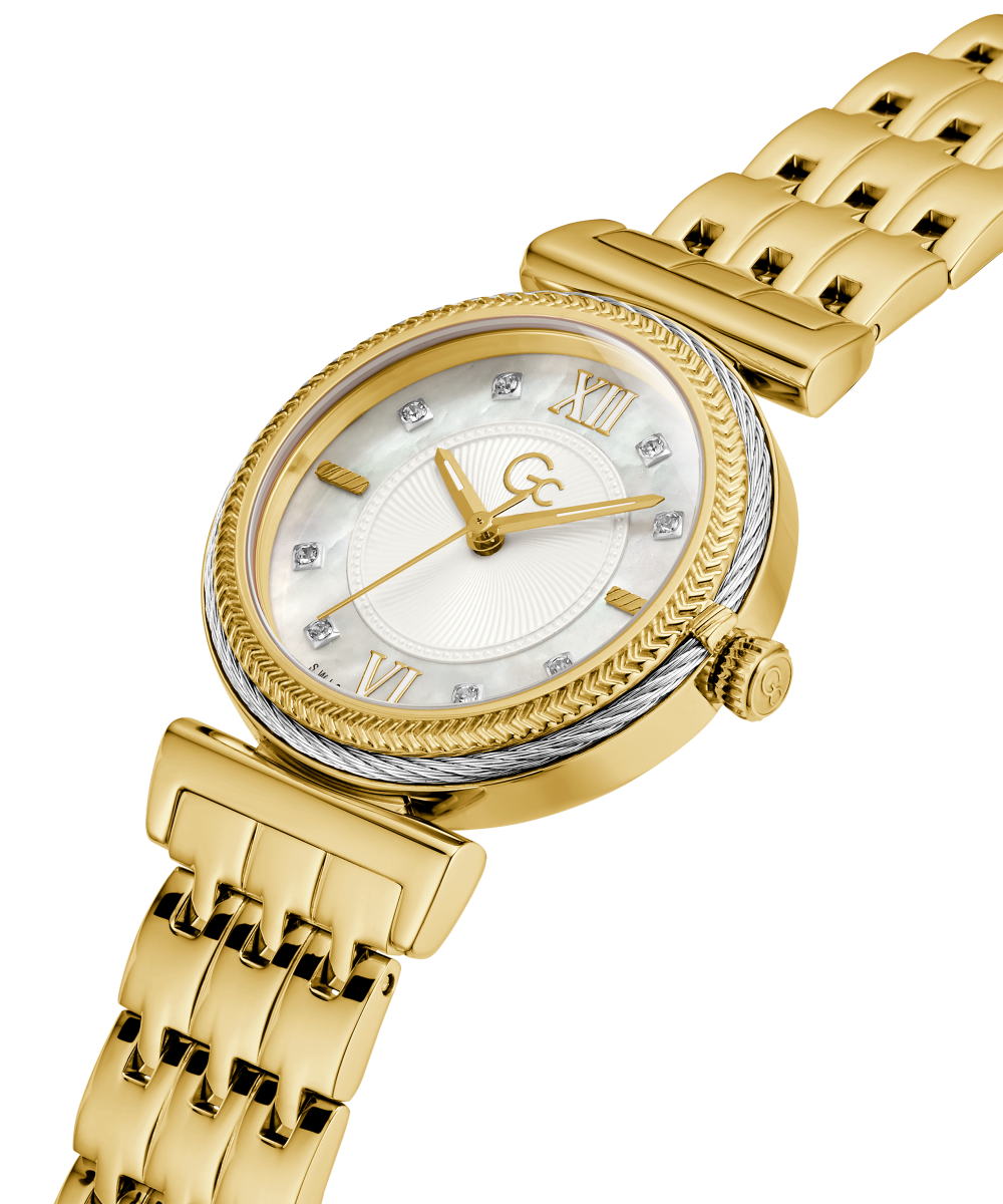 Elevate your look with touch of glamour in a yellow gold tone ladies' timepiece with a silver tone cable and textured detail on its bezel, elegant white mother-of-pearl dial, crystal indices and triple-link polished bracelet.