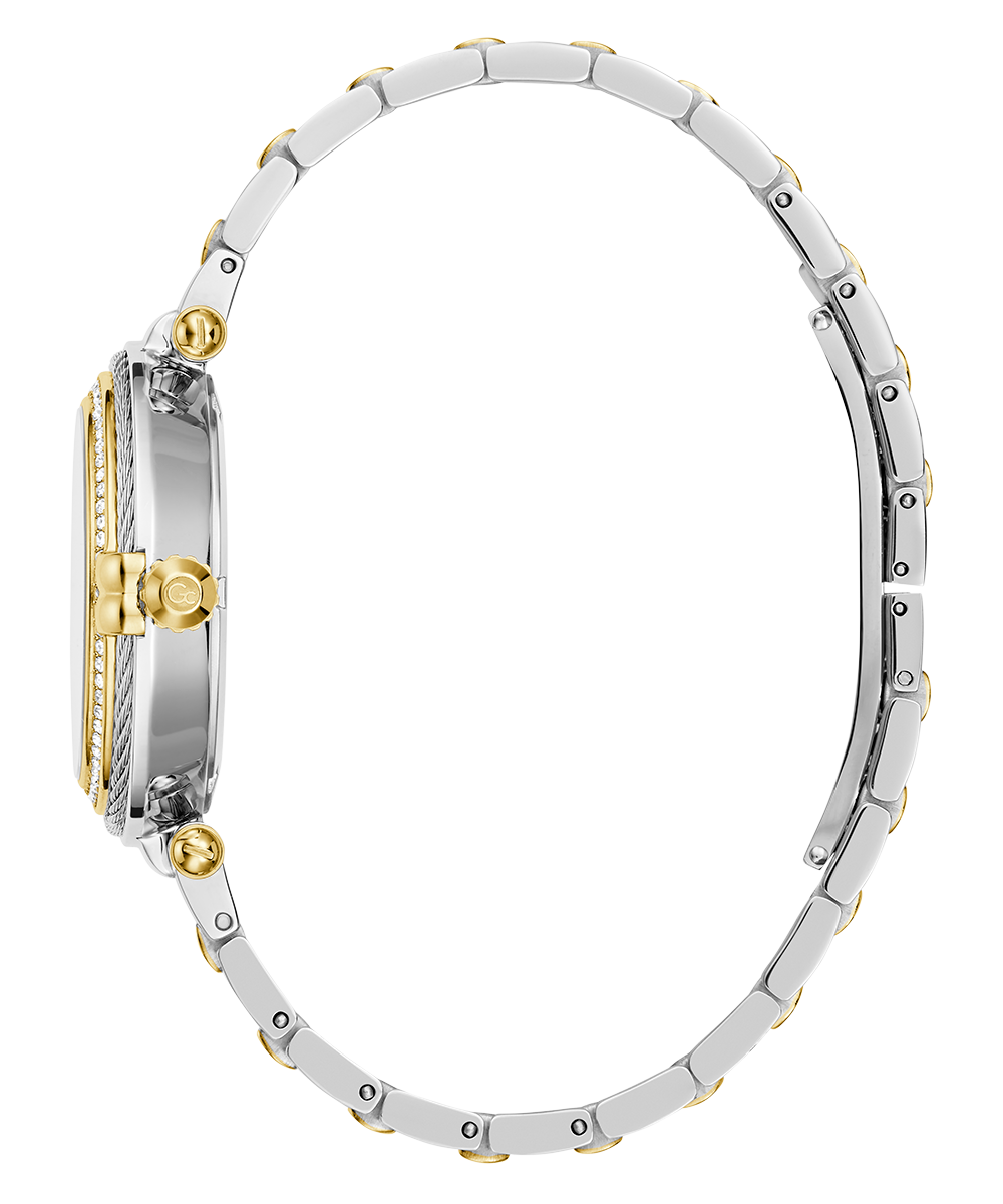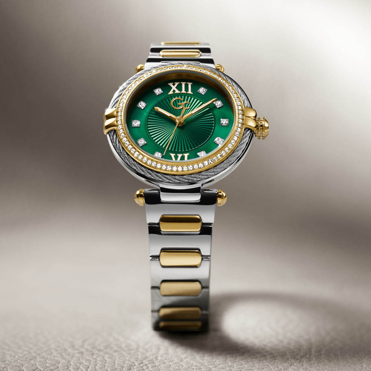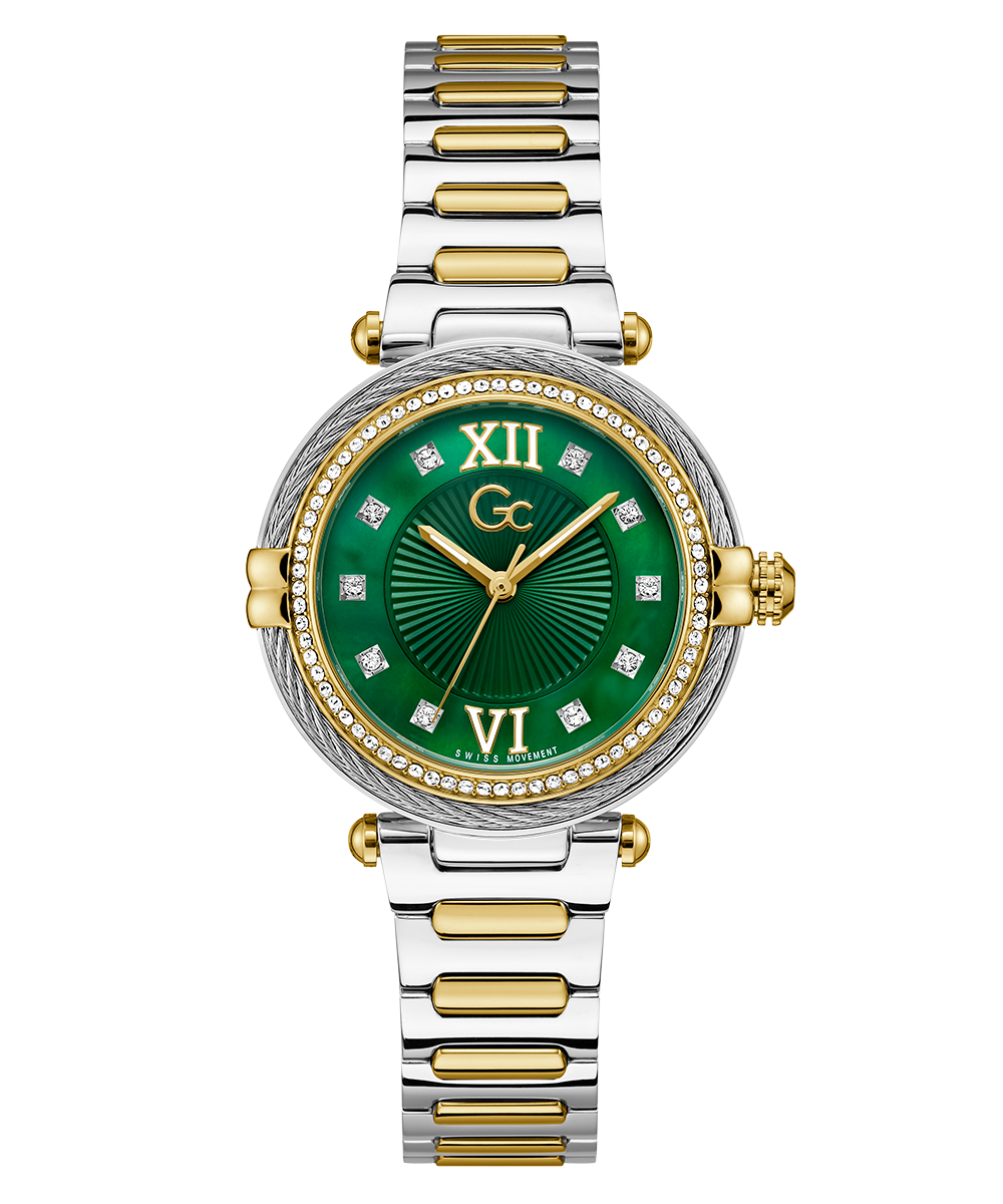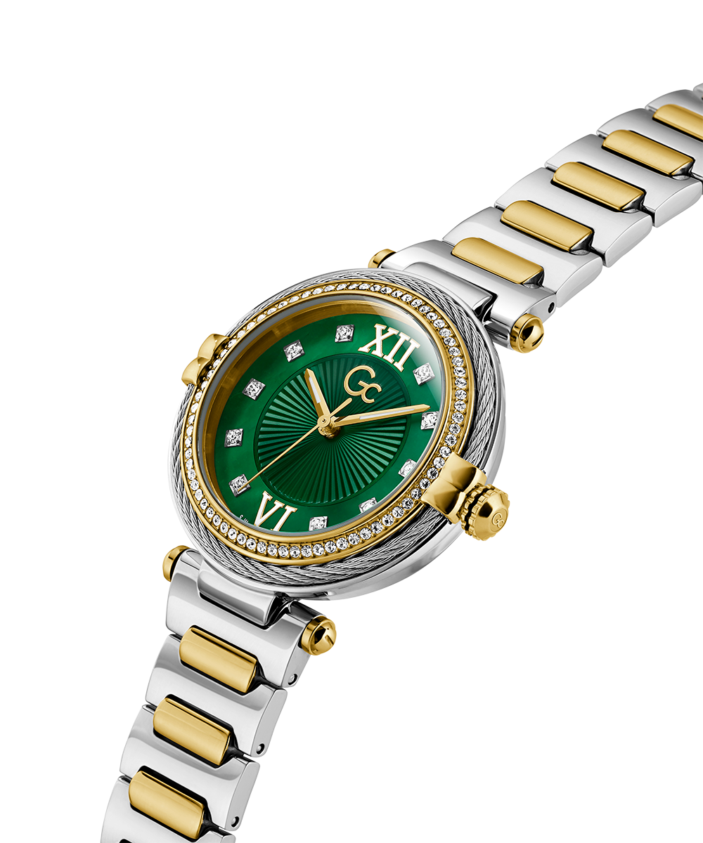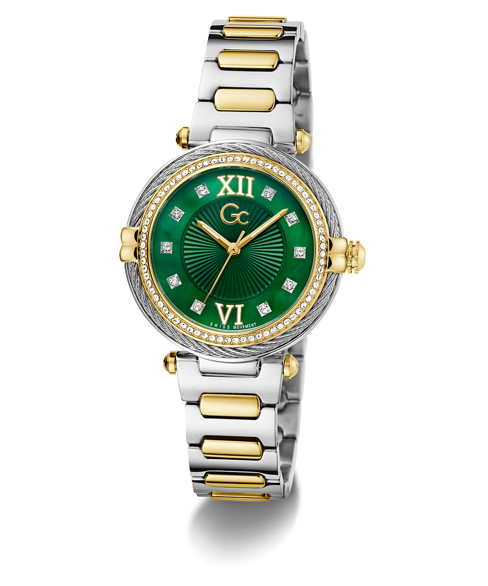 A classy allure for the Gc Vogue Cable, which offers a beautiful case combining the sparkle of genuine cable with the crystals on the top ring, and a radiant eco-friendly green mother-of-pearl dial. The bracelet is elegantly contemporary, making the overall look very sophisticated, in a silver and yellow gold...
