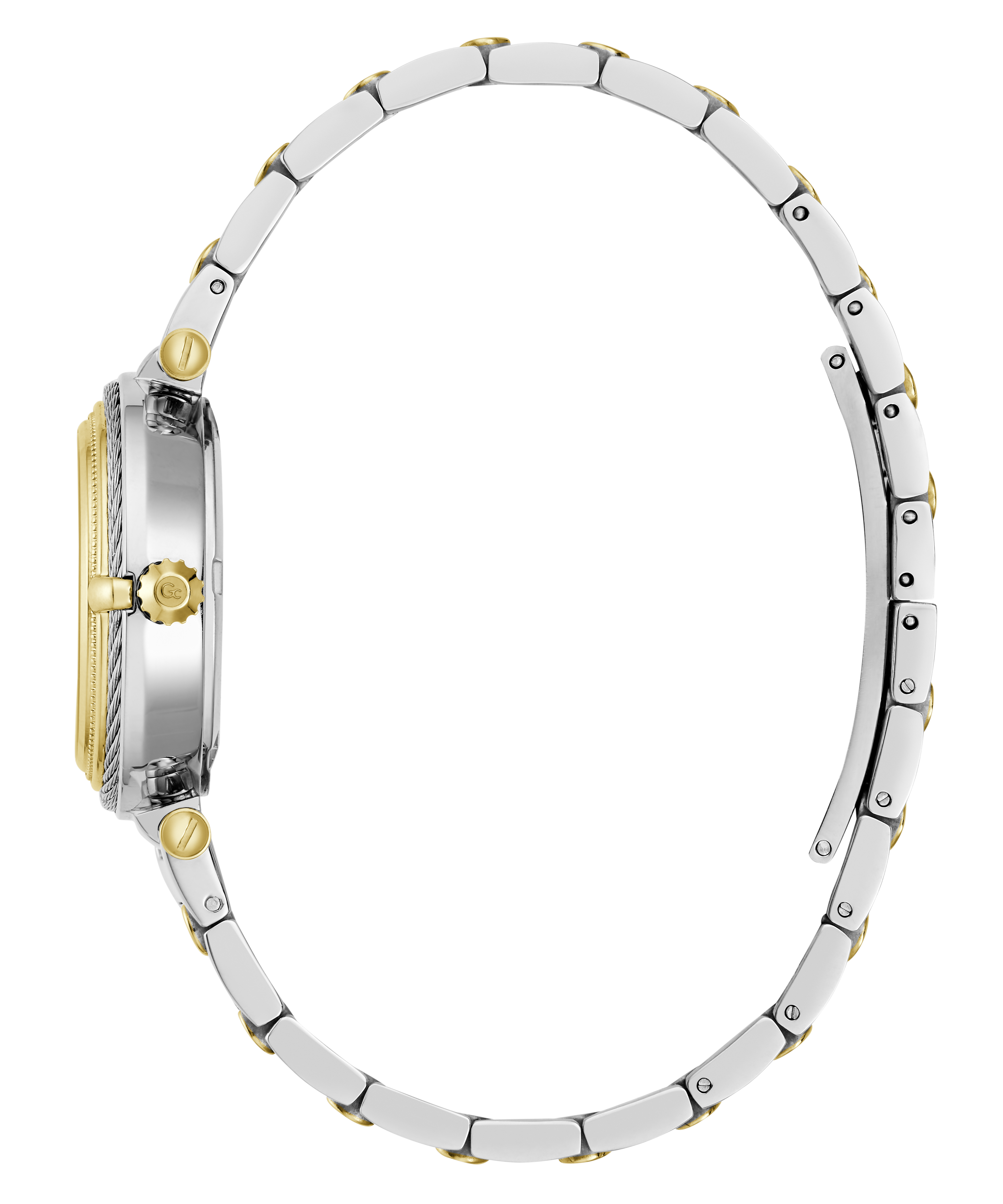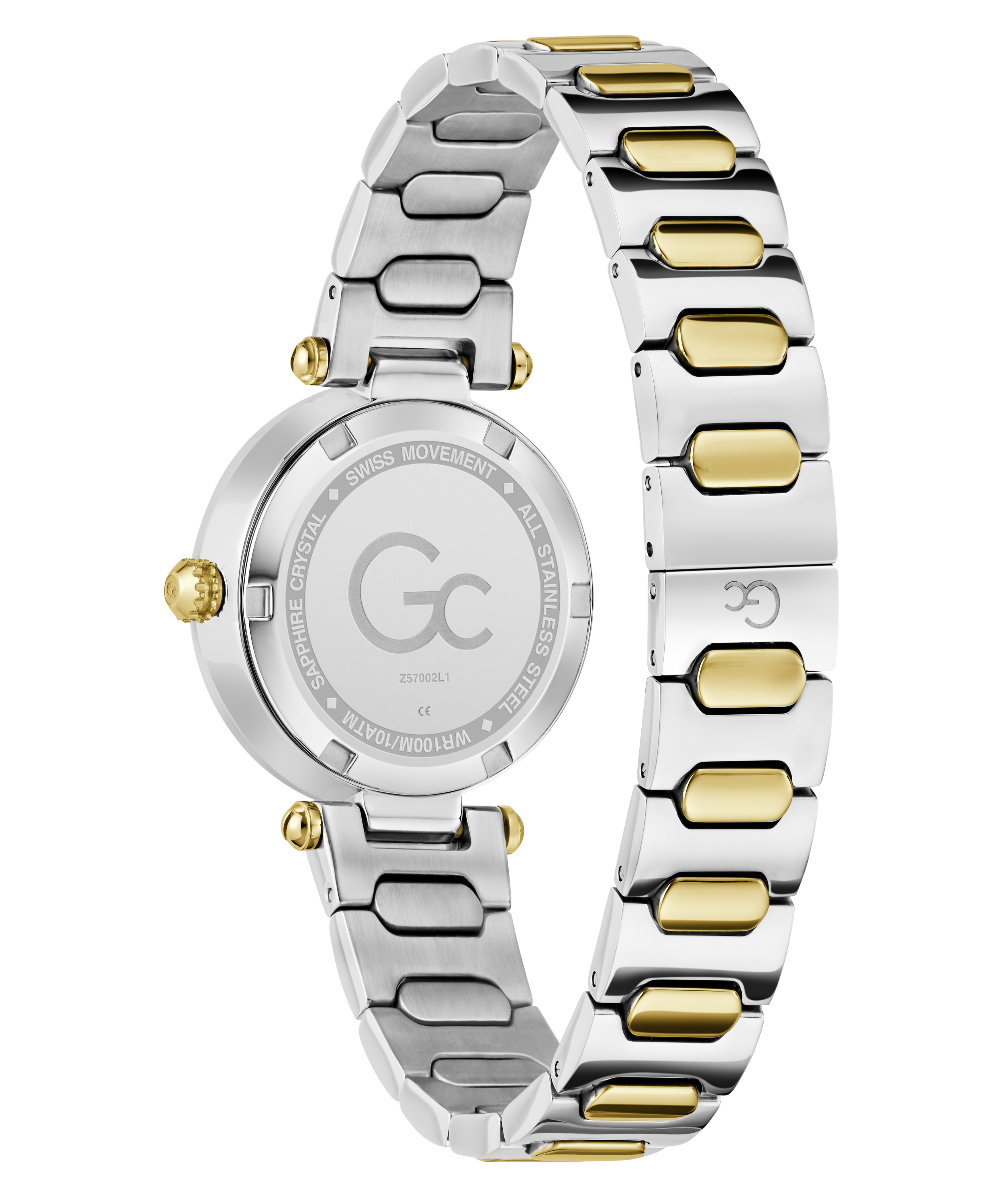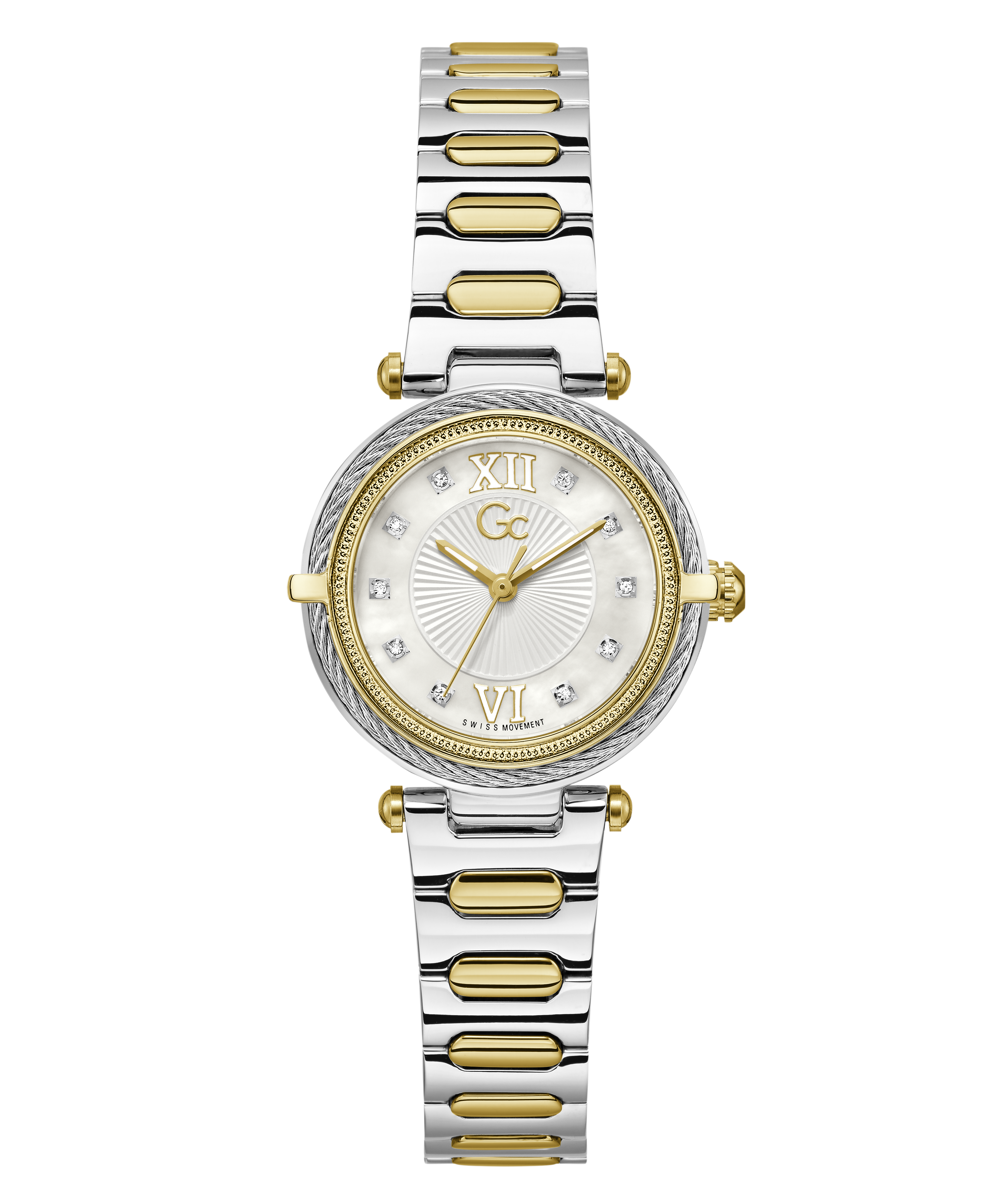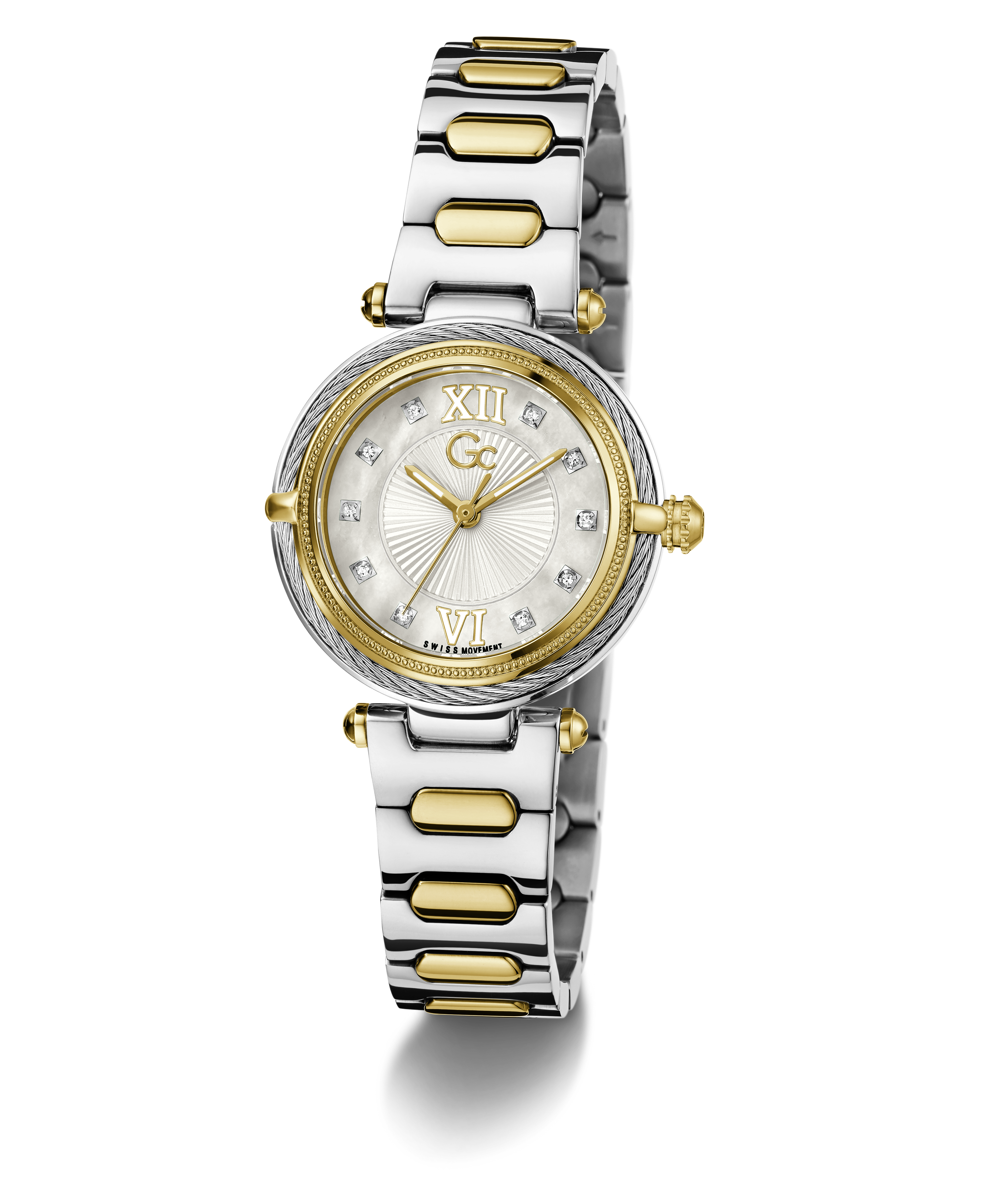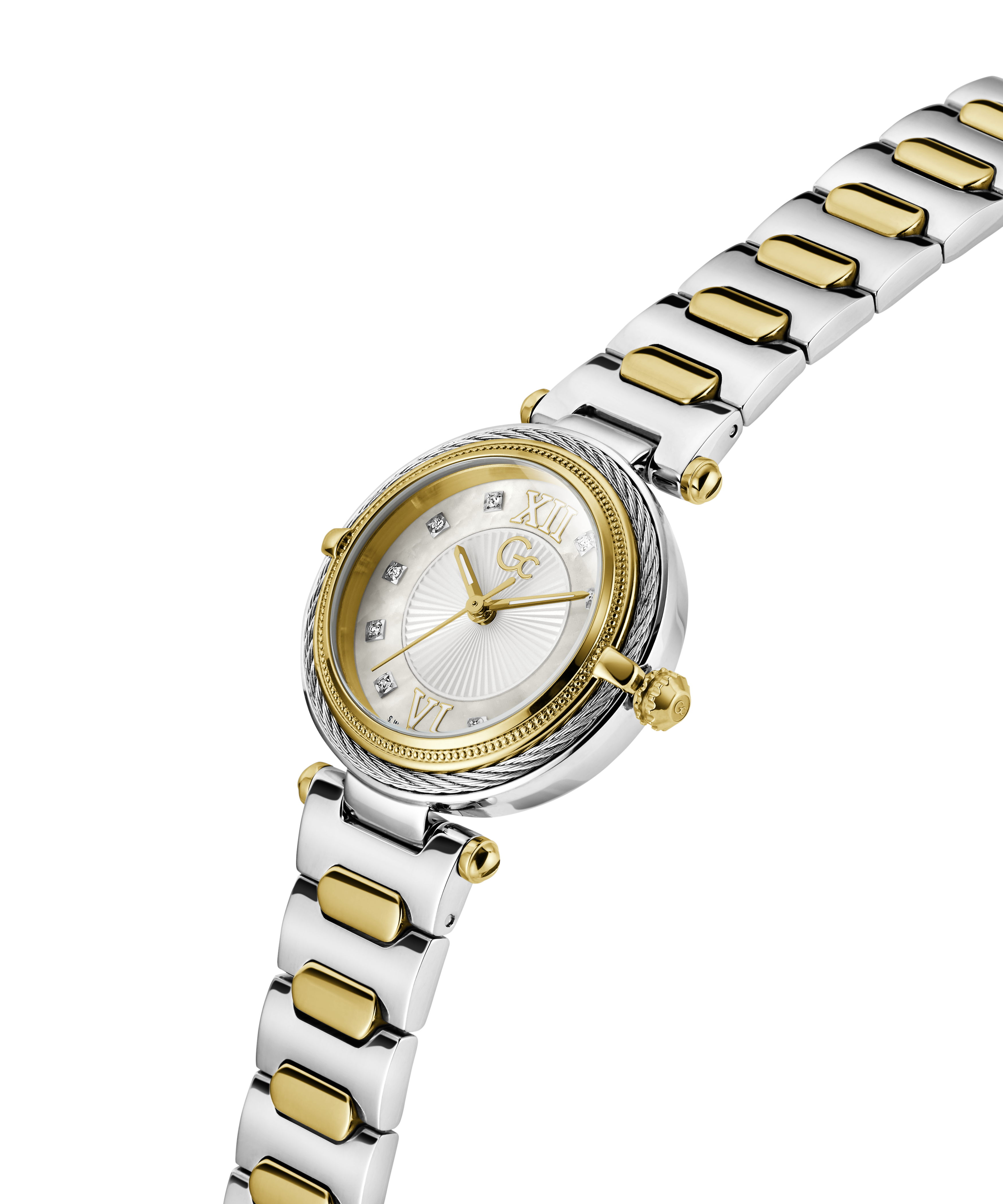 An elegant allure for the mini Gc Vogue Cable, which offers a beautiful 30mm case combining the sparkle of genuine cable with a radiant eco-friendly white mother-of-pearl and textured dial. The bracelet is elegantly contemporary, making the overall look very sophisticated, in a silver and soft yellow gold PVD version.