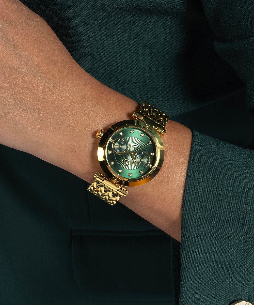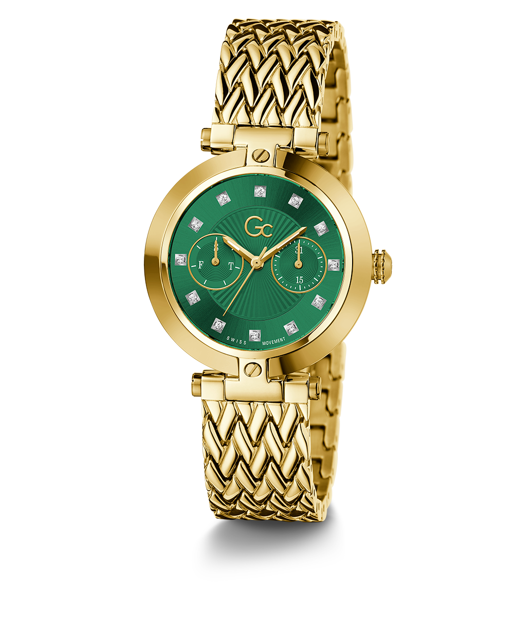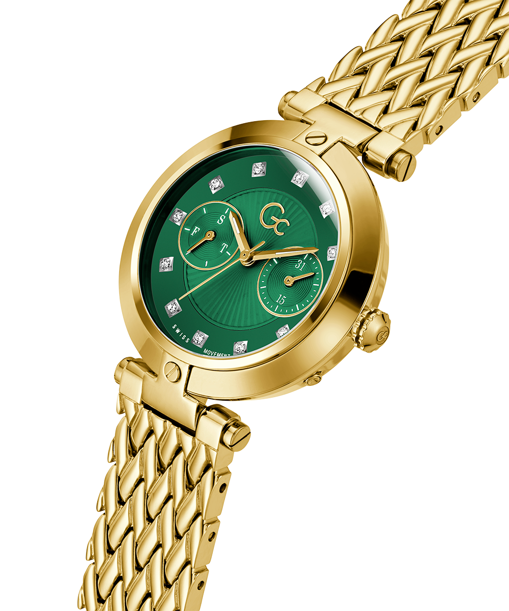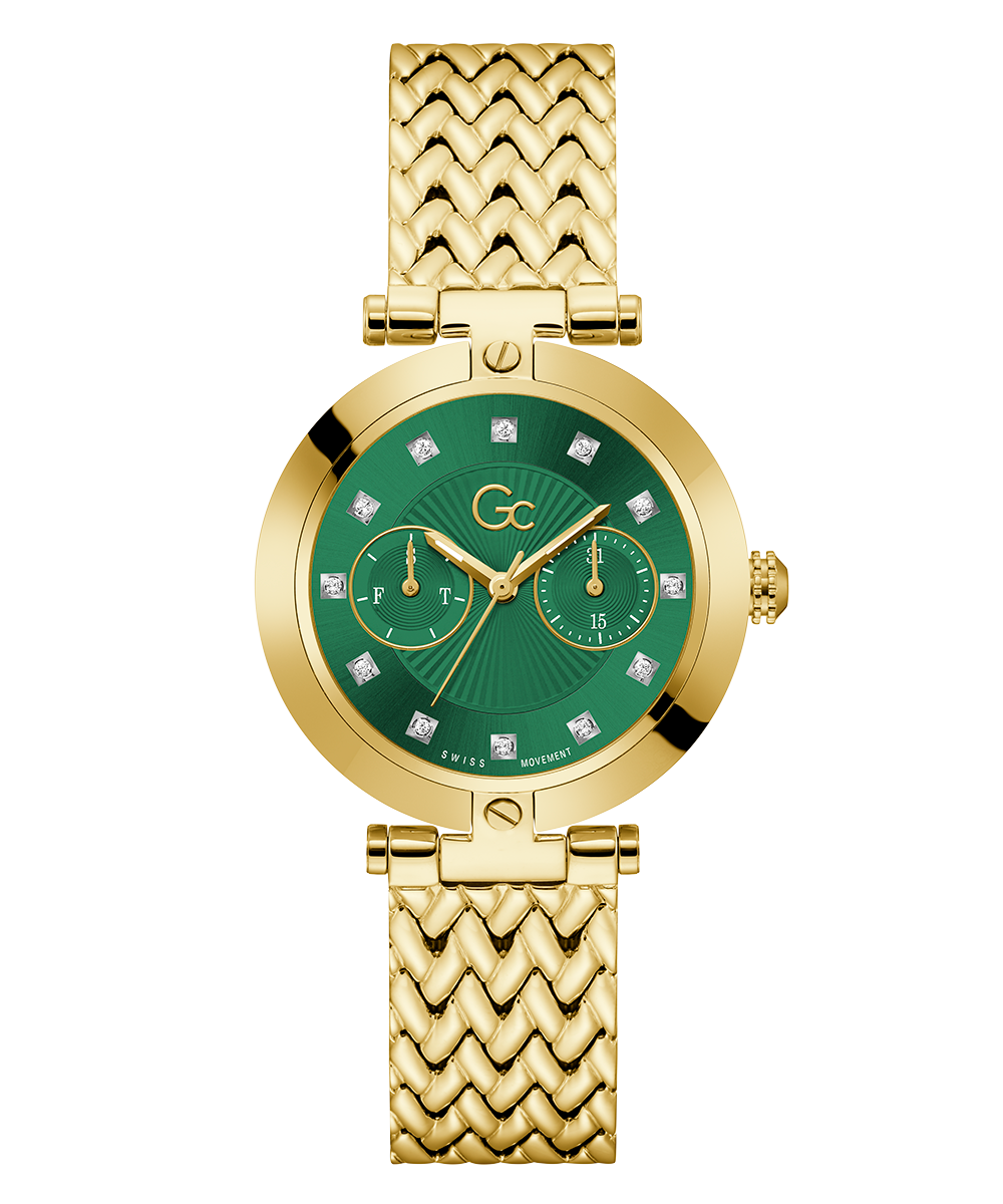 Go to the shopThe Gc Vogue features a 36.5mm case and a high-class bracelet with a jewelry touch, all in full yellow gold PVD, and a trendy emerald green sunray dial. It hosts a day/date movement with 2 counters.