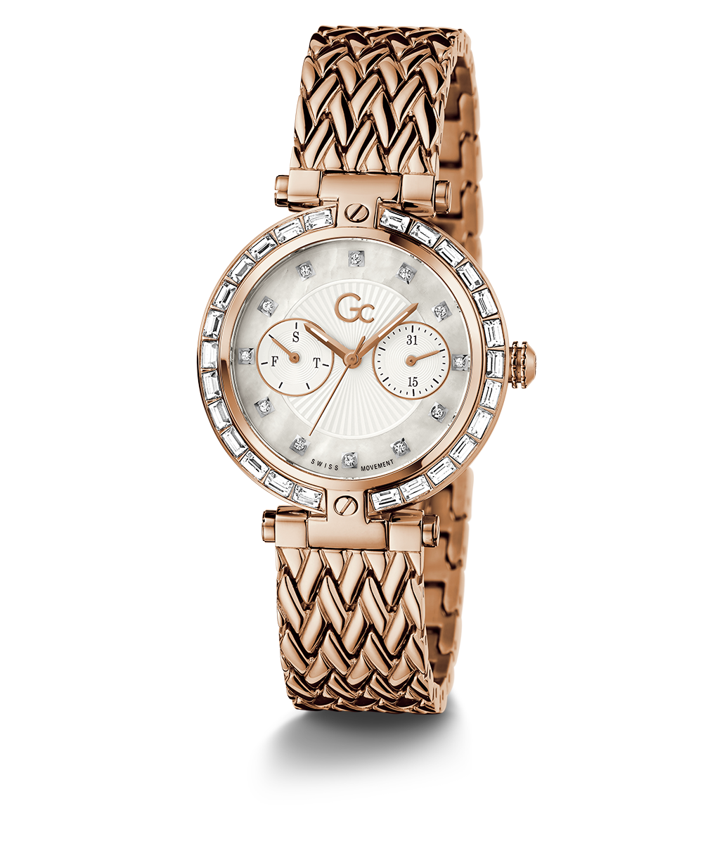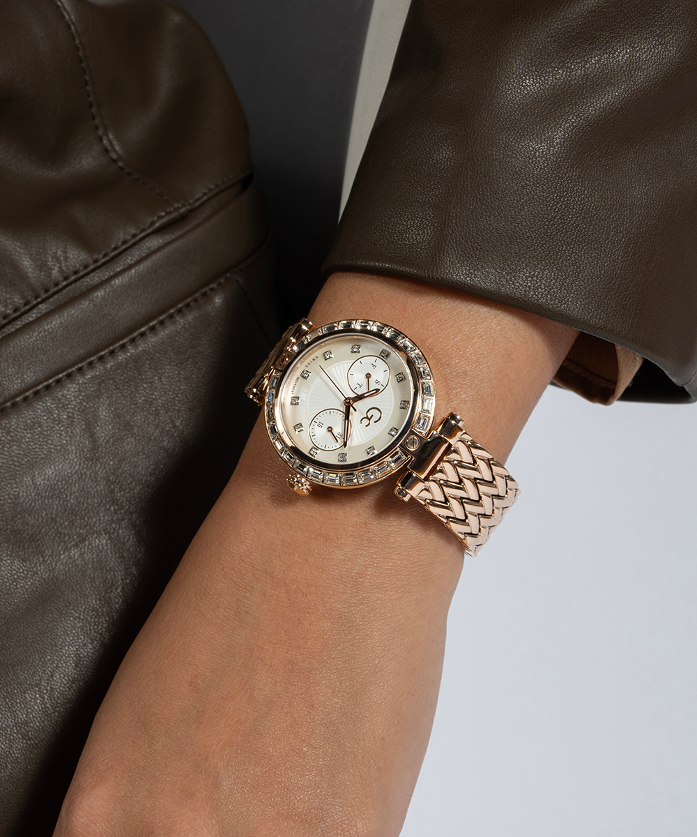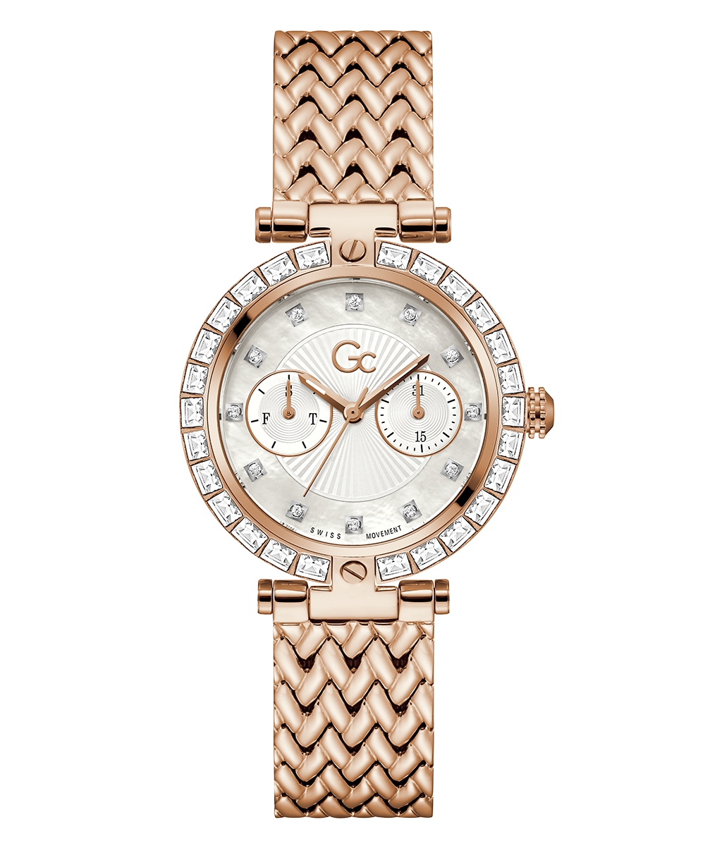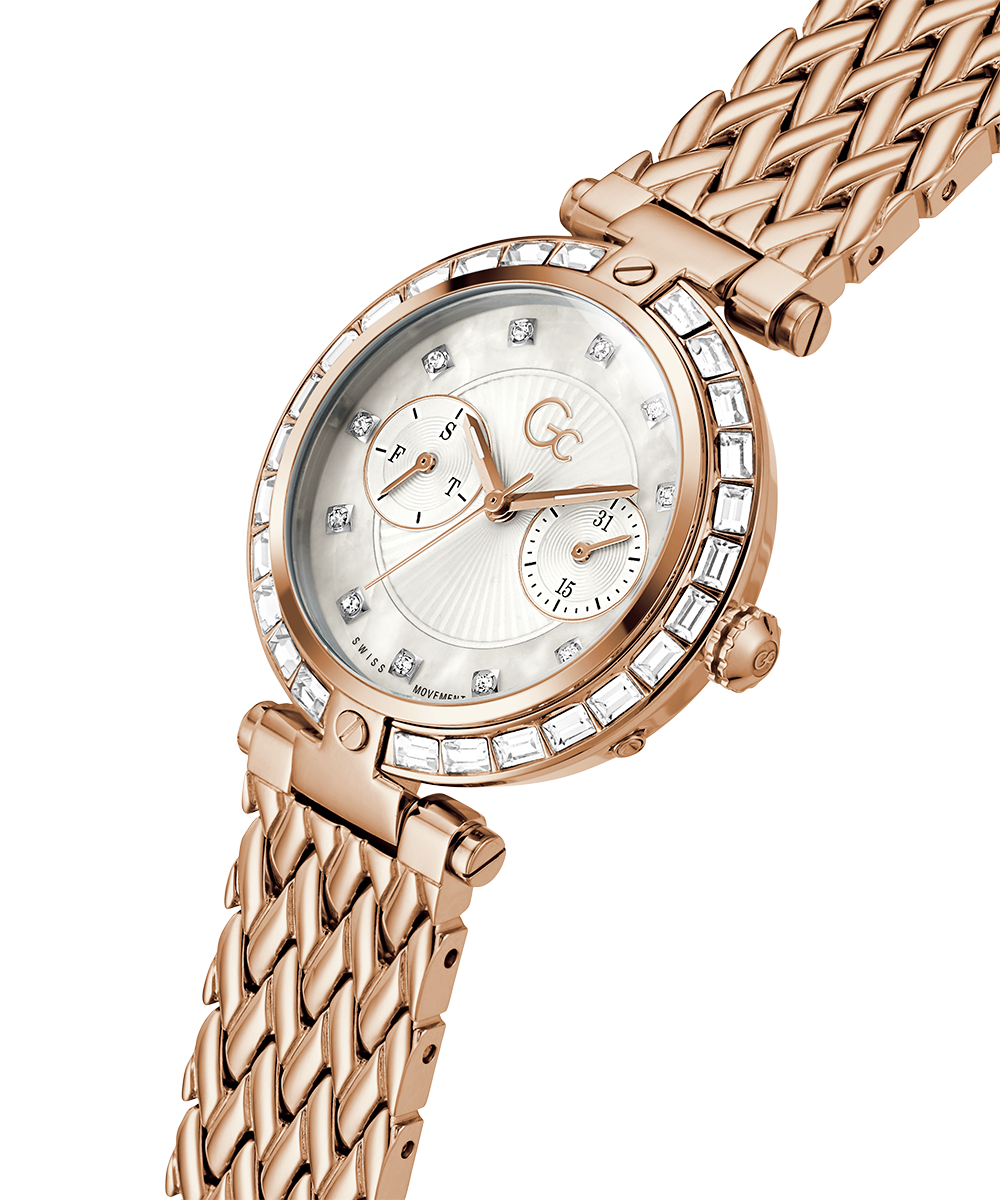 The Gc Vogue features a 36.5mm case adorned with baguette crystals and a high-class bracelet with a jewelry touch, all in full rose gold PVD, and an eco-friendly white mother-of-pearl dial. It hosts a day/date movement with 2 counters.