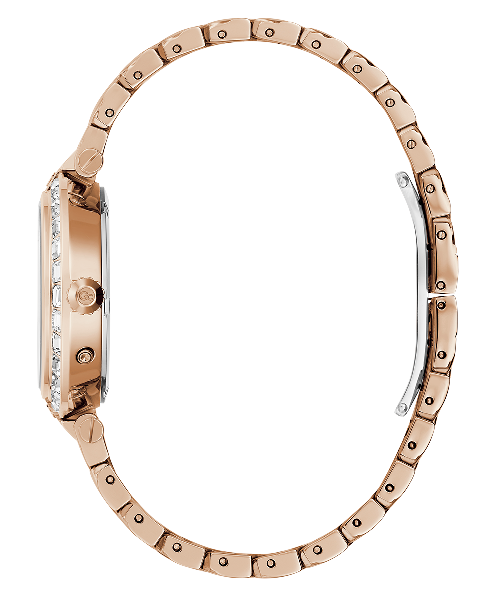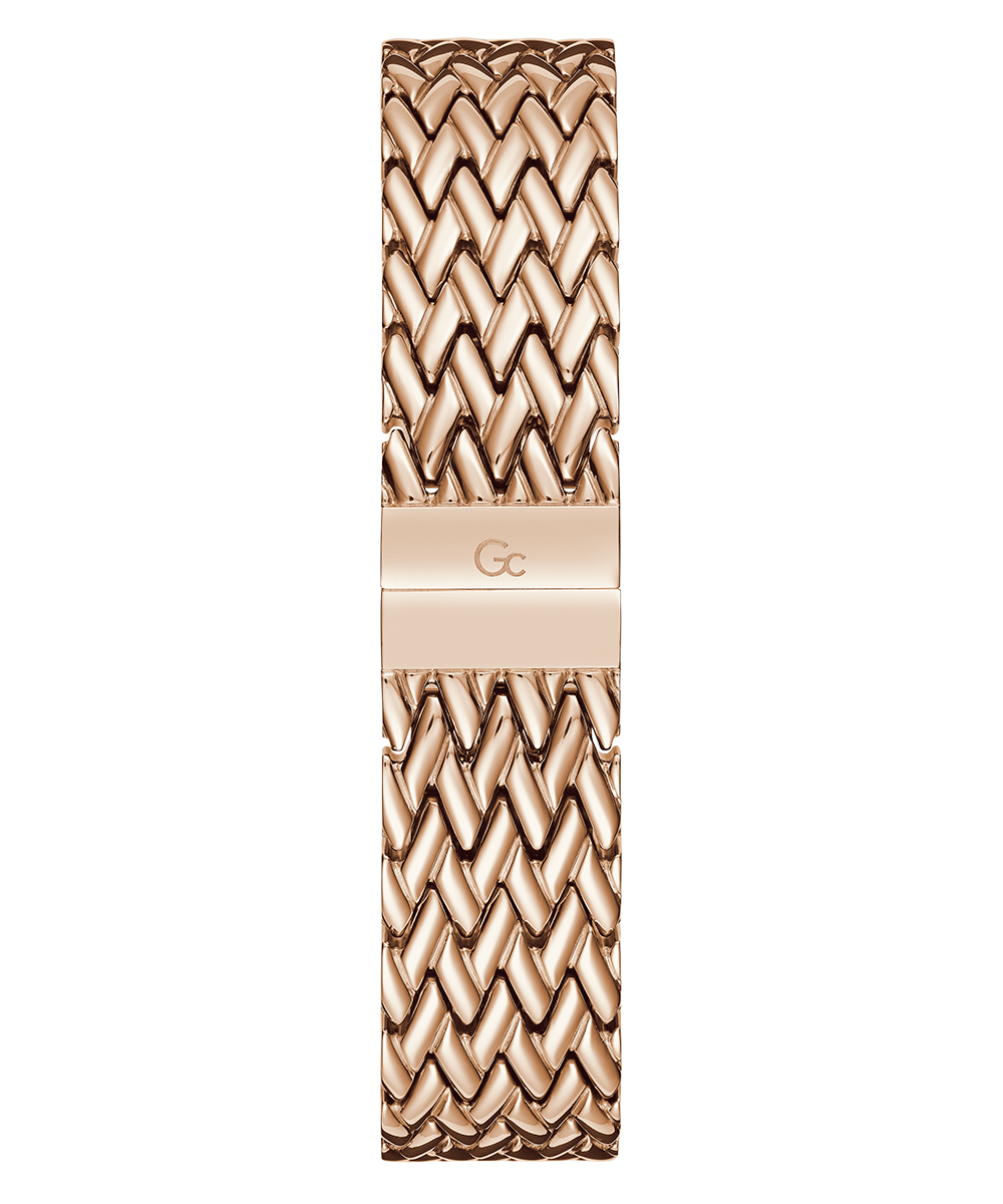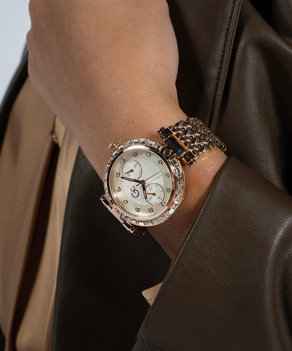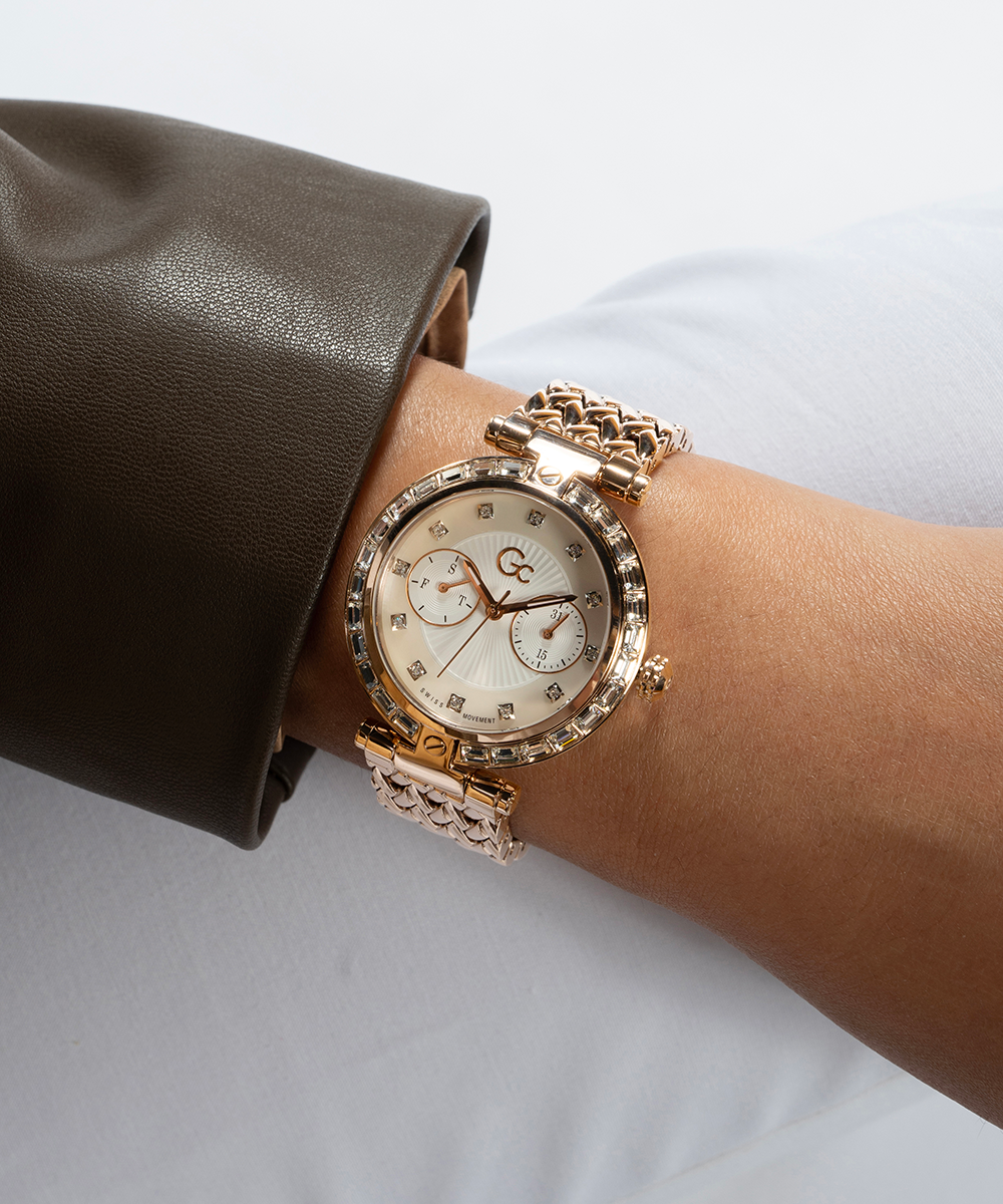 The Gc Vogue features a 36.5mm case adorned with baguette crystals and a high-class bracelet with a jewelry touch, all in full rose gold PVD, and an eco-friendly white mother-of-pearl dial. It hosts a day/date movement with 2 counters.