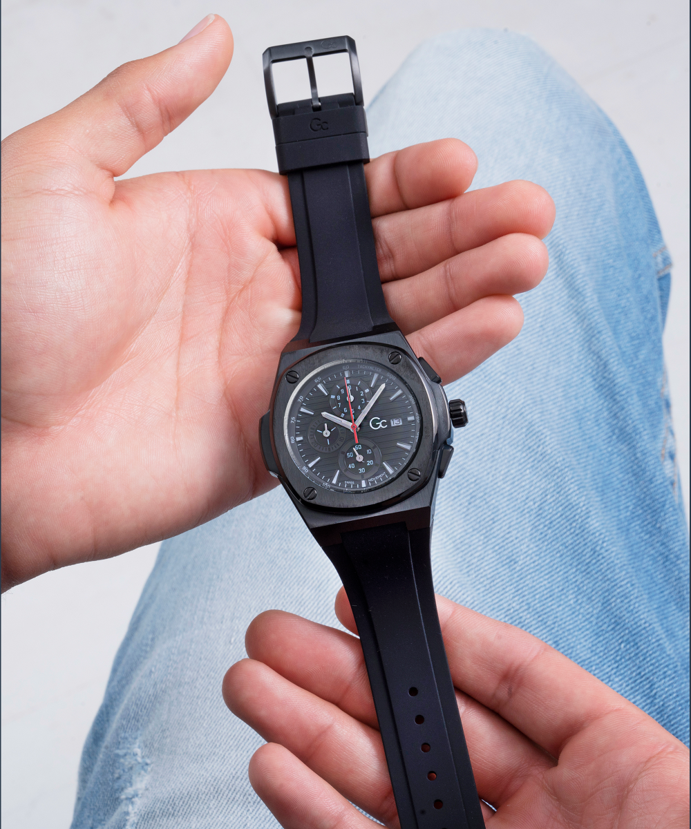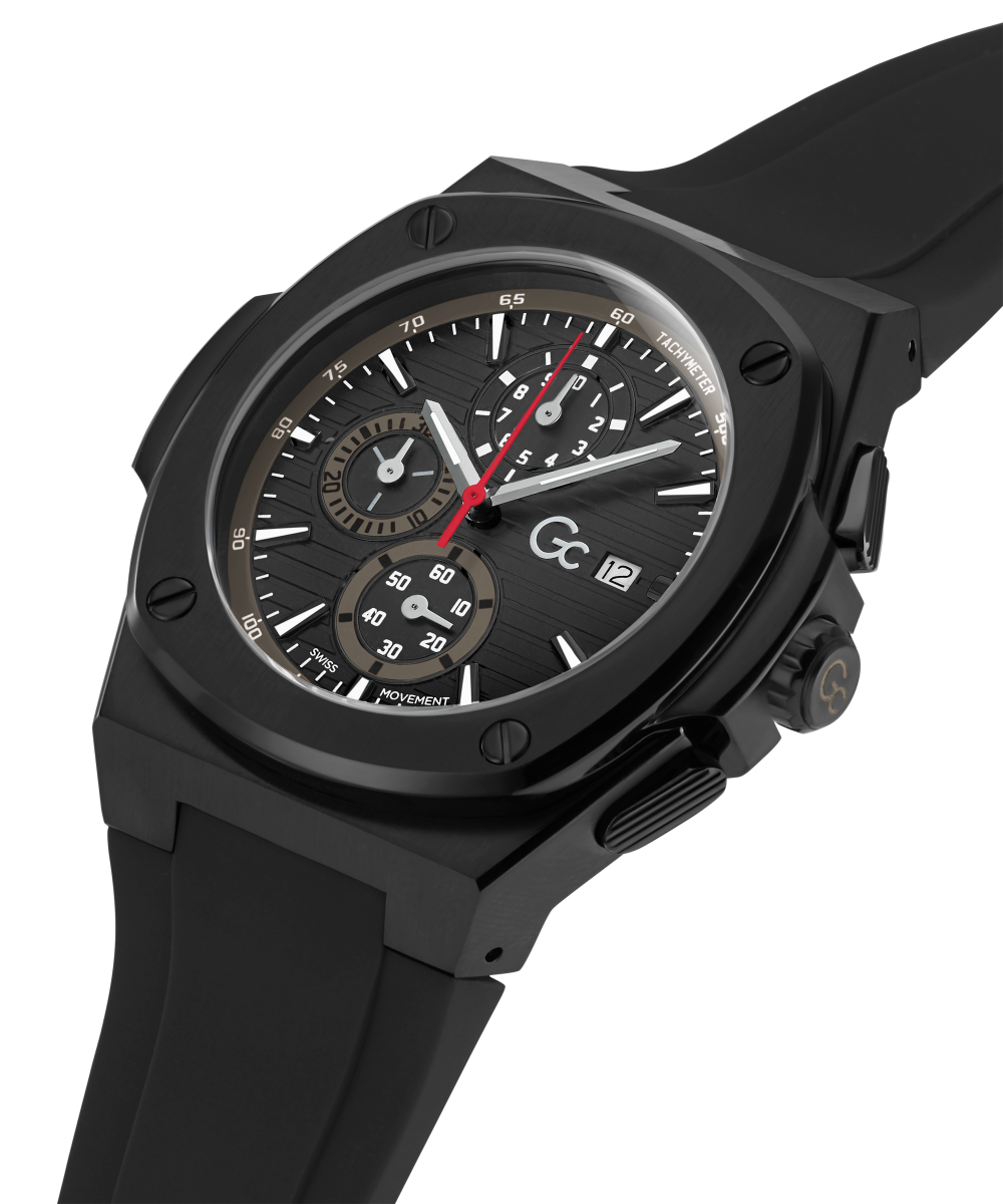 Capture the thrill of the race Highly detailed, engraved and numbered, equipped with a Swiss chronograph movement, the Racing version of the Gc coussin shape is striking.This Chronograph is introduced in full black look for the silicon straps, the counters and the tachymeter.The square brushed and polished black PVD case, is elegantly framed with screw design bezel. For a decidedly sporty look!
