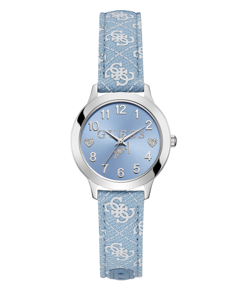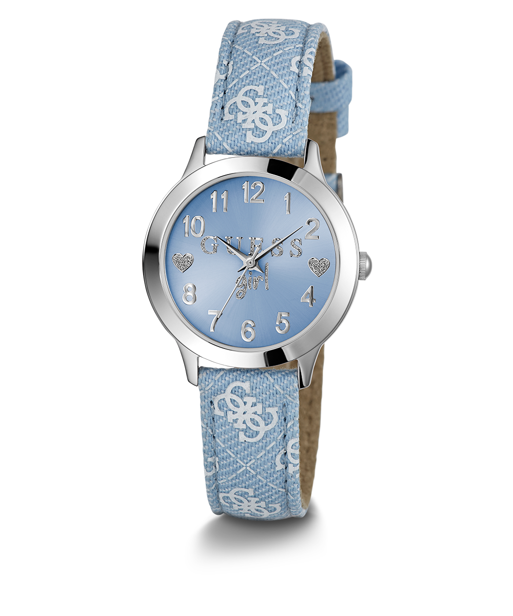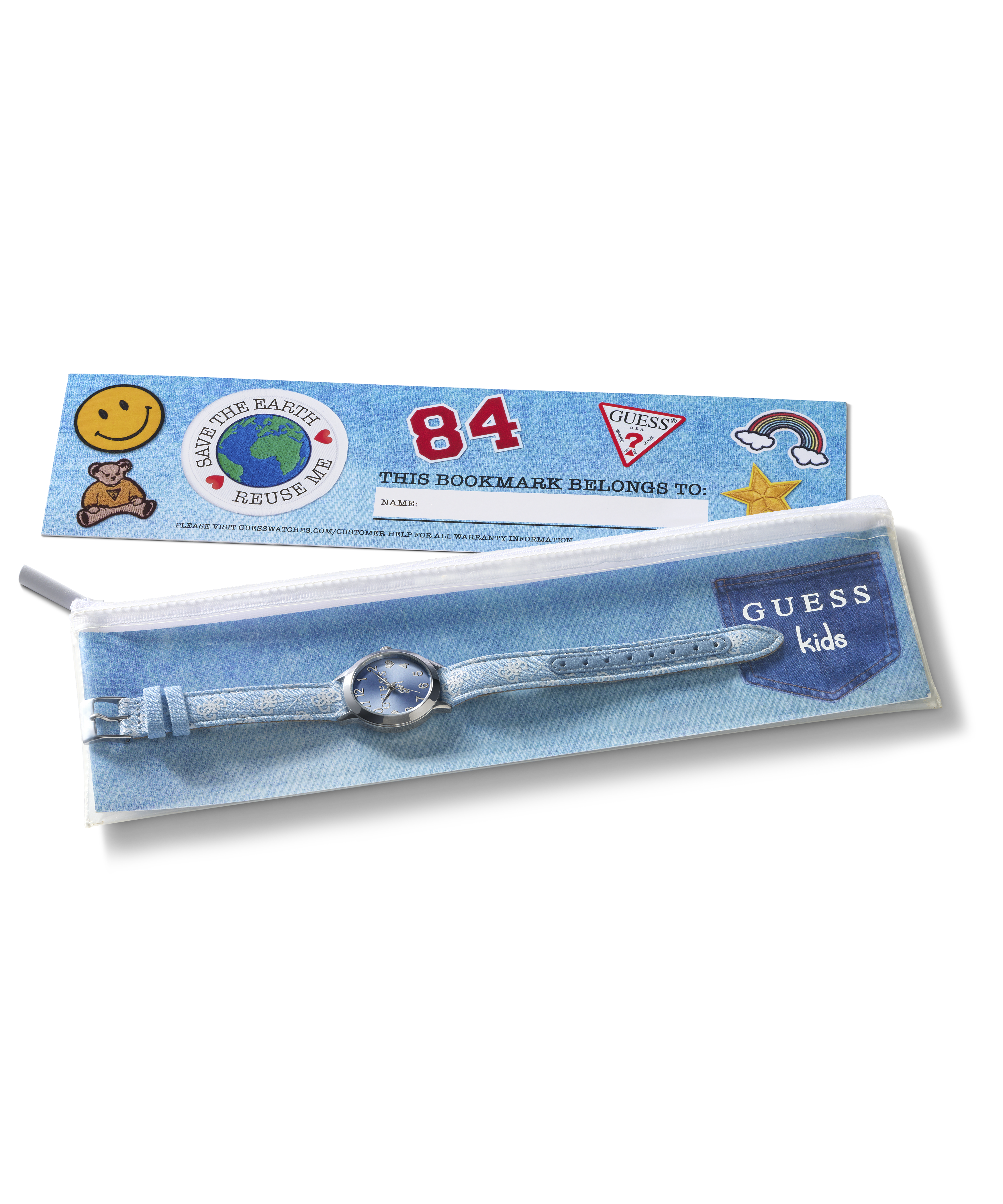 A clean 30 mm recycled steel kids watch featuring a 'GUESS girl' logo glitzy dial and paired with a recycled denim strap that features the iconic Quattro "G" logo pattern. This style ships in a recycled plastic pouch that doubles as a pencil case and has an insert that also can be used as a personalized bookmark.