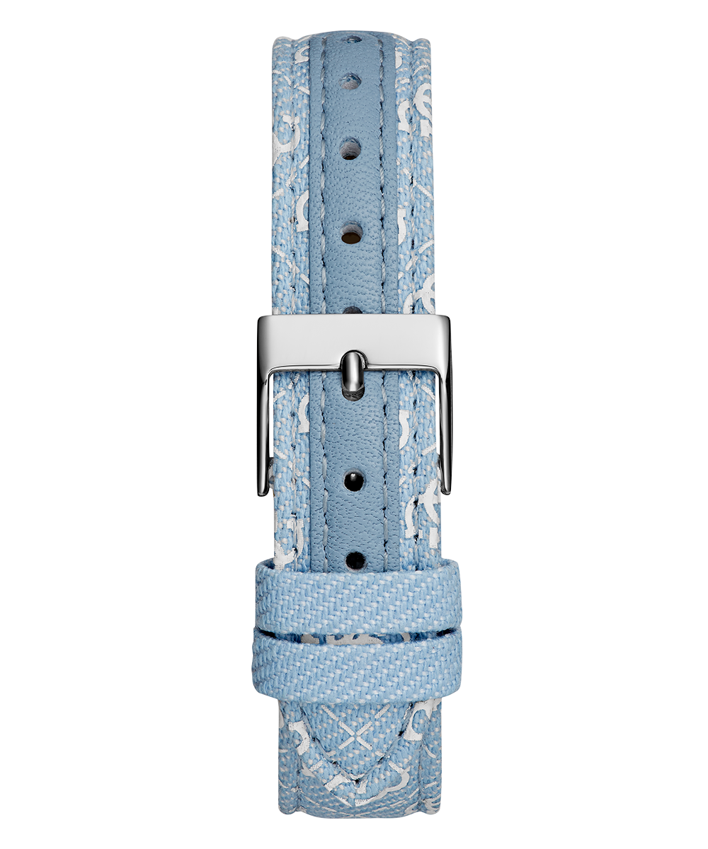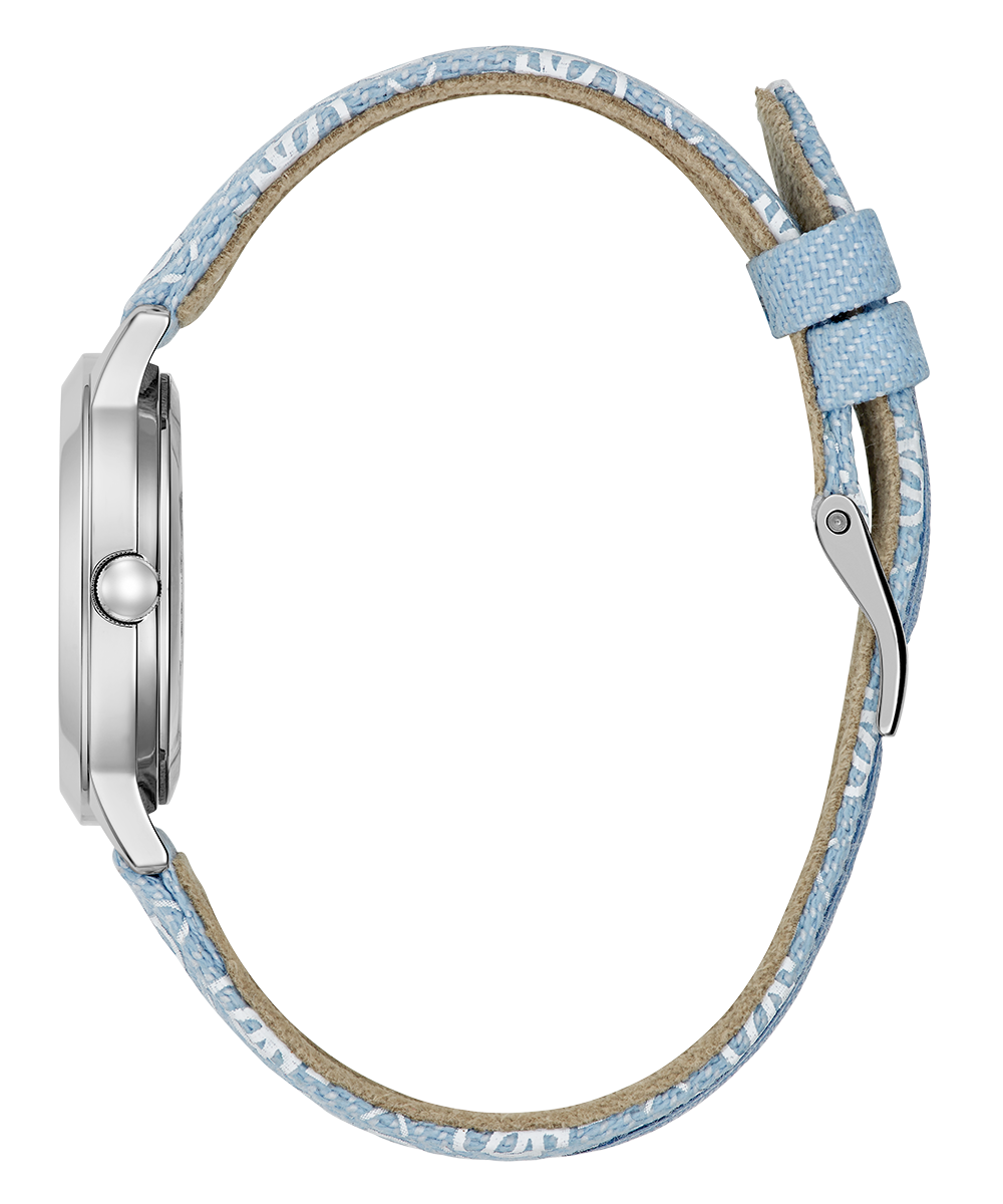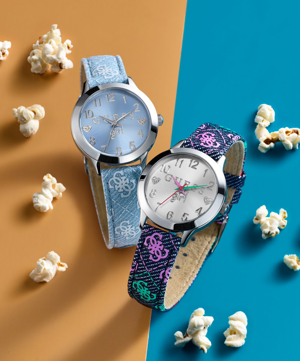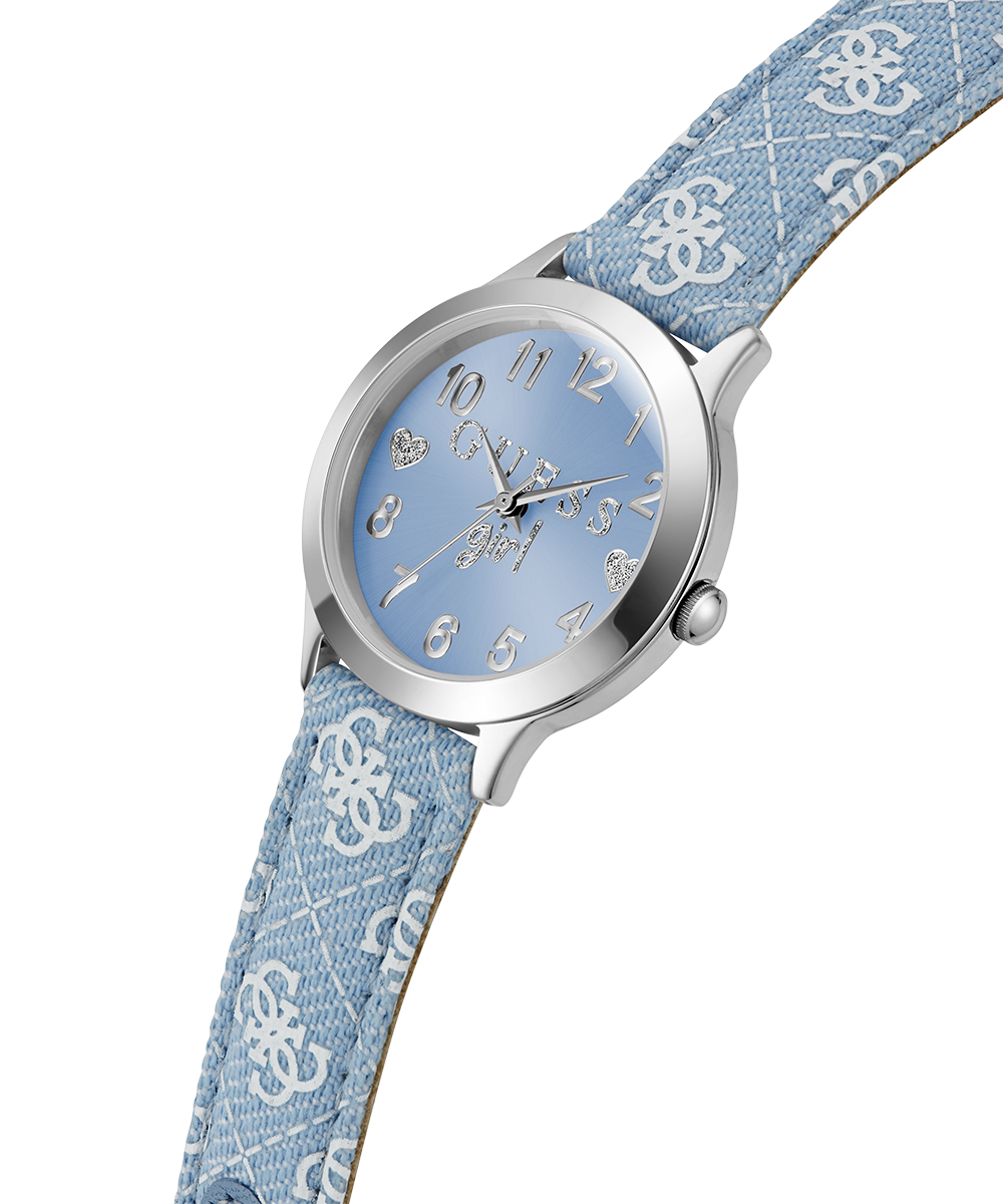 A clean 30 mm recycled steel kids watch featuring a 'GUESS girl' logo glitzy dial and paired with a recycled denim strap that features the iconic Quattro "G" logo pattern. This style ships in a recycled plastic pouch that doubles as a pencil case and has an insert that also can be used as a personalized bookmark.