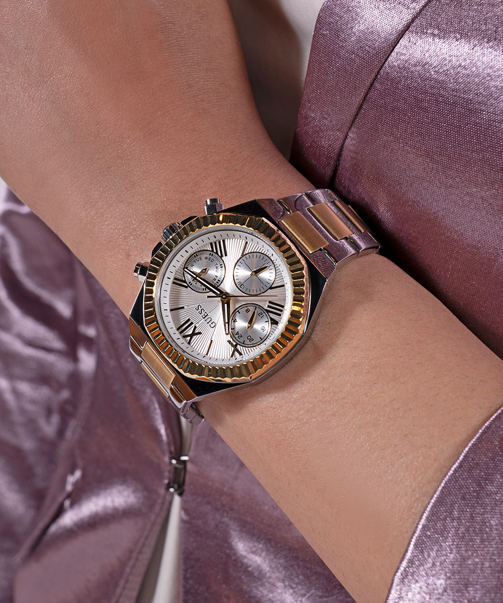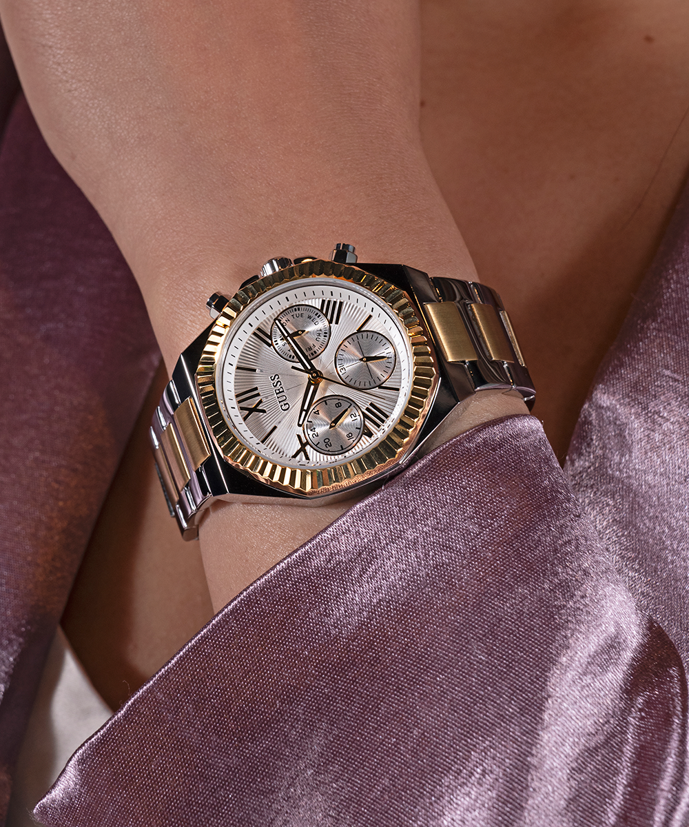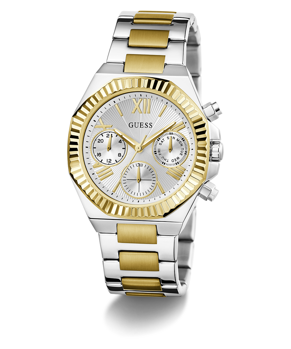 Go to the shopThis new dress style features a coin edge bezel and chrono-look multi-function dial on a sleek 3 link bracelet with brushed and polished finishing.
