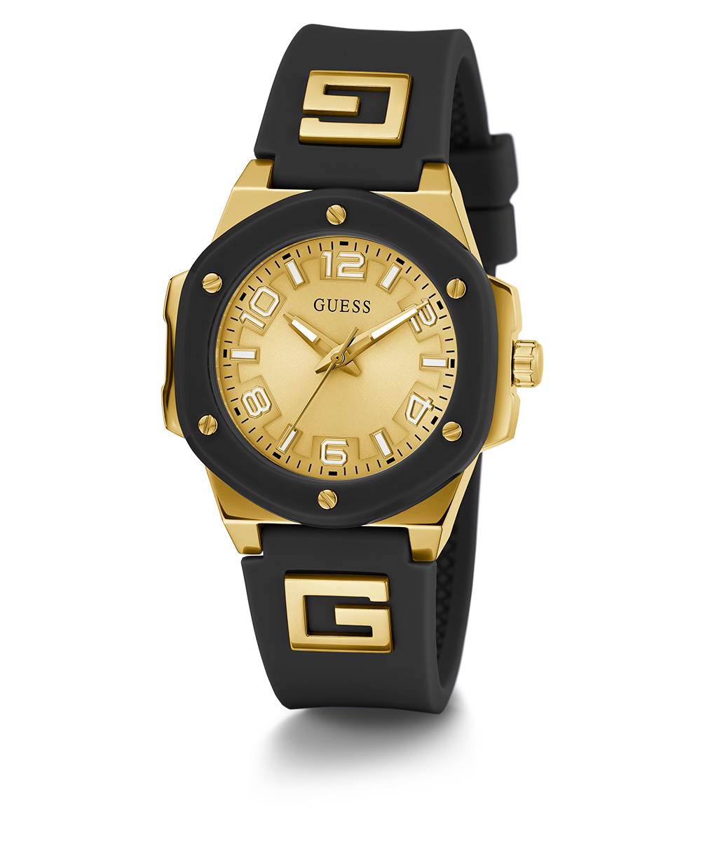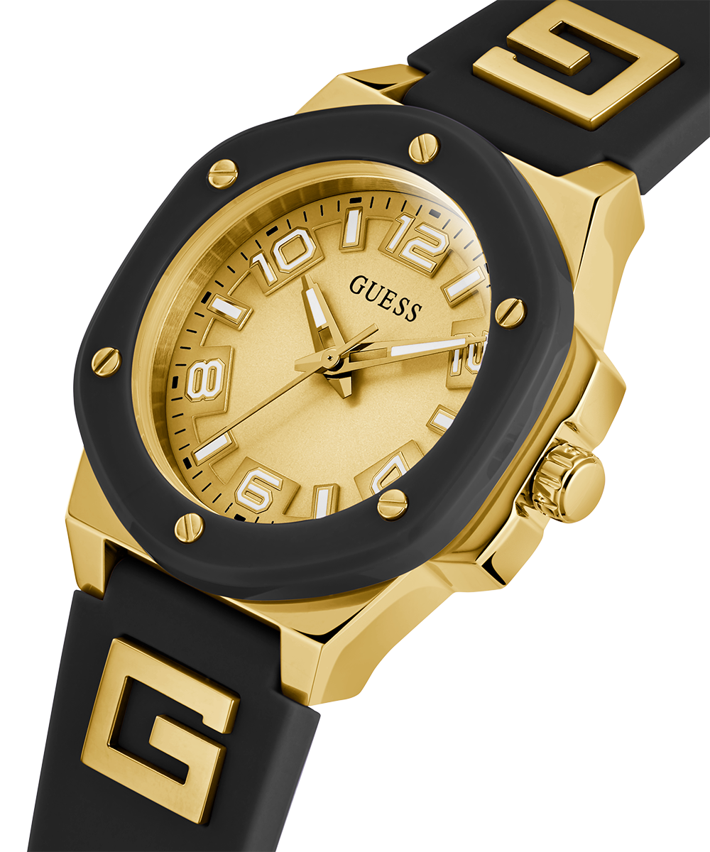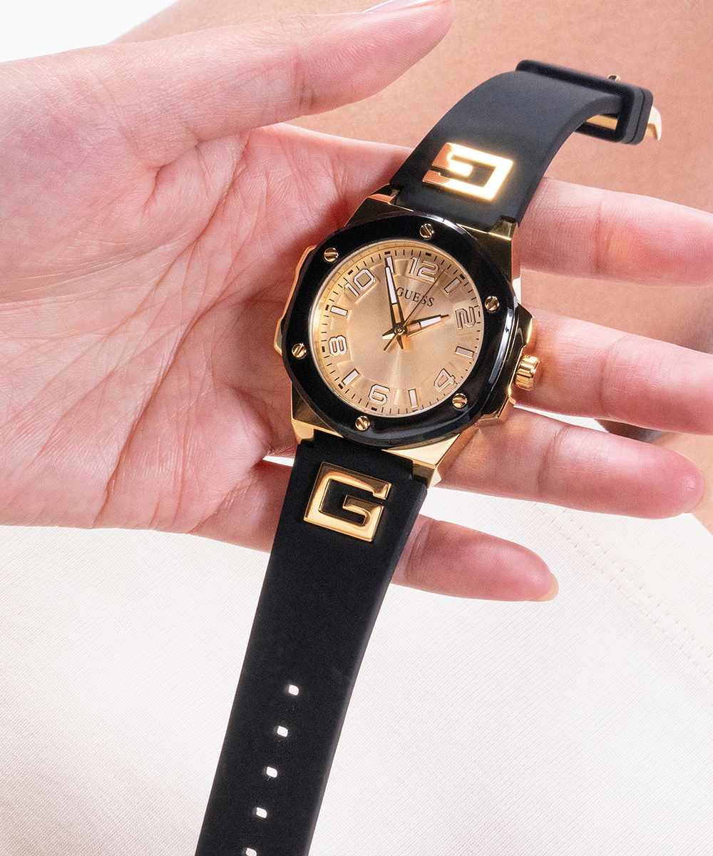 This hyped up logo sport look has a unique case shape featuring a bio-based nylon top ring and sleek integrated silicone strap with a signature G logo on either side of the case