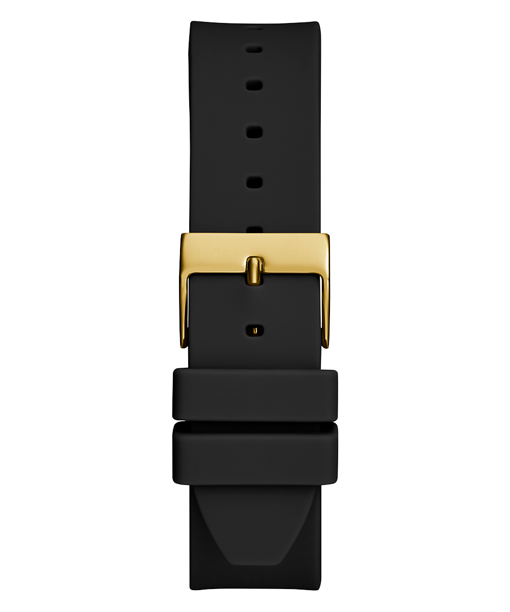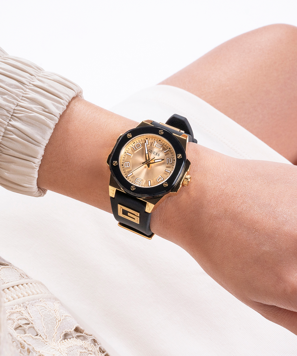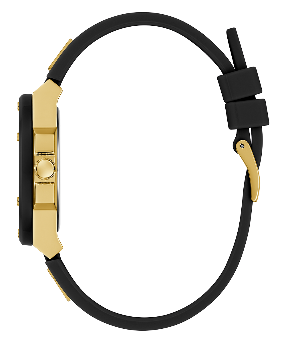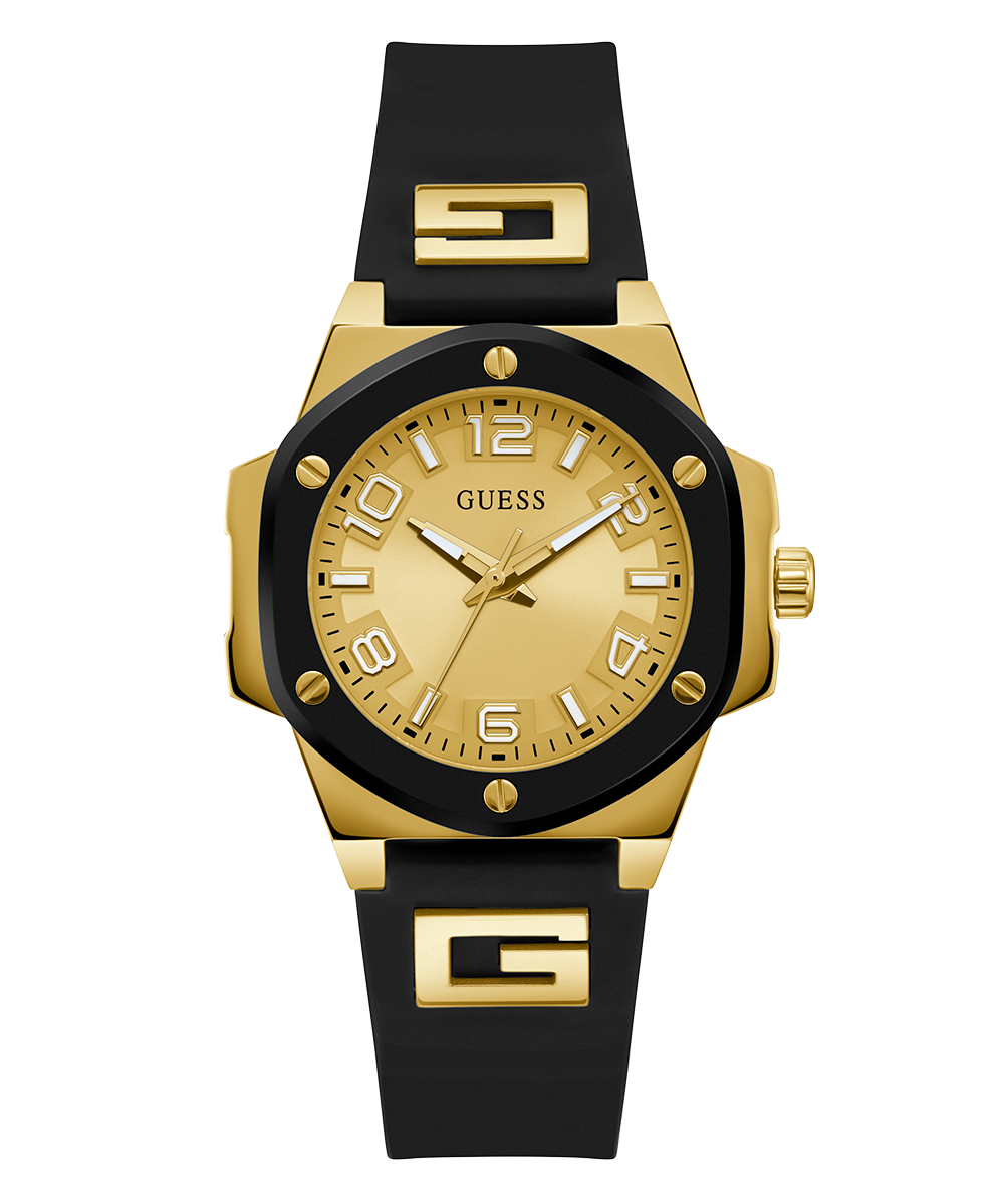 This hyped up logo sport look has a unique case shape featuring a bio-based nylon top ring and sleek integrated silicone strap with a signature G logo on either side of the case