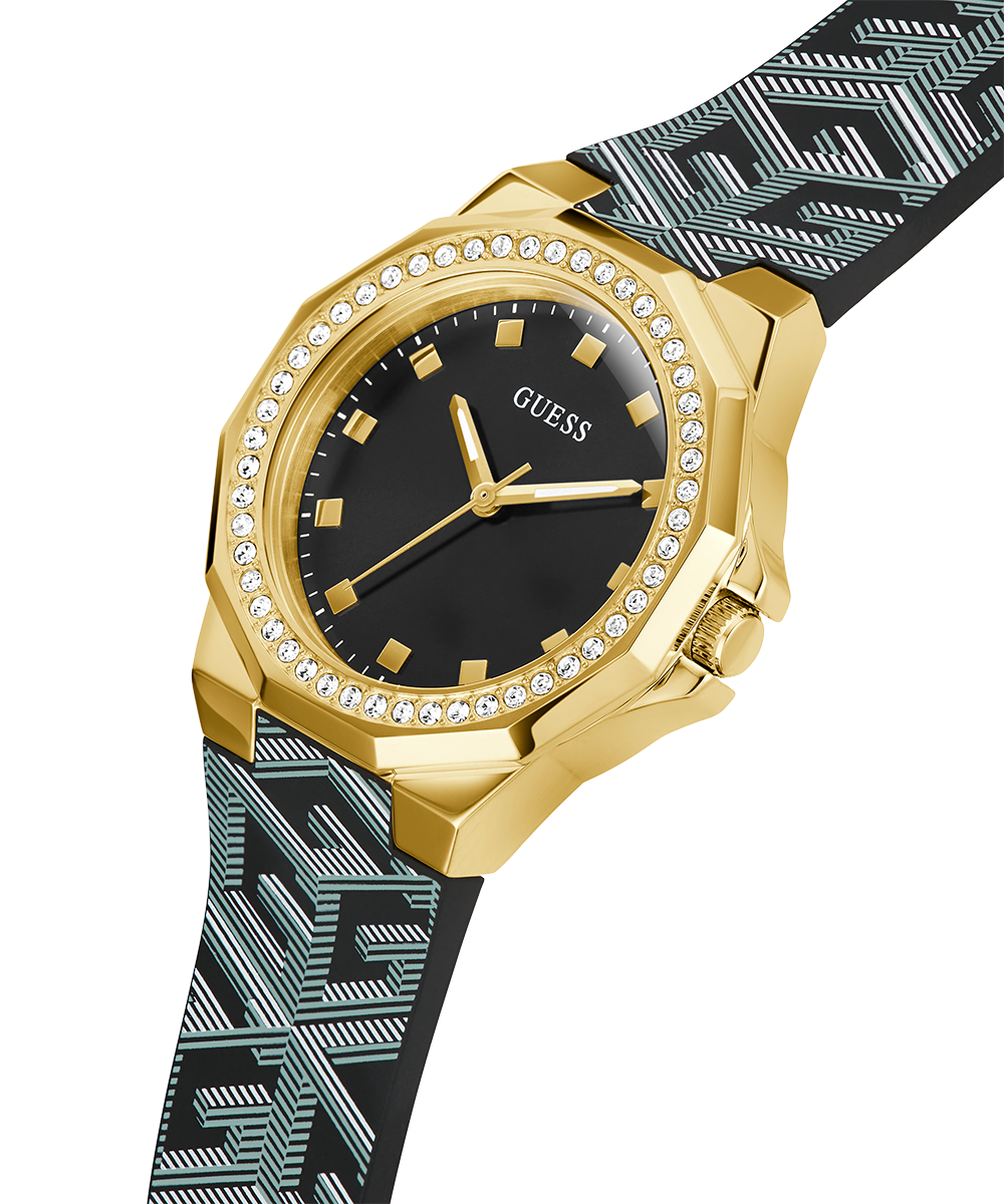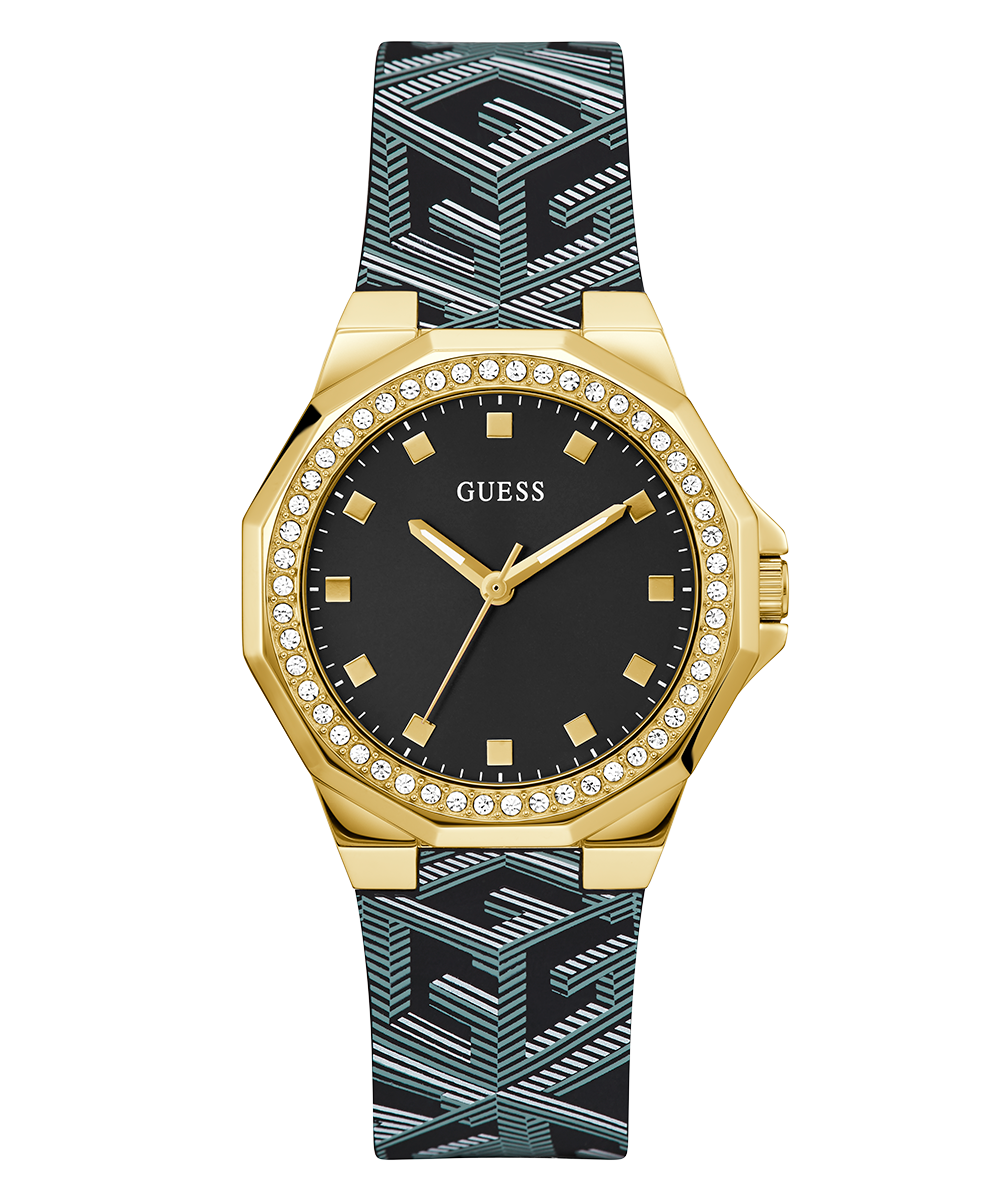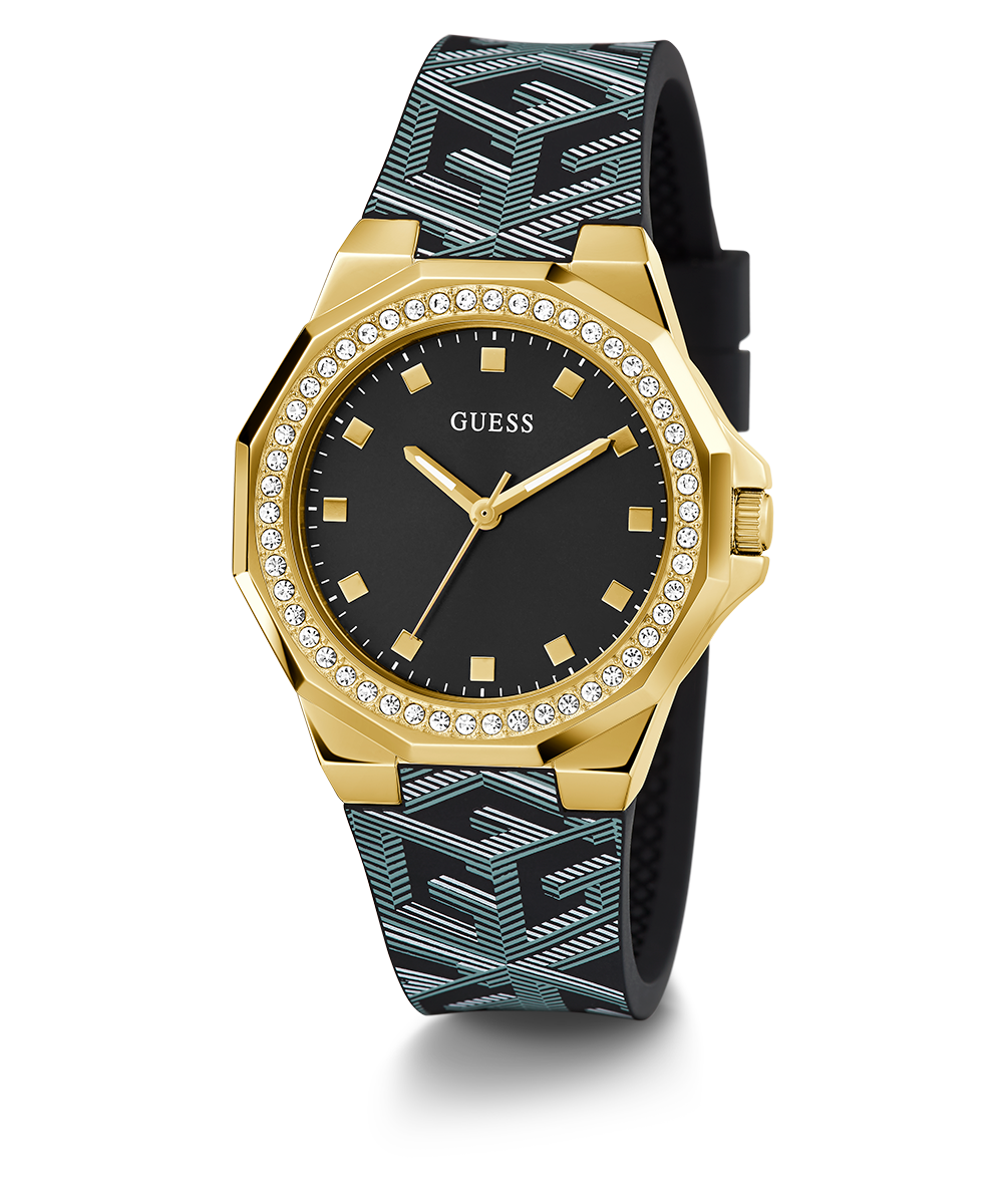 This stunning timepiece features a digitally printed G cube pattern on its silicone strap complimented by the stone details on it's unique bezel.