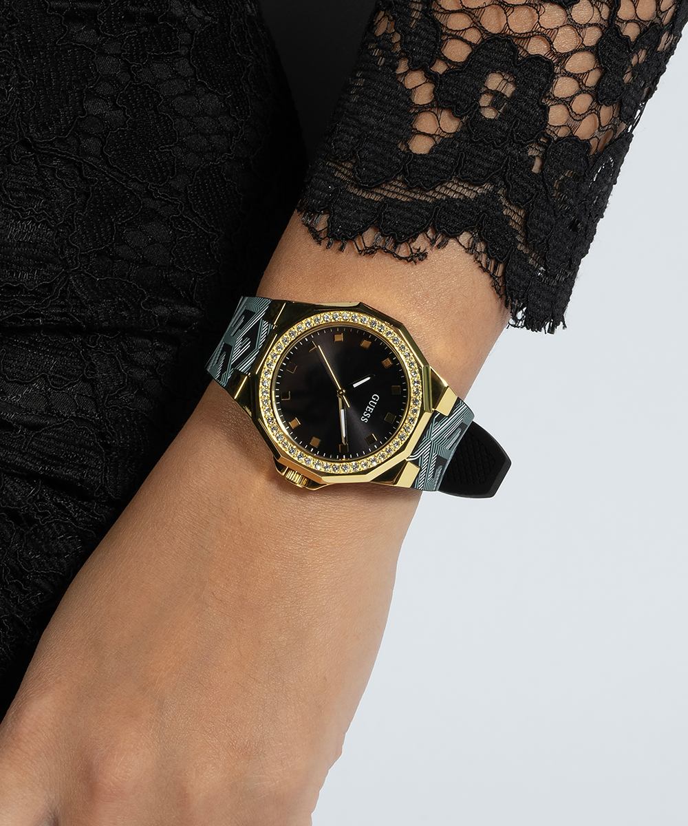 GUESS Ladies Black Gold Tone Analog Watch
