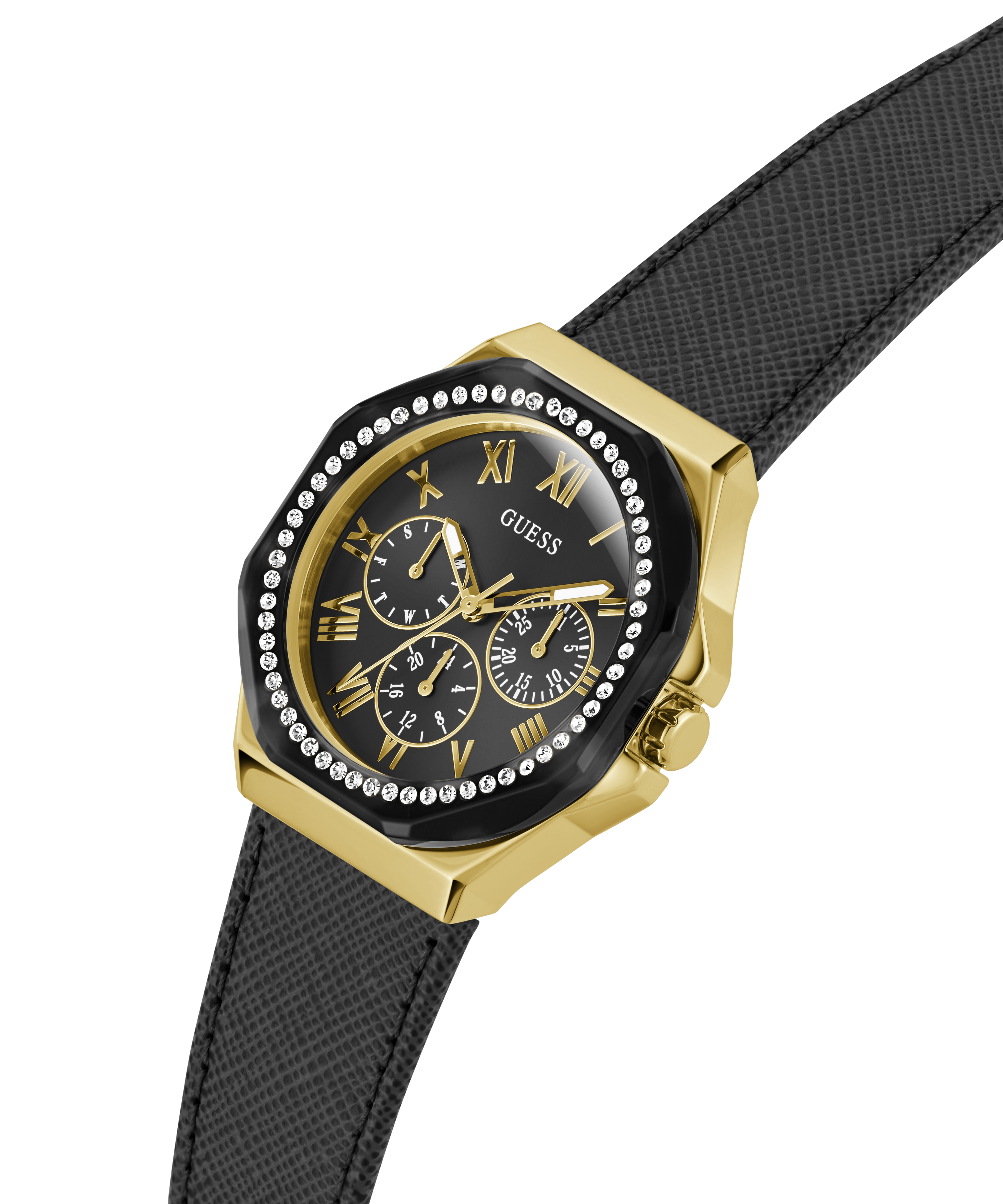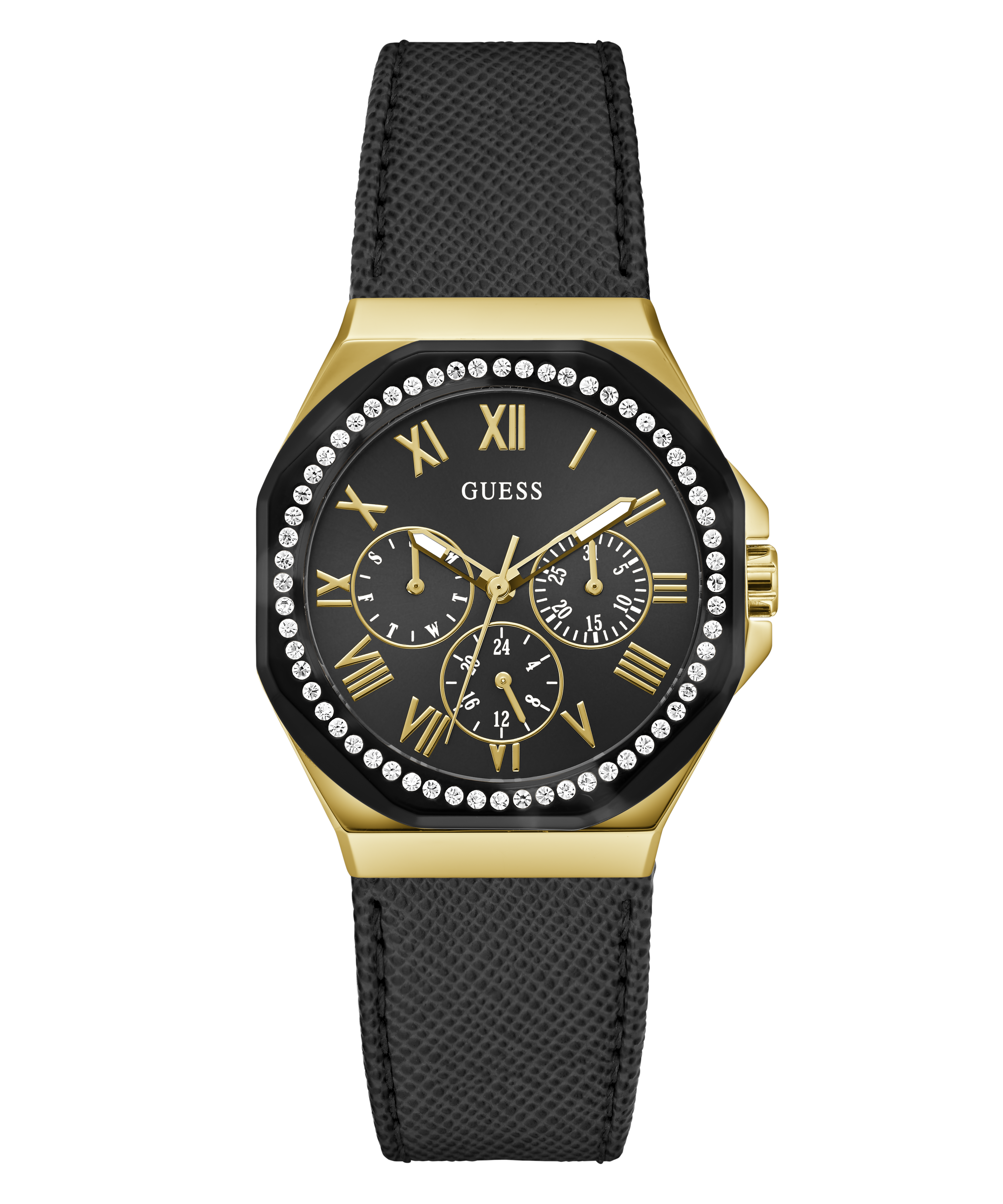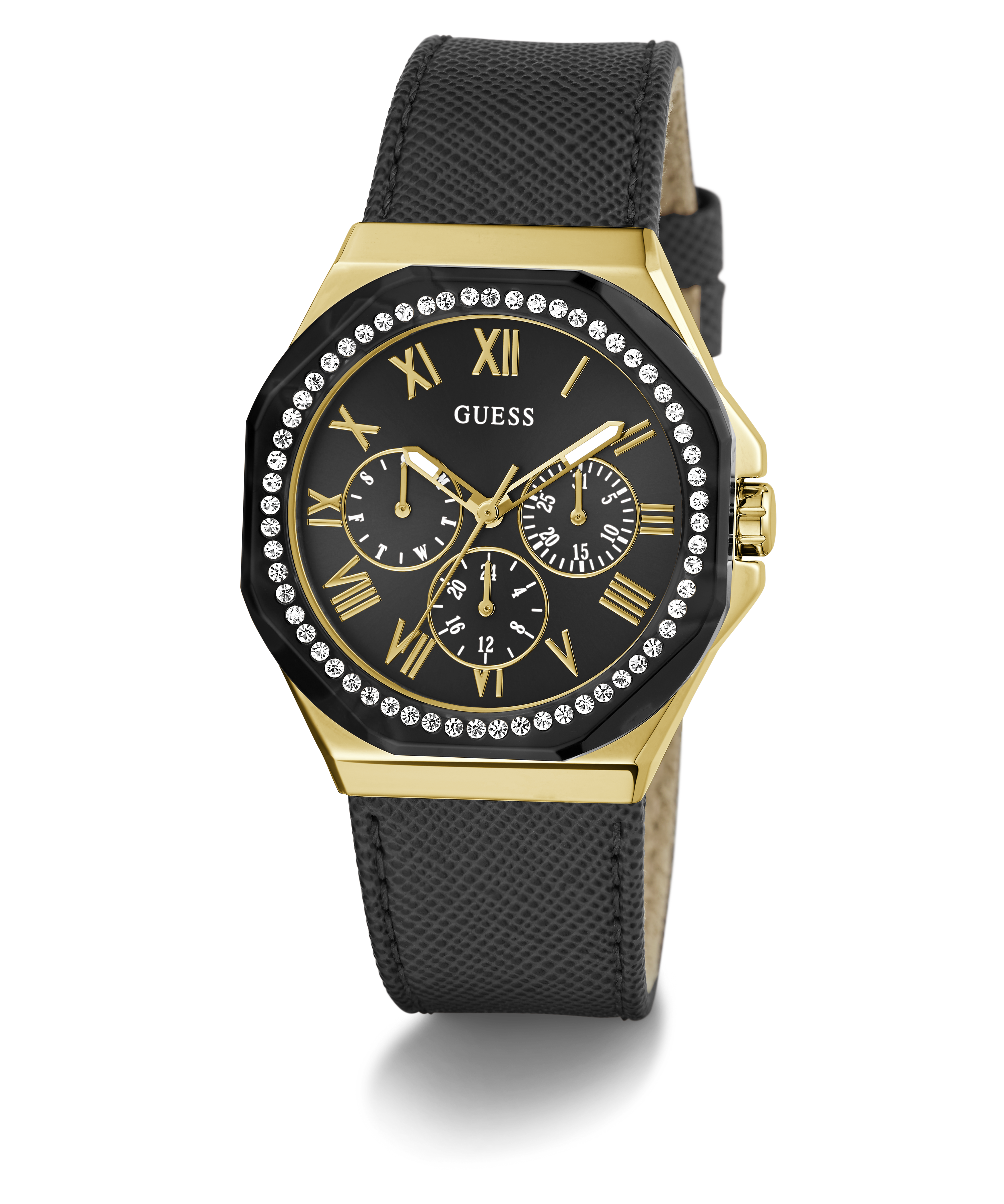Go to the shopThis new elevated look features a textured leather strap and a black stoned out top ring with a multi-function movement.
