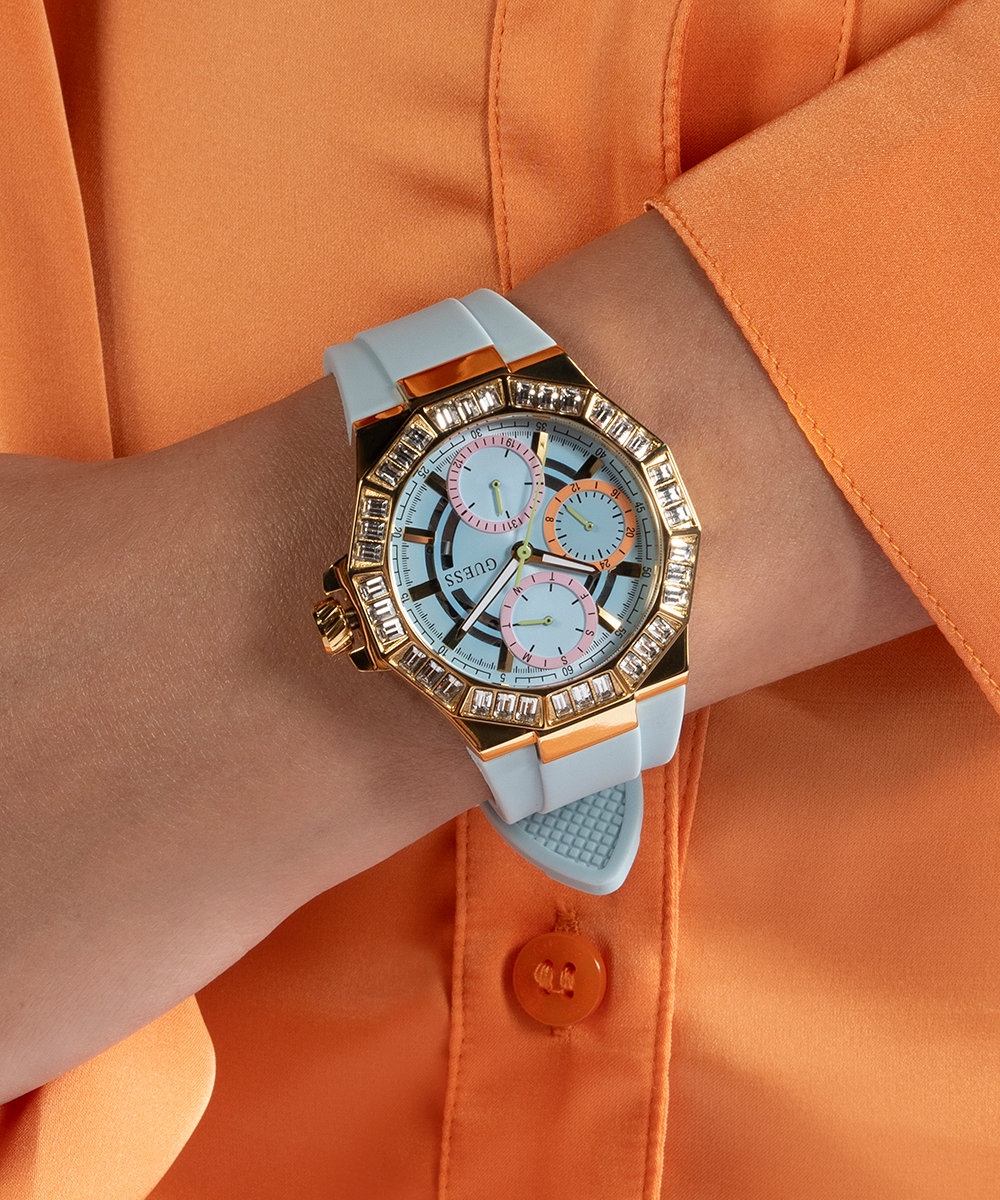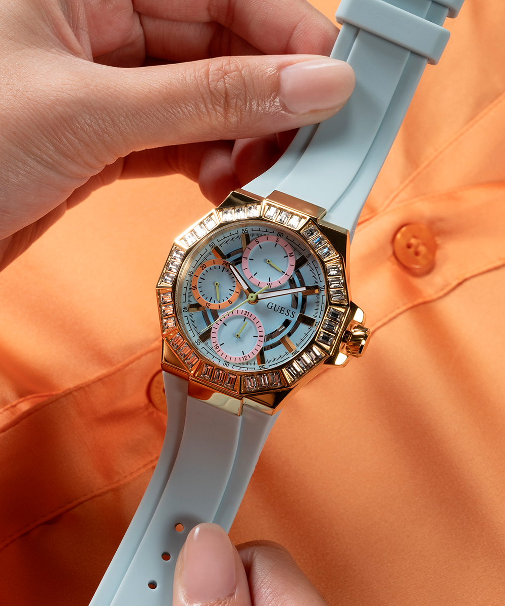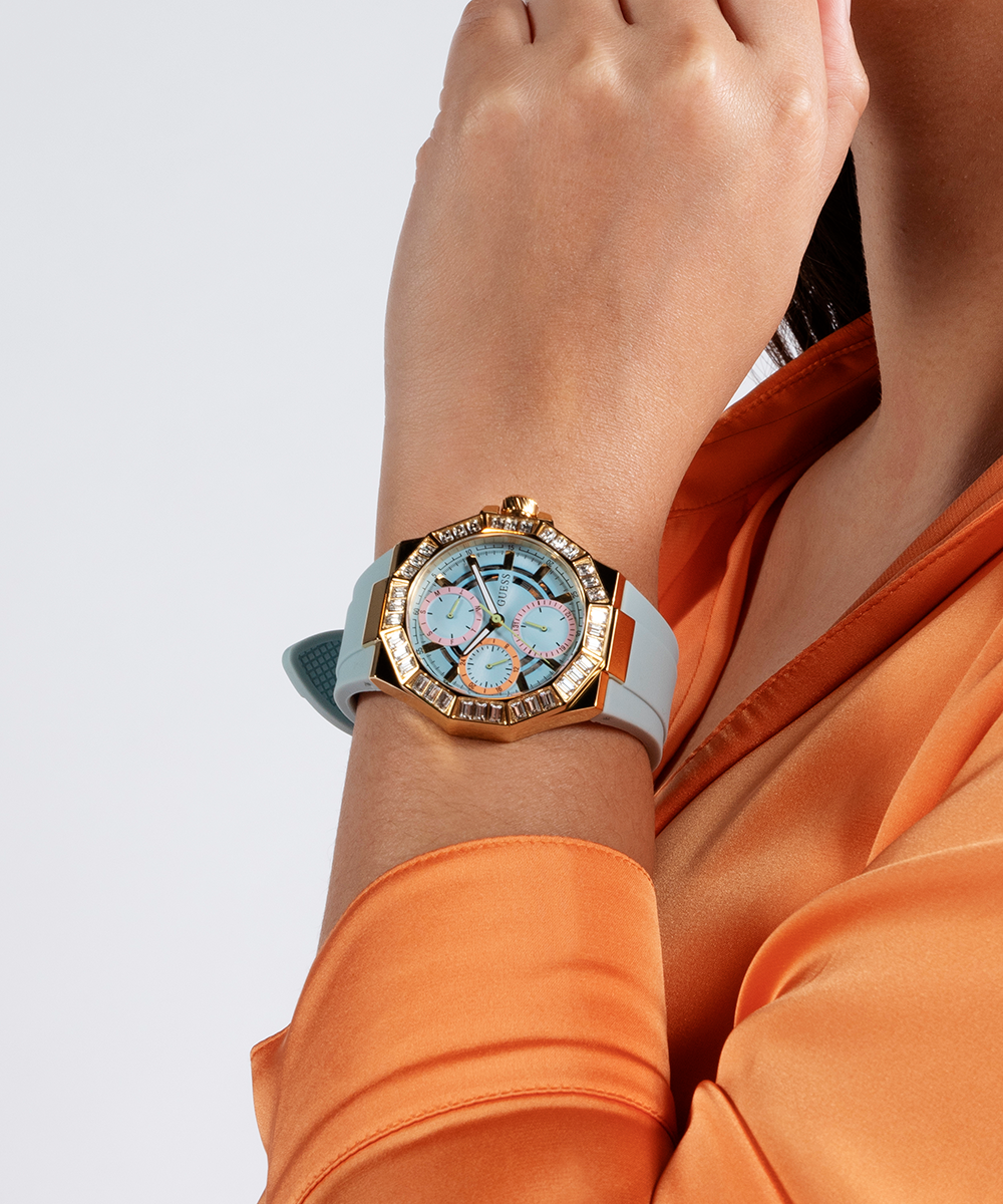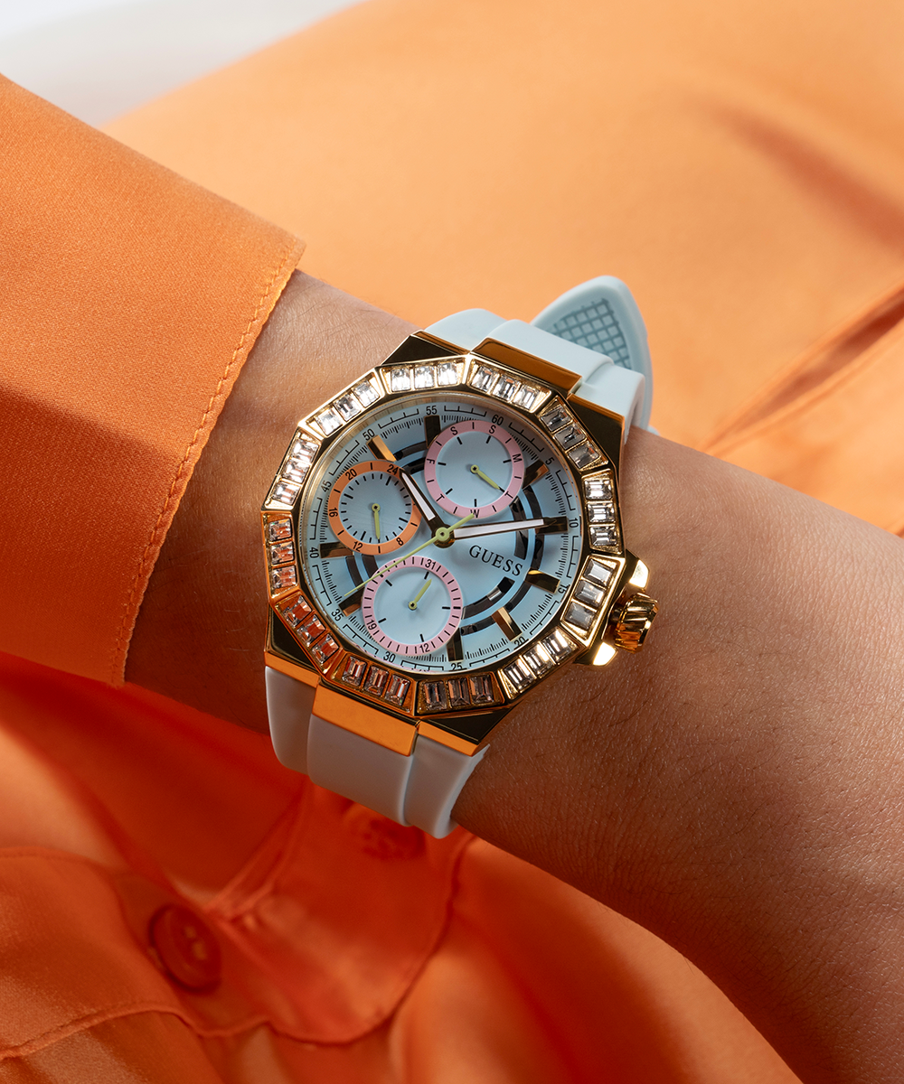 A glammed up sports look this new style features baguette crystals on its bezel and a multi-function movement paired with an integrated silicone strap.