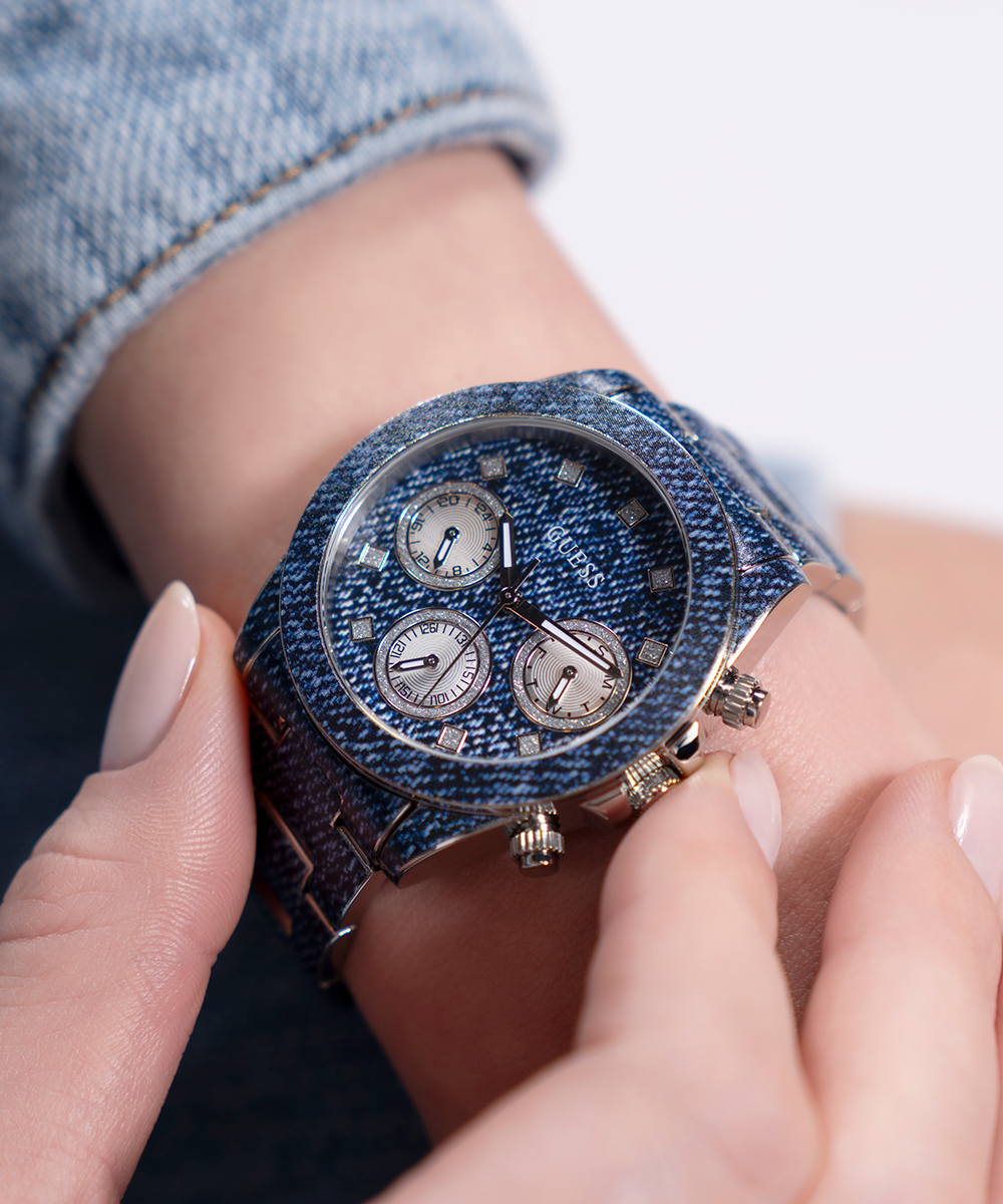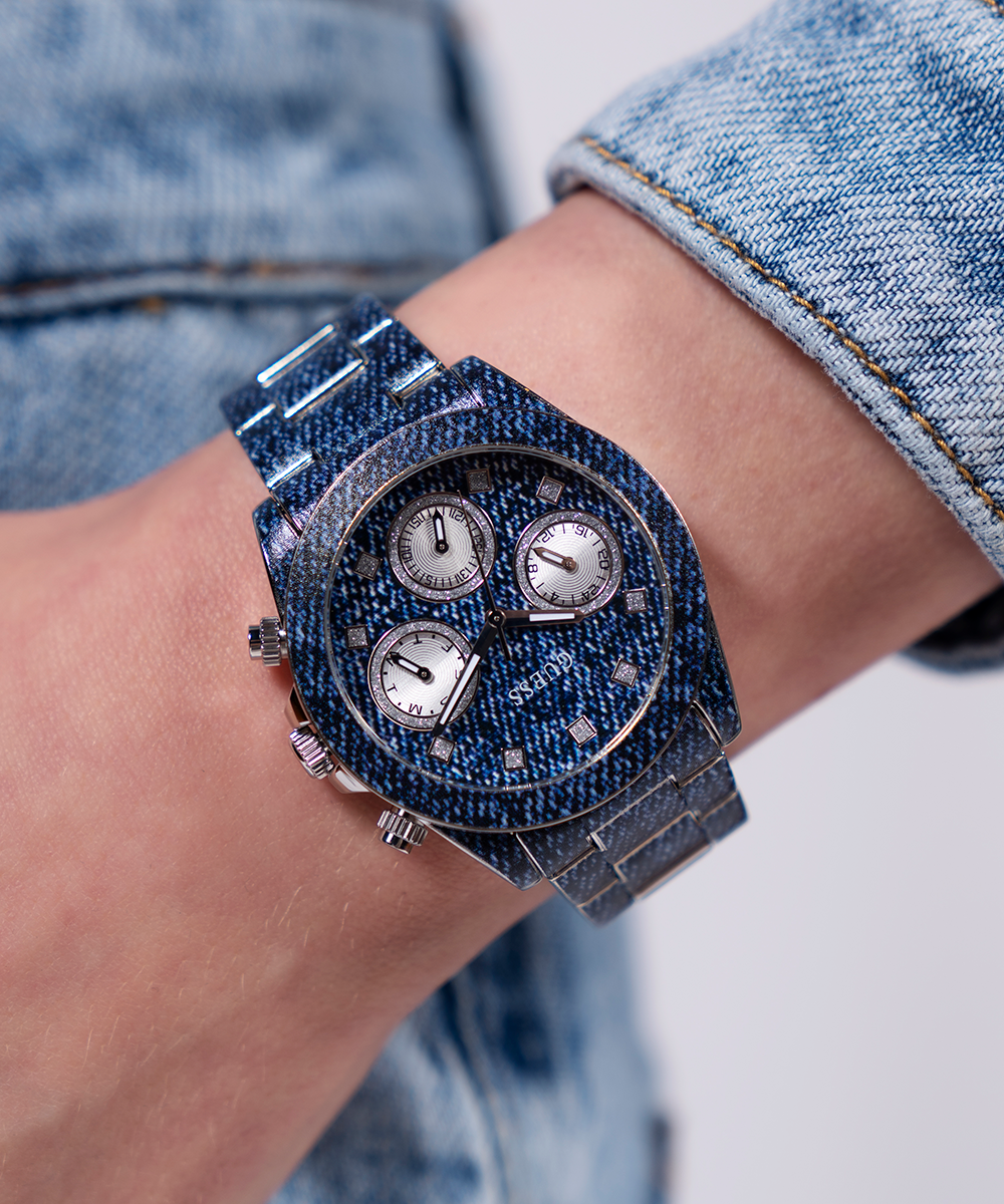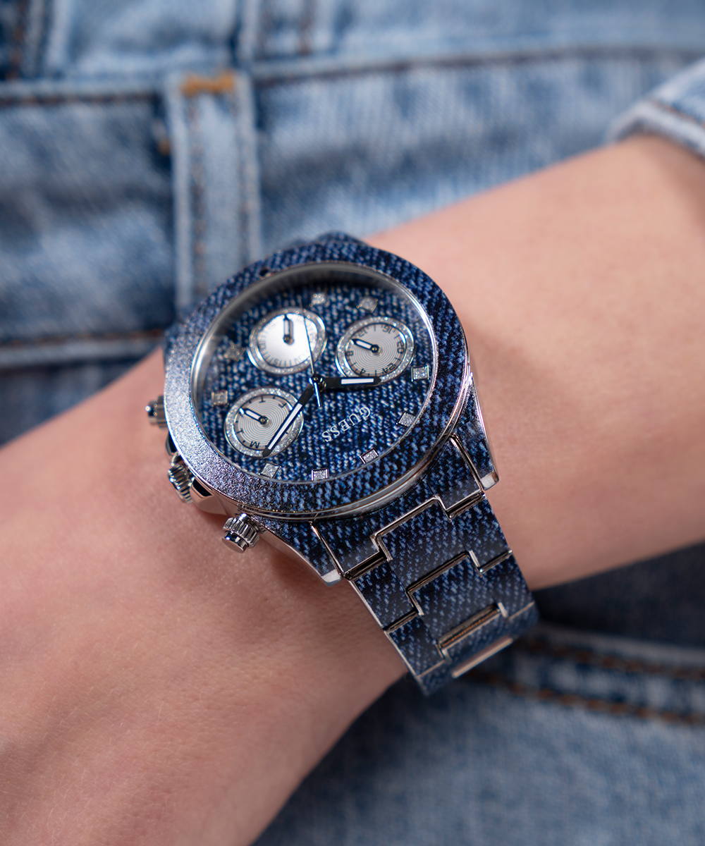 Go to the shopShow your love for GUESS with an iconic denim style featuring a digitally printed denim pattern across the bracelet and multi-function dial with a subtle touch of glitz!