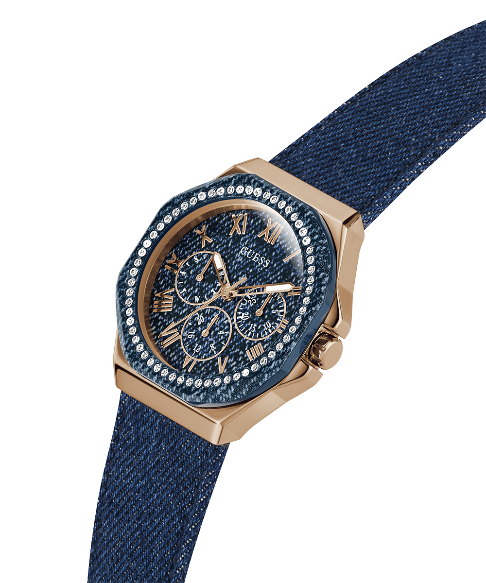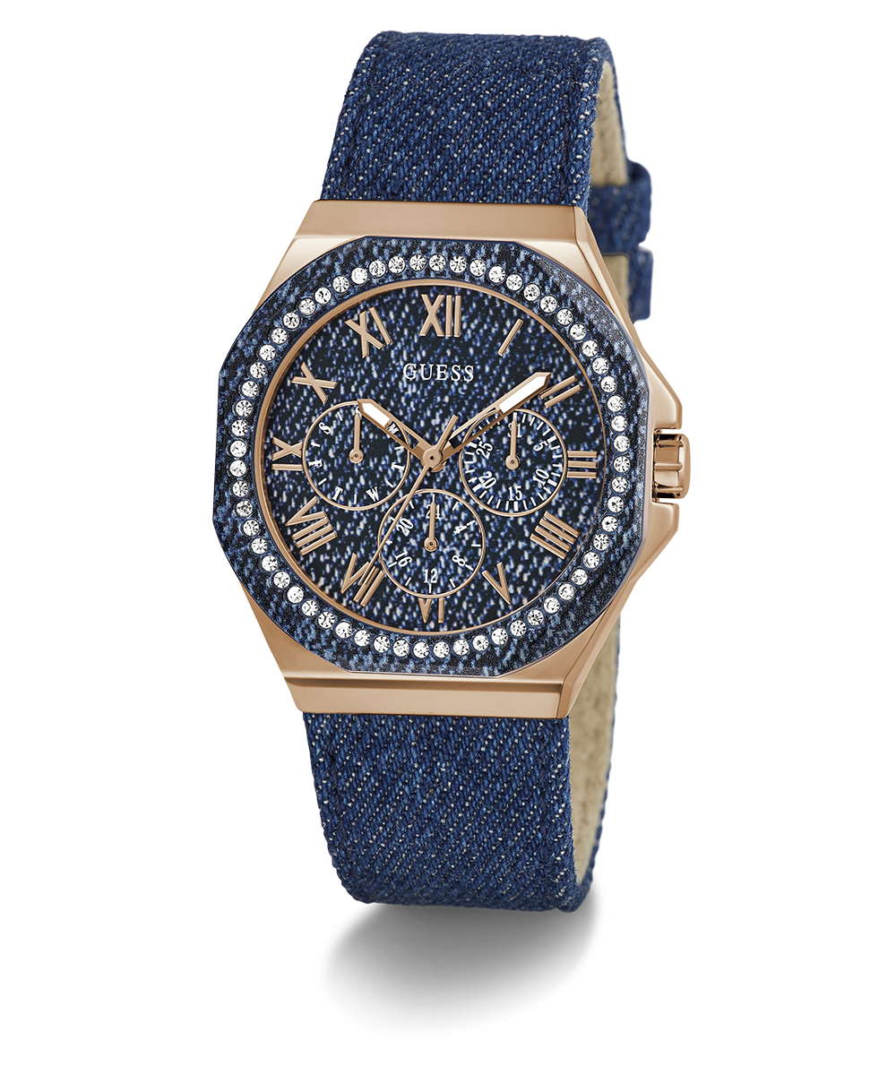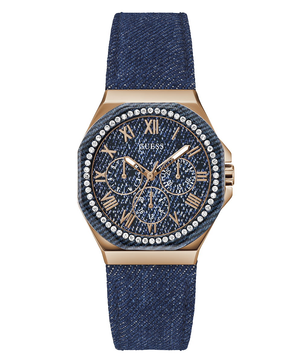 This new elevated look features a denim strap and a denim printed stoned out top ring with a multi-function movement and denim print.
