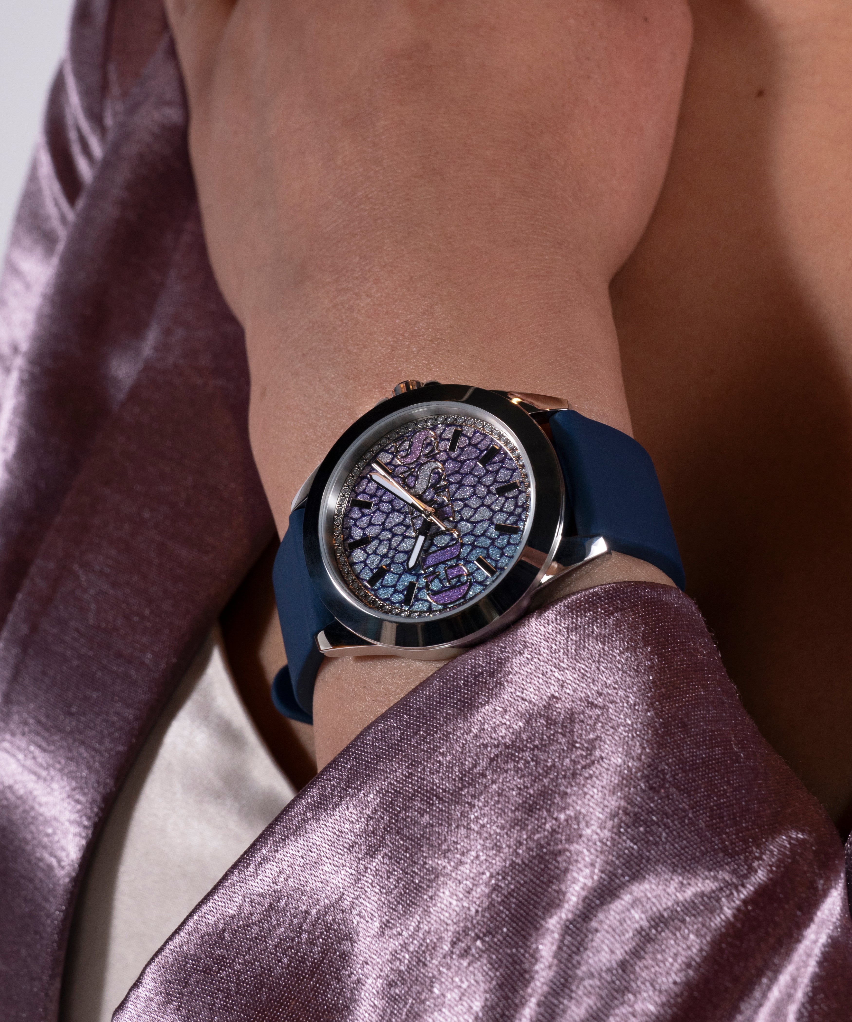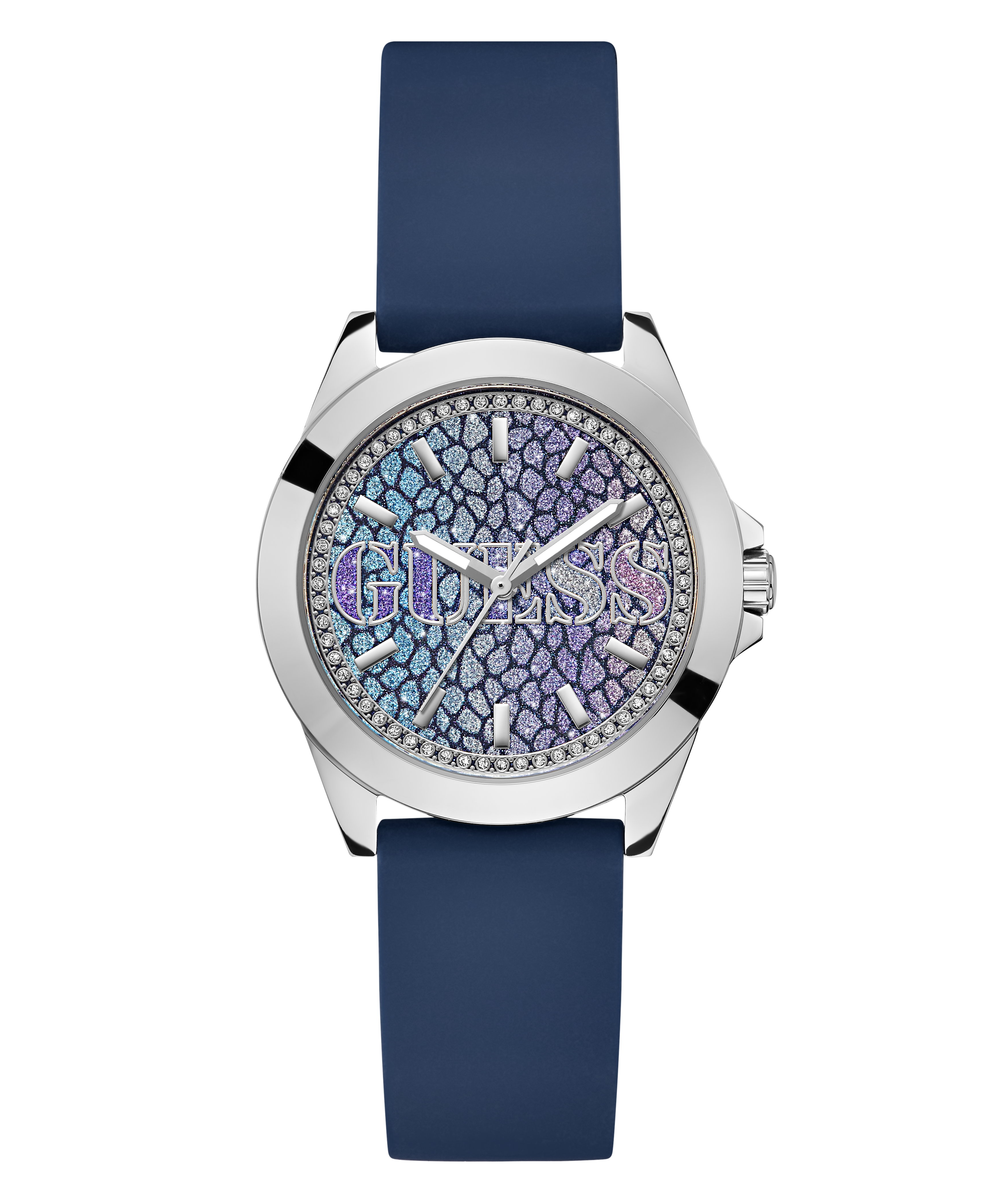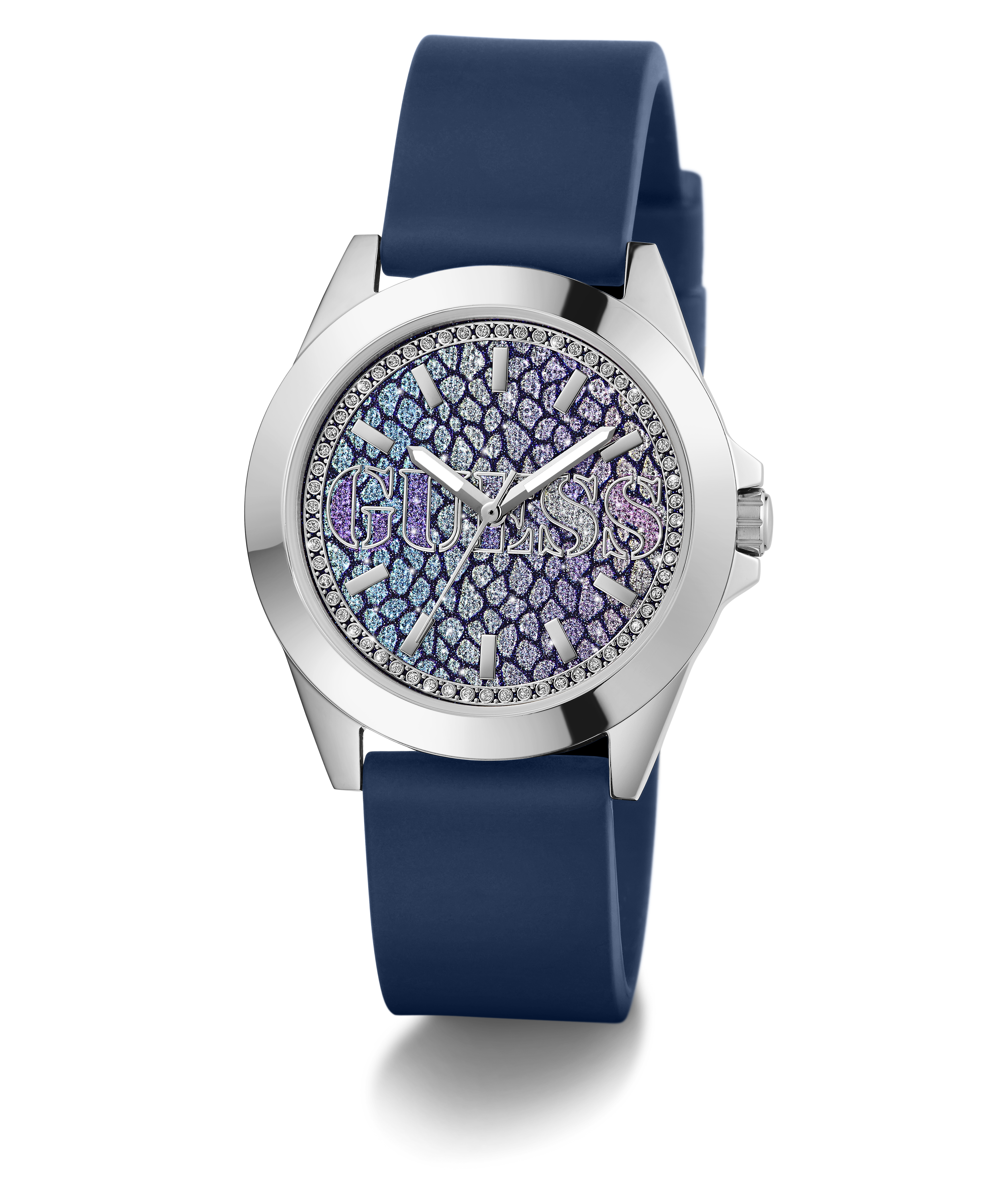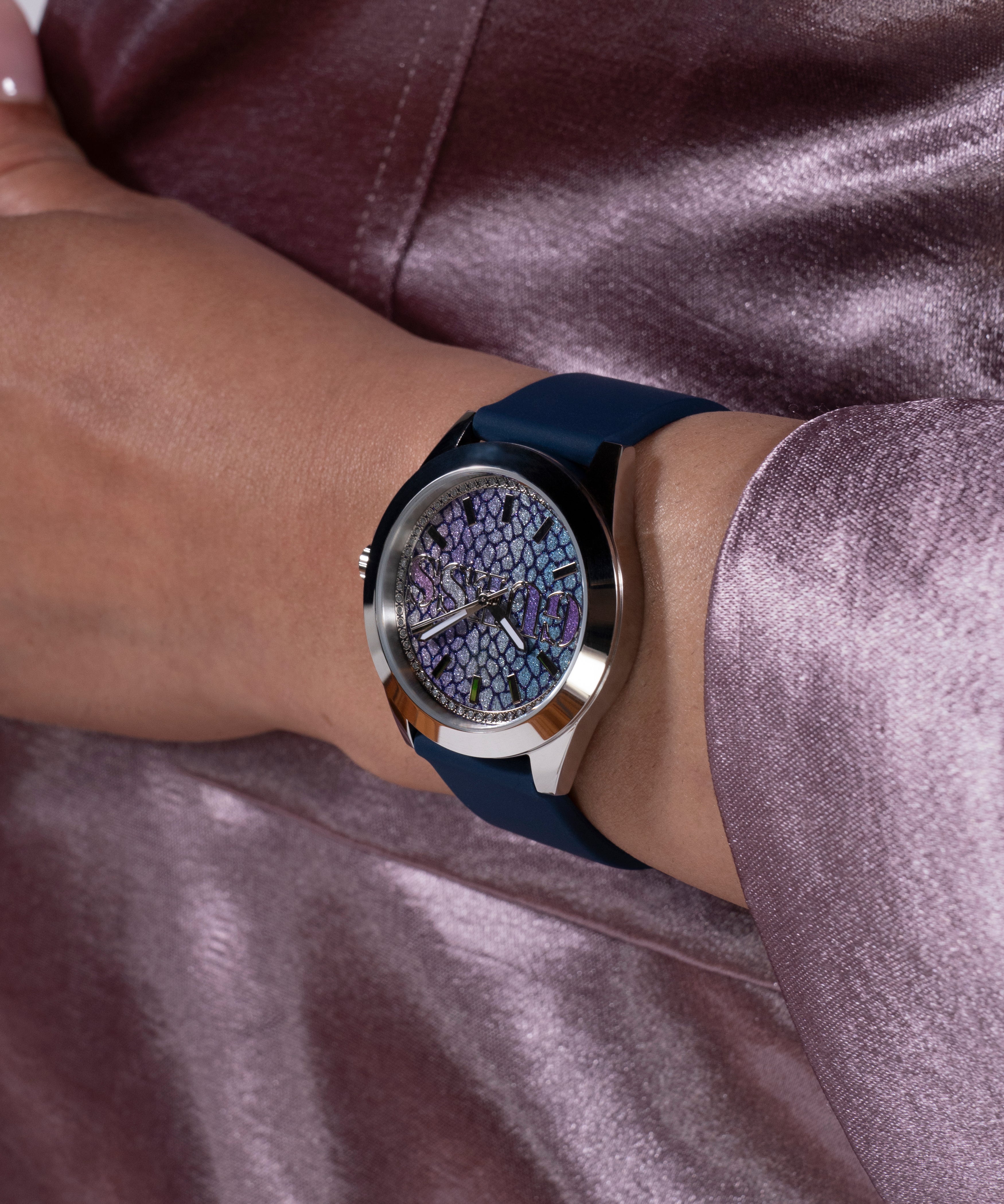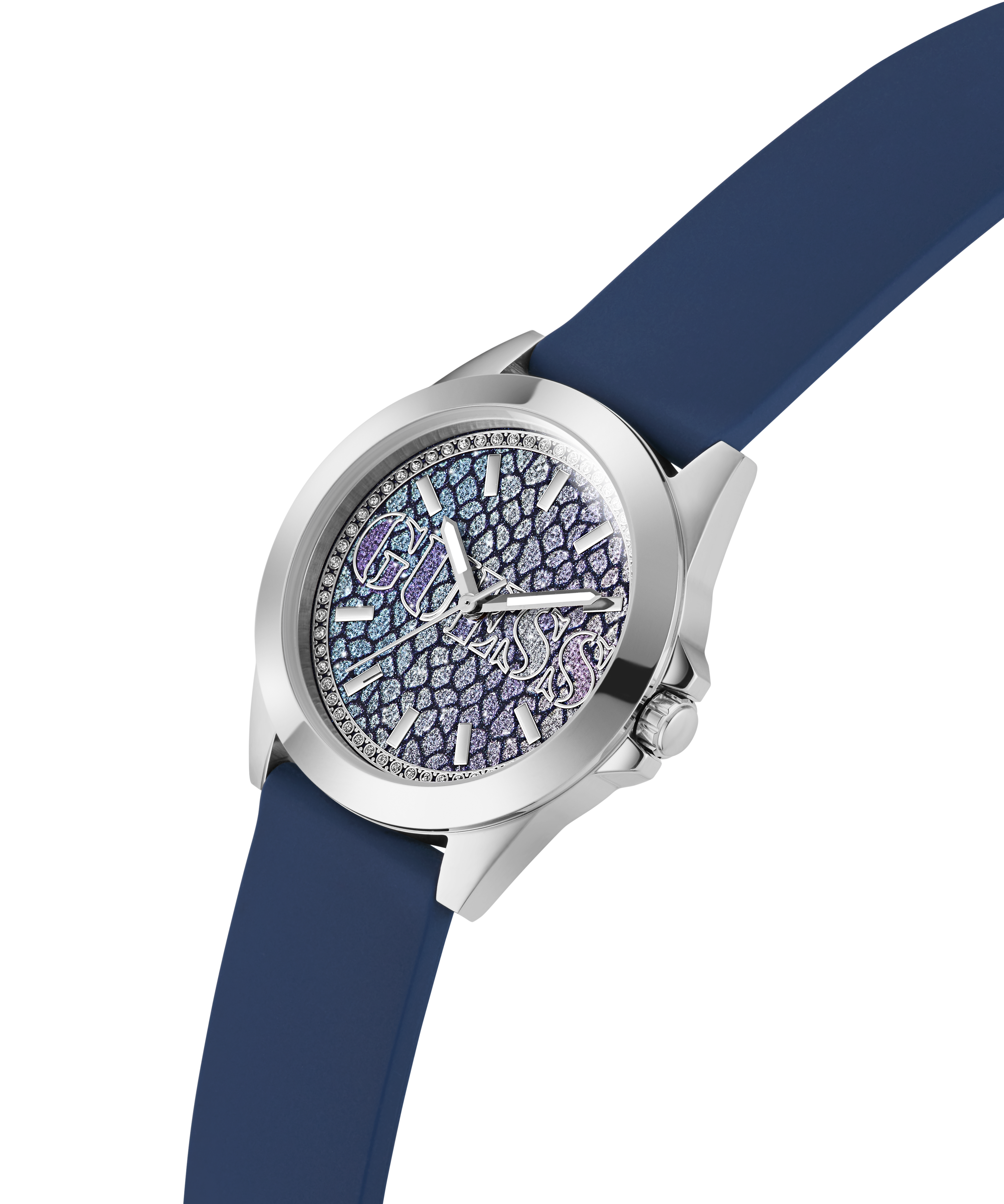 Enter a menagerie with this exotic look. Featuring a bold GUESS logo on the dial with a glitzed out digitally printed python pattern, this look is sure to pop in your watch wardrobe.