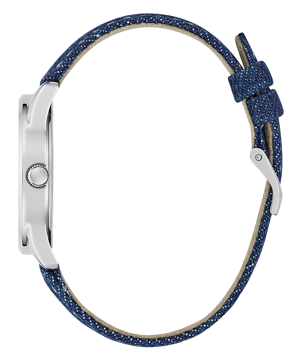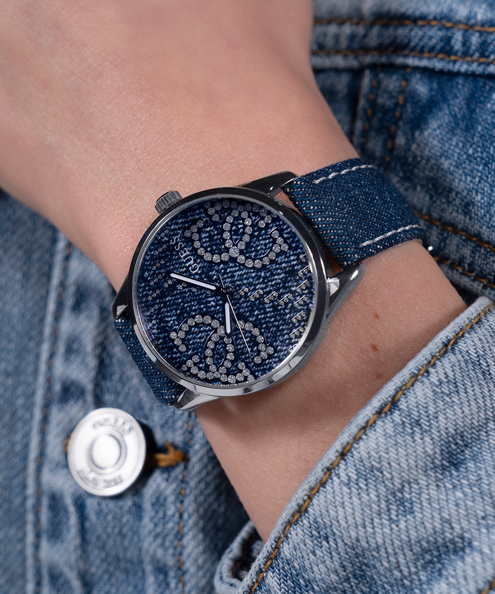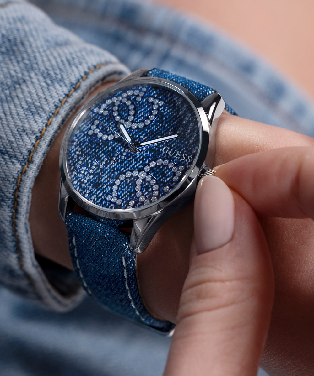 Go to the shopThis new look features a stitch pattern on the dial and the signature GUESS Quattro 'G' logo paired with a blue denim strap