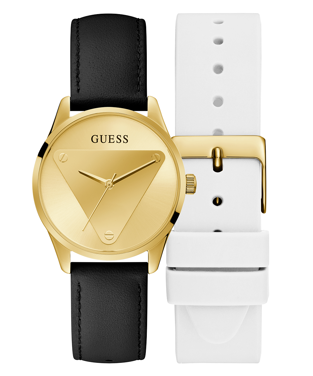 The GUESS iconic triangle logo is tranlated into a sleek plaque as the centerpiece of this style and is paired with smooth ethically sourced leather that is backed by ultra-suede and features an interchangeable silicone strap.