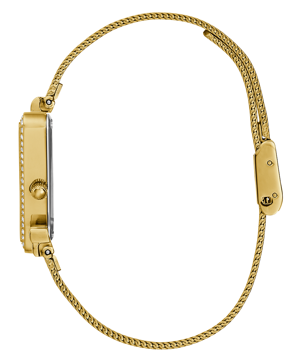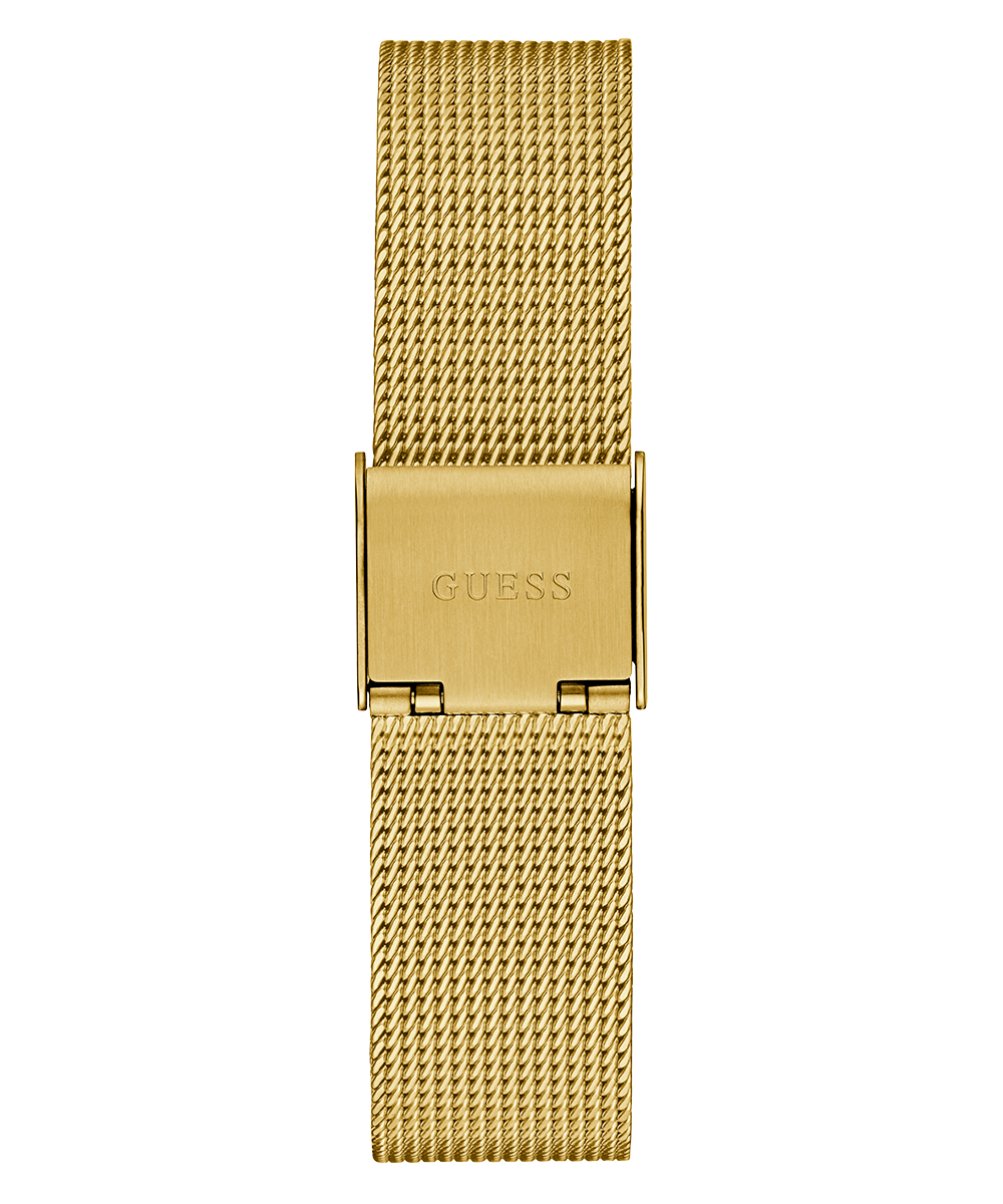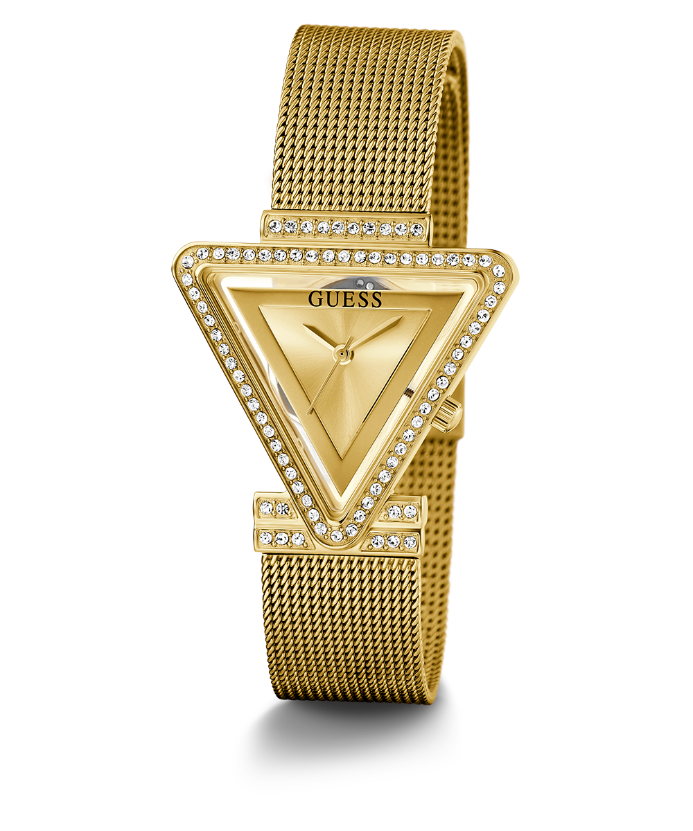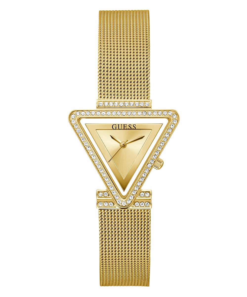 This alluring case design of the GUESS triangle logo has a fully glitz look with tonal dial and sleek self-adjustable mesh bracelet.