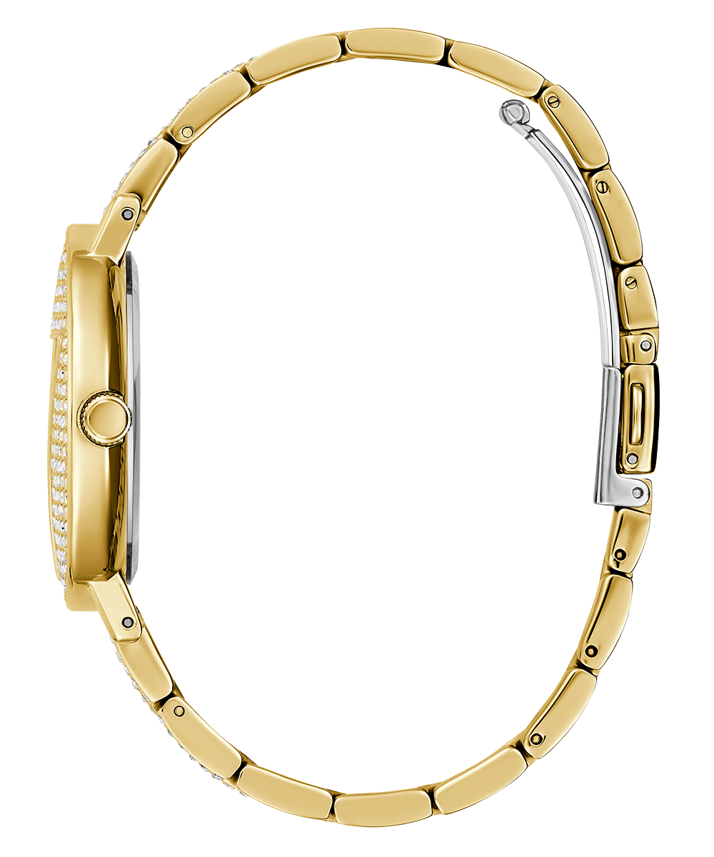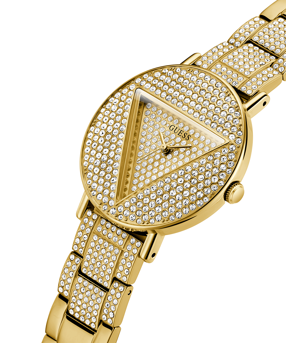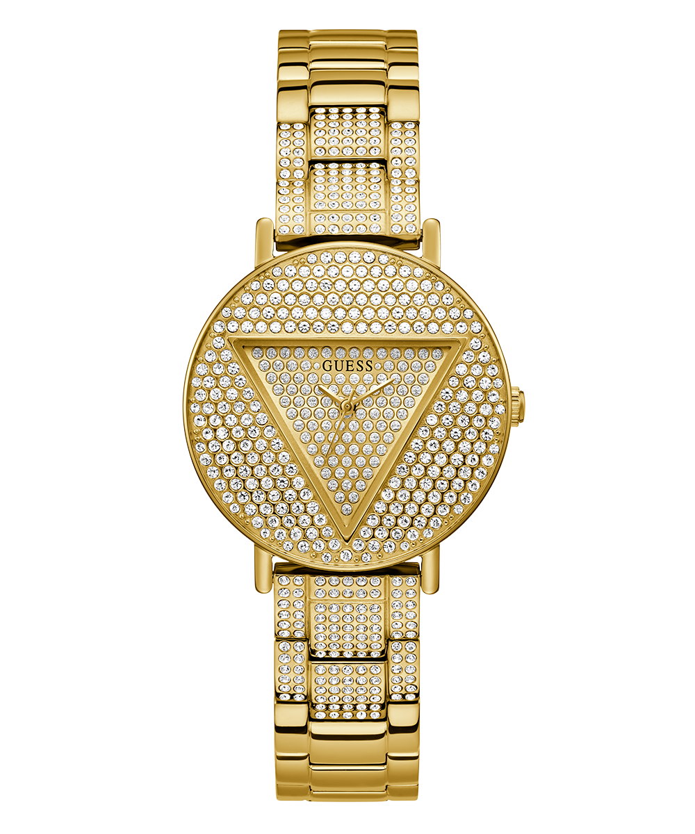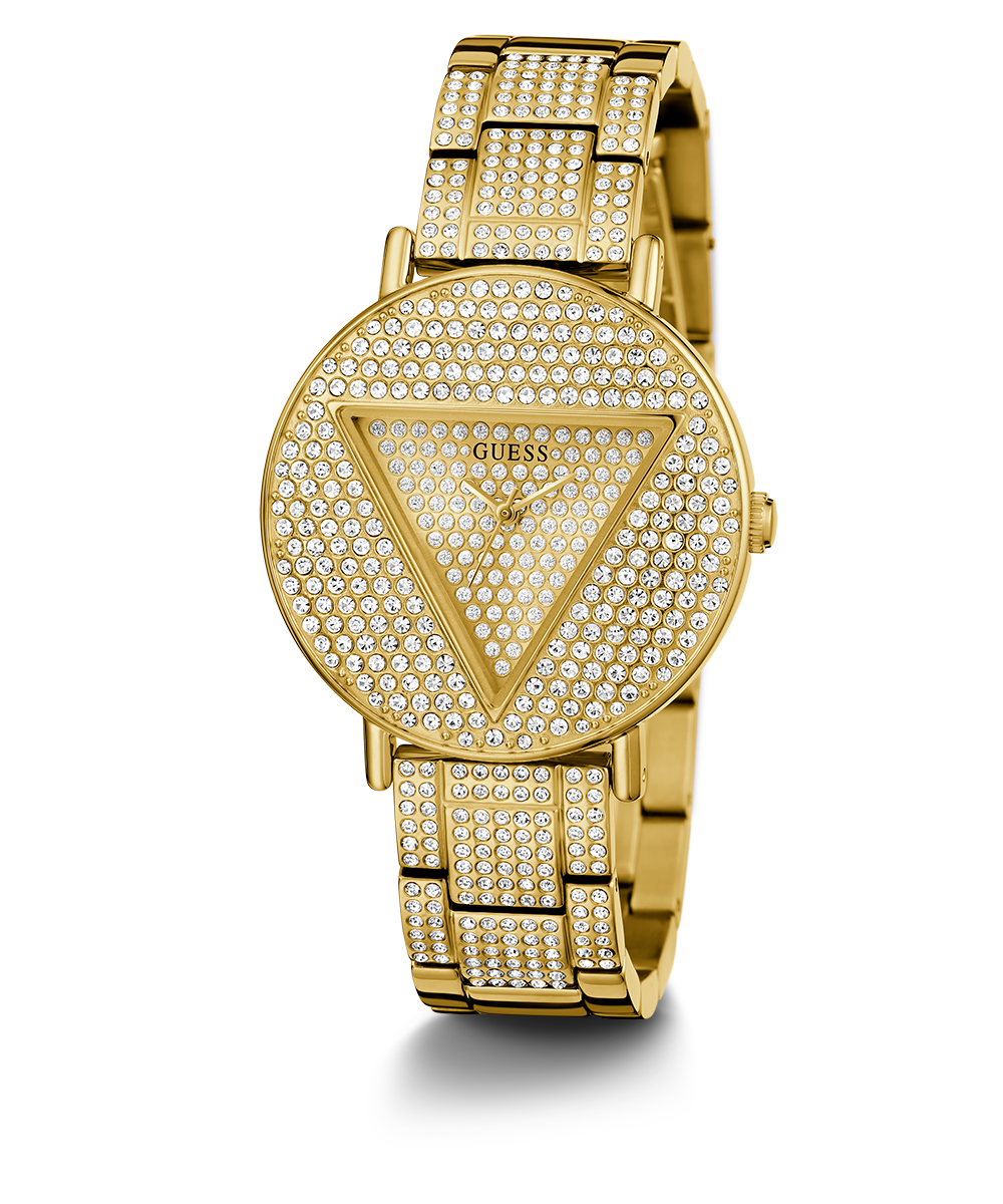 Iconic in everyway, this dazzling style has a triangle dial inset with full glitz and is paired with a sleek partially glitzed bracelet